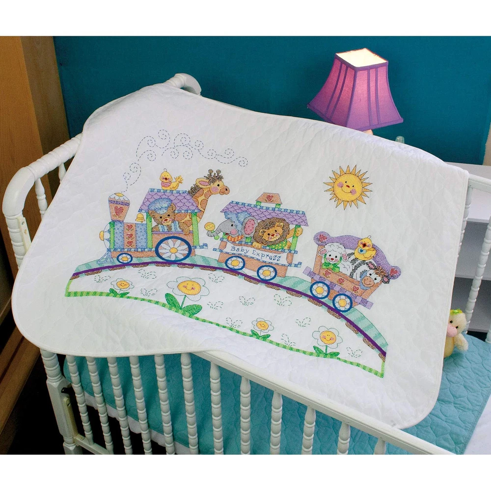 Stitch an adorable and unique baby gift with the Dimensions Stamped Cross Stitch Baby Express DIY Baby Quilt Kit! This whimsical baby blanket features a colorful train full of happy, smiling animals and makes a great addition to any animal themed nursery. Includes cotton embroidery thread, stitching needle, and stamped poly/cotton baby blanket. Baby Express cross stitch quilt kit includes cotton embroidery thread, stitching needle, and stamped poly/cotton baby blanket. Baby Express poly/cotton baby quilt measures 34'' x 43''. A unique gift for new parents, this whimsical stamped cross stitch baby blanket kit creates a colorful keepsake or animal themed nursery decoration! Follow along with the cross stitch pattern printed in wash away ink on the blanket to create the adorable design on this cute baby gift! This adorable baby blanket features a colorful train full of happy, smiling animals!