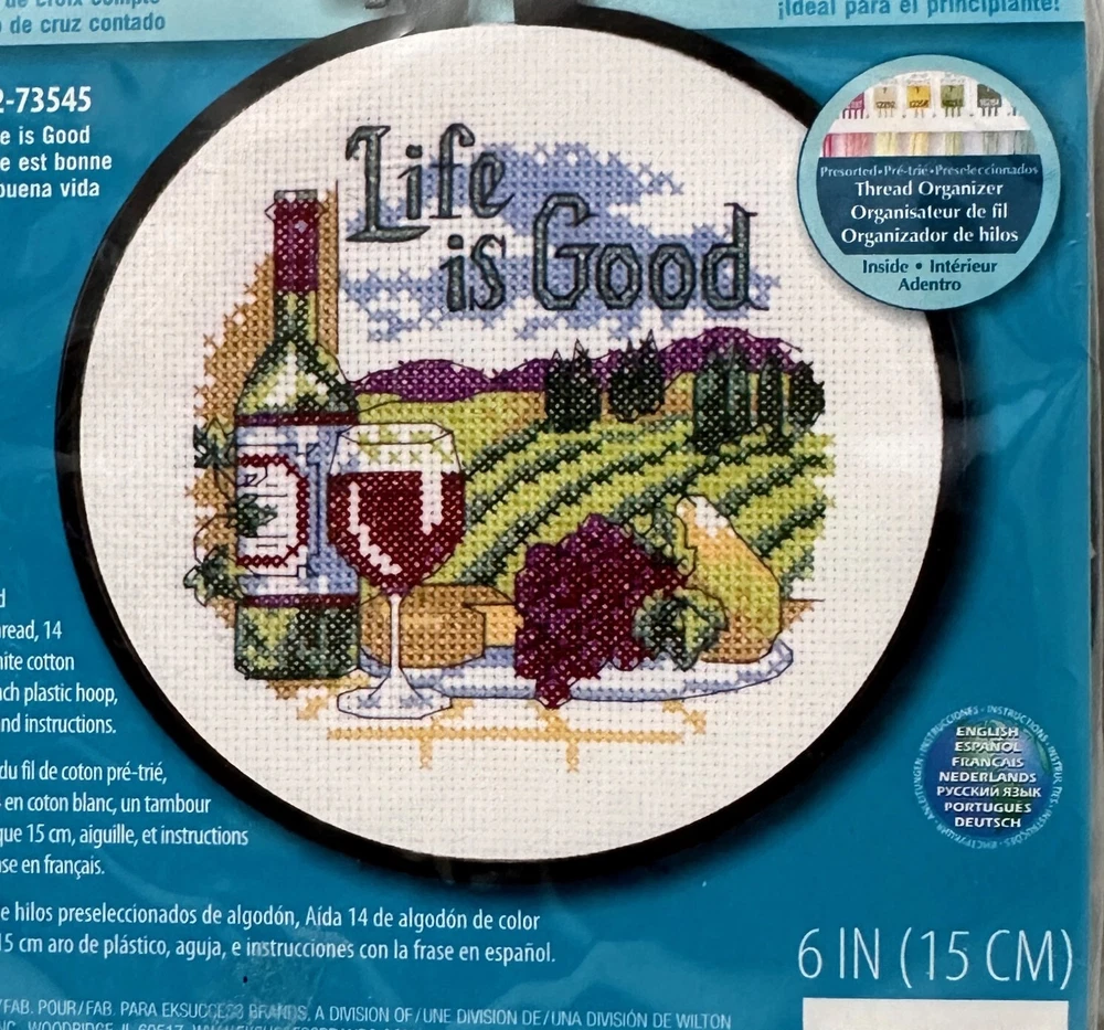 Cross Stitch Kit w/ 6" Round Frame "Life is Good", Dimensions Learn a Craft. New in Package.