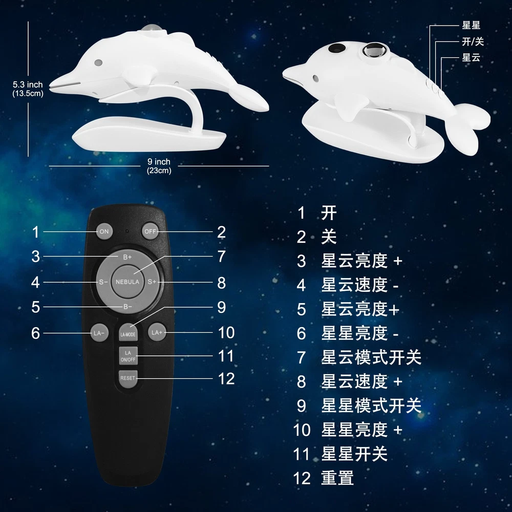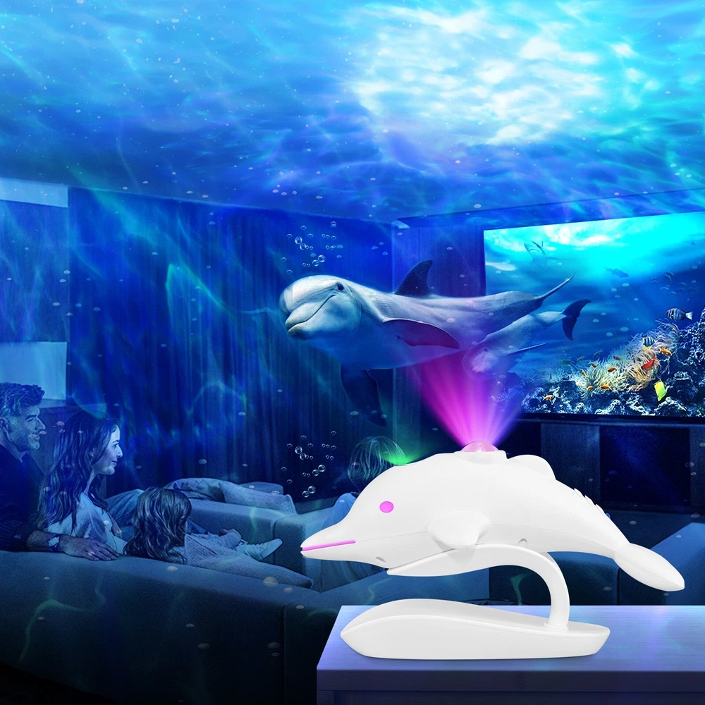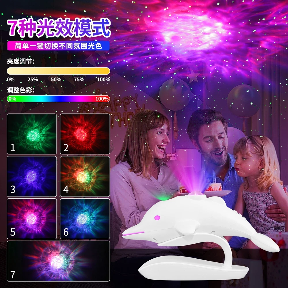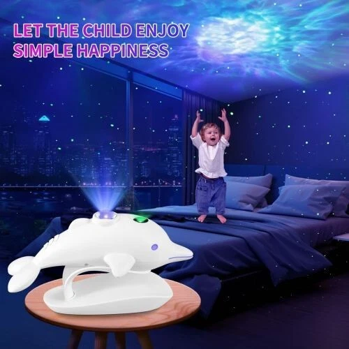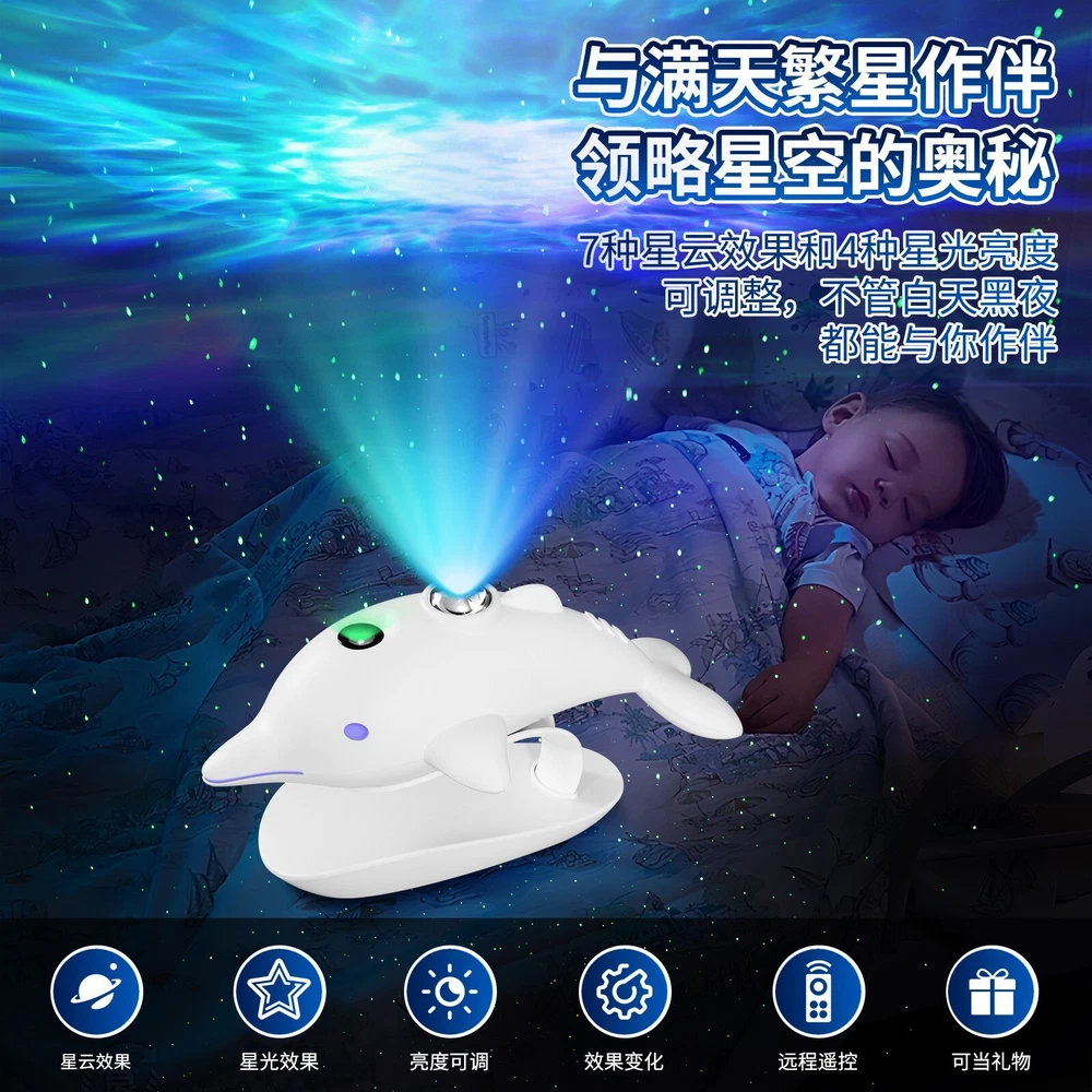 Cross-Border Bedroom Dolphin Colorful Starry Sky LED Laser Projection Lamp Description The Cross-Border Bedroom Dolphin Colorful Starry Sky LED Laser Projection Lamp is a captivating lighting piece that brings the beauty of the ocean and the stars together. Featuring a playful dolphin design, this projector lamp casts vibrant, colorful starry sky patterns across the walls and ceiling, creating a magical and serene atmosphere. The LED laser technology ensures sharp and dynamic projections, perfect for transforming a bedroom or any space into a tranquil, dreamy environment. Ideal for relaxation, sleep, or as a decorative feature, this lamp adds a touch of wonder and charm to any room, making it a perfect gift for children or anyone who loves ocean-inspired decor. Please message me if you have any questions.