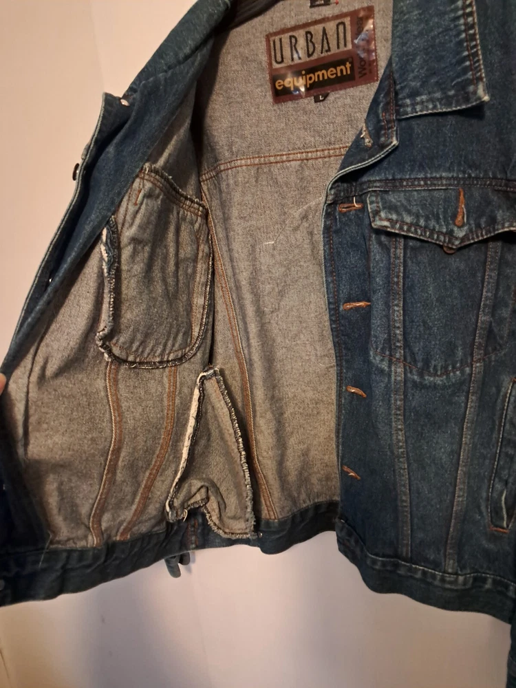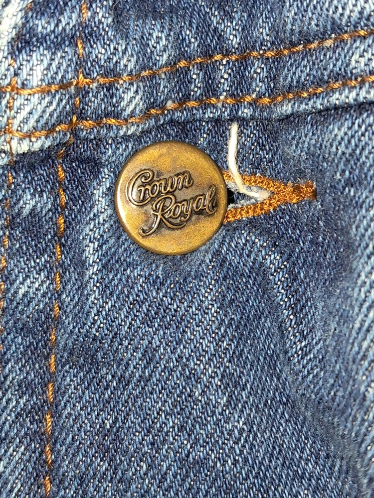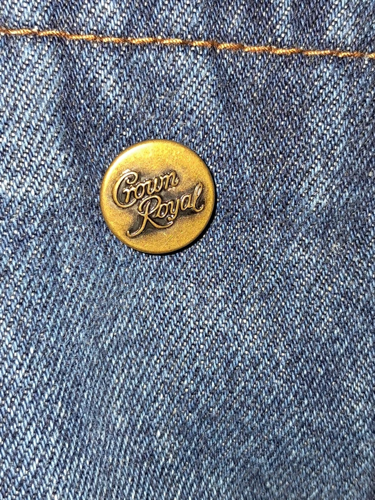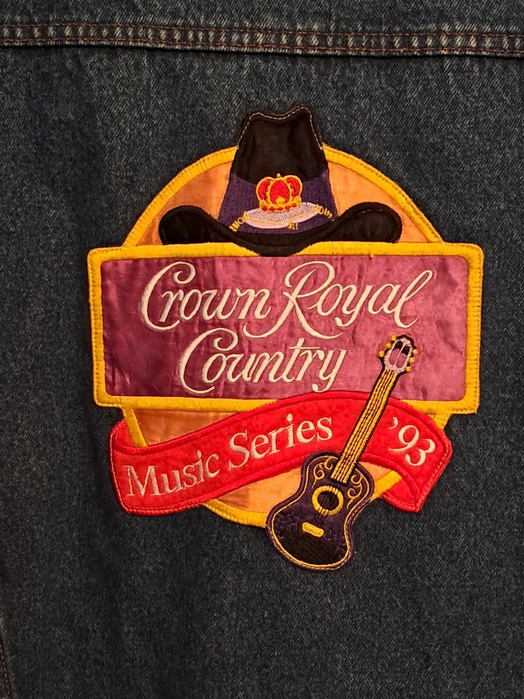 Crown Royal Jean Jacket Vintage 1993 Urban Equipment World Wear Size L This vintage 1993 Urban Equipment World Wear Royal Crown Colab Jean Jacket is a must-have for Crown Royal or music enthusiasts. The jacket features a denim outer shell material with a button closure and a colorful Crown Royal patch on the back. It is available in size . Patch says CROWN ROYAL COUNTY MUSIC SERIES 93 26" pit to pit 24" shoulder to hem 14 Crown Royal rivit buttons 2 breast pockets and 2 denim slash side pockets