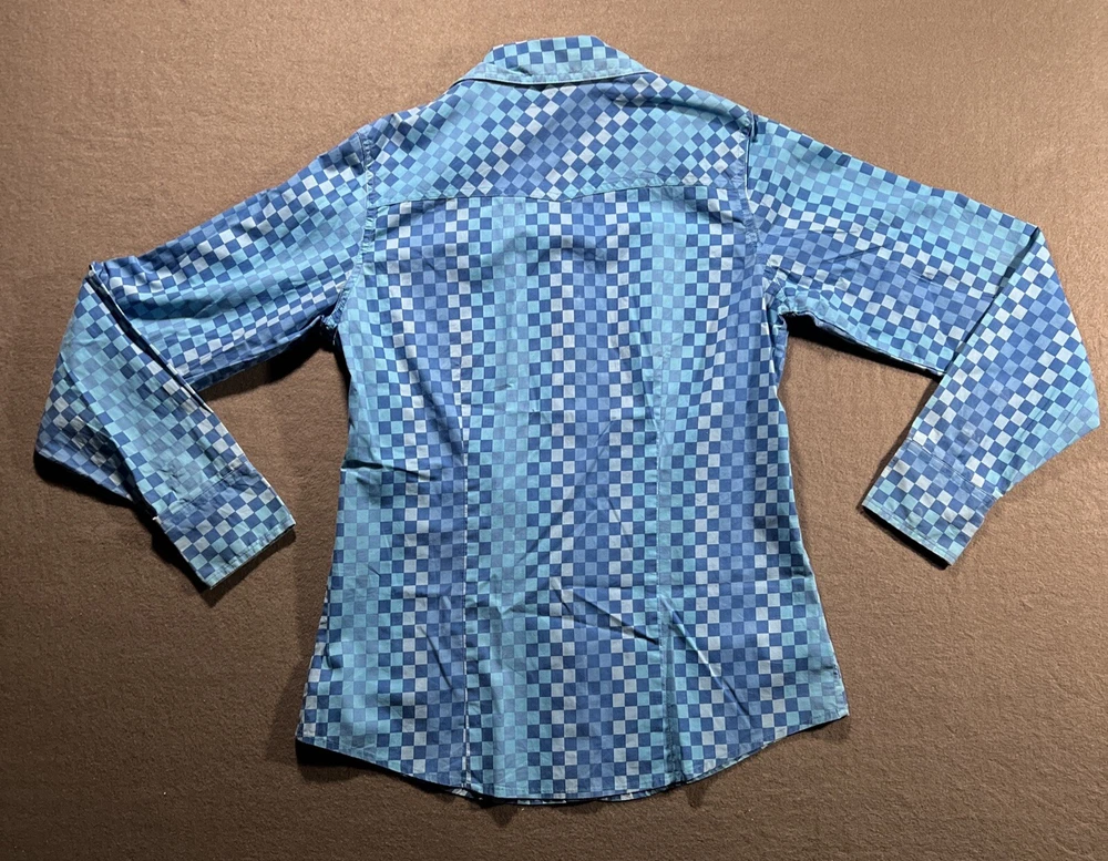 *Please review all photos closely before purchasing due to shirt having mild signs of use and wear and right back sleeve having several faint color fade areas from washing/use to prevent return.* Elevate your wardrobe with this stunning Cruel Girl shirt in a beautiful shade of blue. The shirt features a collared neckline with plaid pattern and pearl snap closure, perfect for any occasion from casual to formal. Made of 100% cotton, this shirt is machine washable and has a regular fit. The long sleeve shirt has a woven fabric type and comes in a women's size medium. It has accents of the brand's logo and features a slimming, easy care, lightweight, stretch, and all-season design. It also has pockets and is wrinkle-resistant, making it the perfect travel companion. This shirt is suitable for any season, whether it's winter, summer, fall, or spring. Add this elegant and bohemian shirt to your collection today! Rodeo Horse Back Riding Cowgirl Ranch Rancher Farm Farmer Barrel Racing Pole Bending Church Wear Dress Up Pearl Snap Shirt Collection Country Western Wear Checkered Plaid