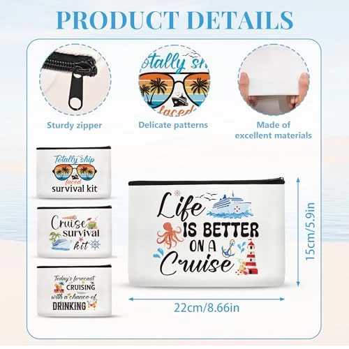 30 Days Return Policy Fast Delivery Trusted seller Cruise Makeup Bag Gifts - 4Pcs Cruise Ship Essentials Cruise Survival Kit Bags Cruise Cosmetic Bag for Women Girl Best Friend Travel Beach Accessories Product Description Cruise Essentials - Our Cruise Survival Kit makeup bag includes 4pcs of accessory organizers, each featuring a unique cruise-themed design. These portable, cute, and fun travel makeup bags are perfect for women embarking on a cruise or celebrating a bachelorette party during summer vacation. Canvas Material - Made from premium canvas with double-sided printing, our cosmetic bags are stylish and vibrant. They're ideal for travelers who value both quality and fashion. Perfect Size for Daily Use - These Zipper Pouch cosmetic bags measure approximately 22*15cm (8.7X5.9 inches), ideal for carrying toiletries, cosmetics, shampoo, cell phones, shaving kits, coins, and other essentials. Compact and easy to fit into purses, suitcases, backpacks, and more. Great Appreciation Gift - These versatile makeup bags can also be used as beach bags, watercolor pen pouches, toiletry kits, or cosmetic tool organizers. They make thoughtful gifts for girls, sisters, friends, cruise enthusiasts, or wedding party members. Cruise Ship Vibes - From "Cruise Survival Kit" to "Life Is Better On A Cruise," our makeup bags capture the excitement and relaxation of a cruise adventure. Shipping Returns Payment Shipping Shipping is FREE to all addresses other than APO/PO boxes in the lower 48 states. All our stock ships from US-based warehouses. Shipped via USPS or UPS (depending on location and package weight) Unless stated otherwise, all orders will ship within 24-72 hours of your payment being processed. Check our feedback to see the great reviews of FAST shipping we offer. Returns As our valued customer, we will do our best to make sure the product you receive arrives to you on time and as expected. If you are not satisfied with your purchase, please contact us within 30 days of receiving your order to process a return. Payment We currently accept payment via eBay managed payments only. Once payment is cleared, we will dispatch your shipment within 1-3 business days. Please refer to the "Shipping" tab for more information regarding shipping speed to your destination.