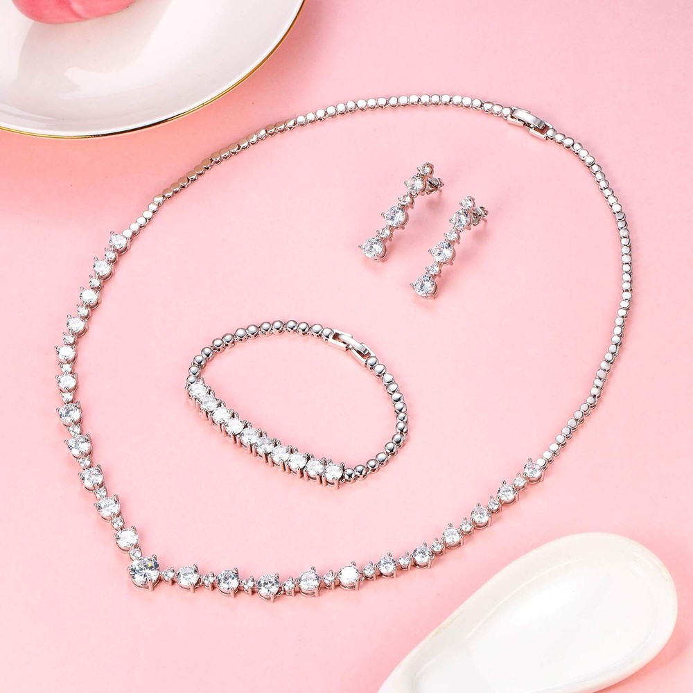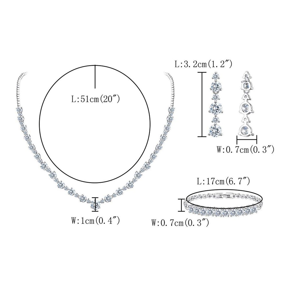 Crysdue Women Wedding Jewelry Set for Brides Bridesmaid, Cubic Zirconia Round Cut Circle Necklace Bracelet Dangle Earrings for Wedding Party Prom Product Details Color: Clear Brand: Crysdue MPN: 21000184-1 UPC: Does not apply EAN: Does not apply Department : womens Date First Available : August 10, 2021 Manufacturer : Crysdue Brand, Seller, or Collection Name: Crysdue Metal stamp: Not stamped Metal: Brass Material: Brass Gem Type: Cubic Zirconia Setting: Prong Setting Clasp: Lobster Clasp Number of stones: 51 Model number: 21000184-1 Crysdue ❤Inspiration Crysdue devoted to design and produce the most suitable jewelry for you; we select the quality of raw materials, create fashionable accessories. We will pay more attention to the comfort and safety of wearing the product, while pursue innovation. We have always insisted on choosing materials that are harmless to the human body. Give you a comfortable wearing experience.Our Women Jewelry Set was made of High Quality Cubic Zirconia, silver and gold plated, which ensures the polished surface is high sparkle and shine. Also Cubic Zirconia is well known as a substitute for diamond, due to its high hardness and great fire.
