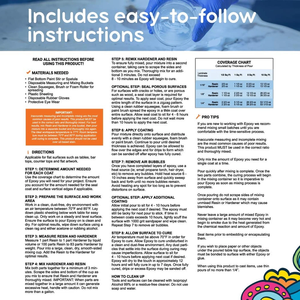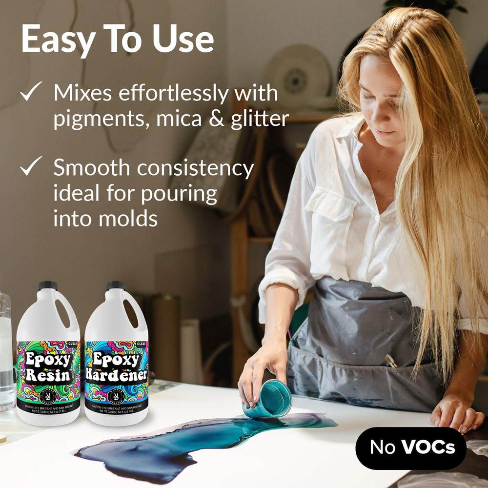 Our premium crystal clear, easy pour tabletop epoxy resin kit in 16oz, Half Gallon or Gallon Size is durable, glossy and completely clear making it perfect for all your casting and coating projects. Half Epoxy Resin and Half Hardener to make the total amount of what the kit is called of workable resin epoxy. It can be used to mix with paints and mica powders, to create jewelry, as bar top epoxy resin , table top epoxy resin , woodworking epoxy , for covering art work and doing encapsulations. It also works great as clear epoxy resin for bar tops, table tops and more. It is UV resistant and durable ensuring your projects look great for years to come. We proudly stand behind the quality of all our products! We are a family owned small business committed to making premium quality crafting products. MADE IN USA PERFECT FOR TUMBLERS, JEWELRY, TABLETOPS & MORE: Our epoxy resin crystal clear kit comes with two parts, 1/2 Gallon epoxy & 1/2 Gallon hardener. A gloss finish is perfect for casting, molded jewelry, artwork or mix with pigments & mica powders. CRYSTAL CLEAR W/ A GLASS FINISH: Our resin is completely clear and creates beautiful epoxy art, table tops & more. It finishes smooth, crystal clear and rock hard making it an ideal epoxy resin for canvas, countertops, silicone molds & wood crafts. UV RESISTANT & VOC FREE: Our formula is UV resistant making it ideal for artwork, resin molds, tumblers and table tops. Work safely knowing our resin is VOC free. Pour like liquid in your coaster molds, ashtray, or over your tumbler or painting. MADE IN USA & EXCEPTIONAL QUALITY: Our bulk epoxy resin gallon kit bundle is made here, in the USA, so you can be sure of top quality marine grade & super safe standards and a support team for your projects as adult artists or starter beginners. WHY CHOOSE : We are a family owned American small business committed to producing amazing professional grade art supplies & accessories made to strict standards. We pride ourselves on exceptional customer service and are here to help!