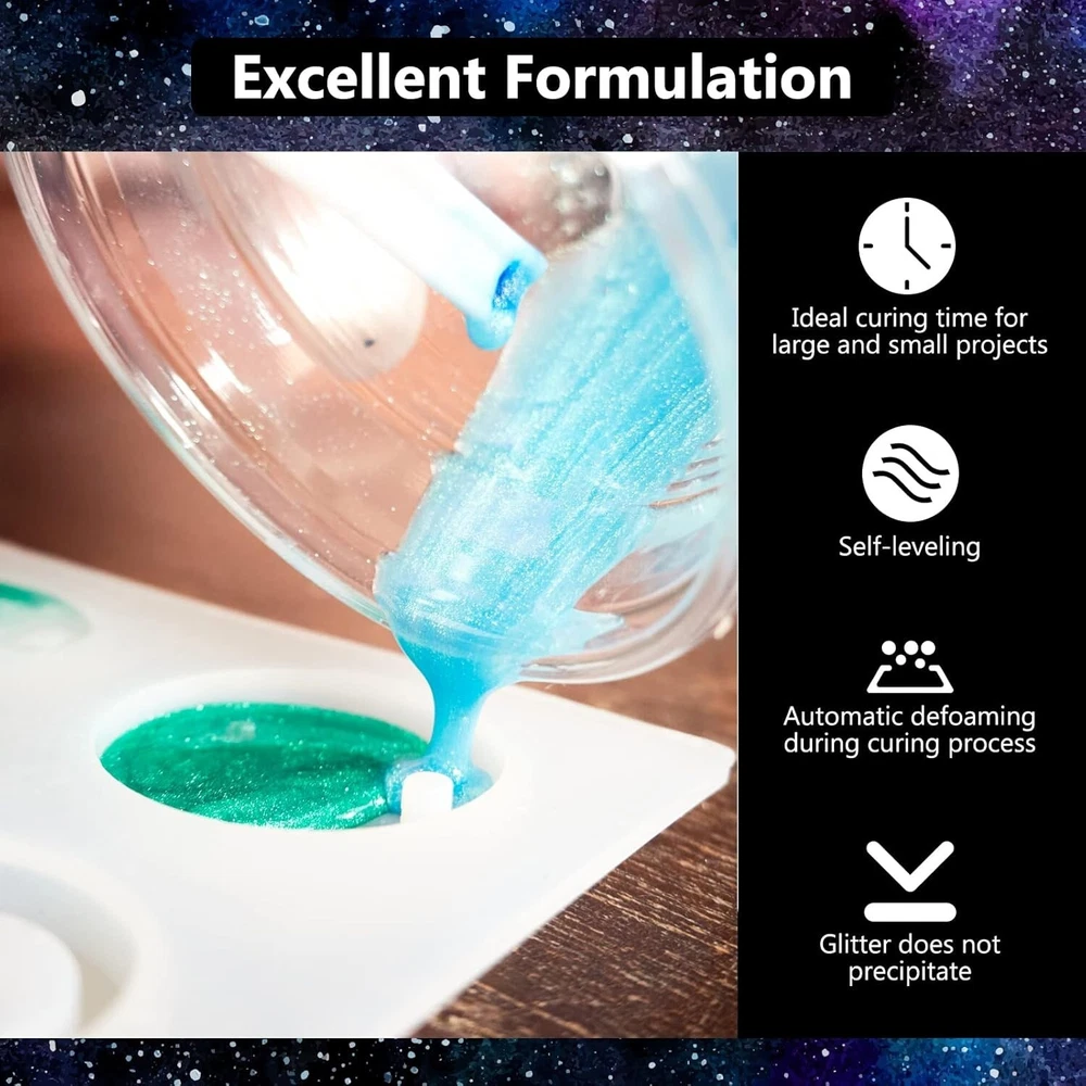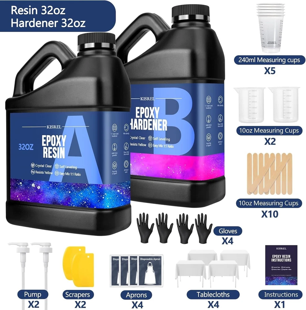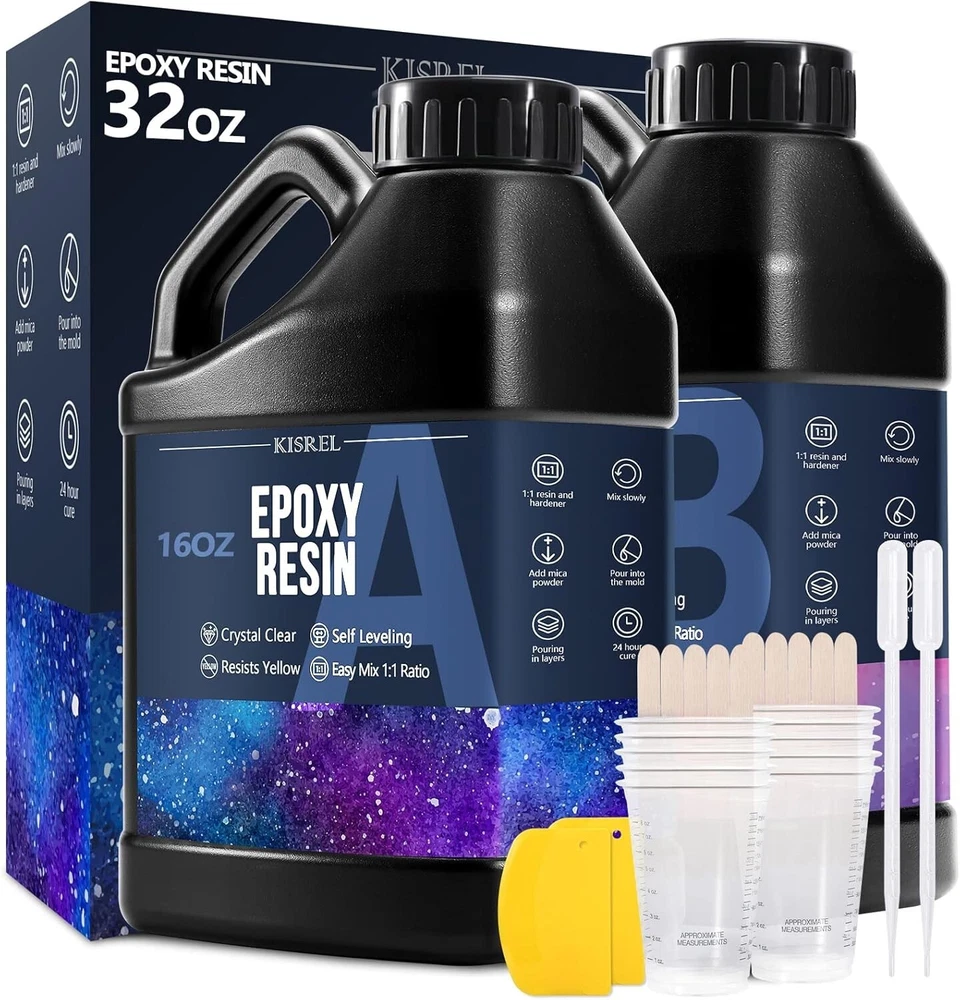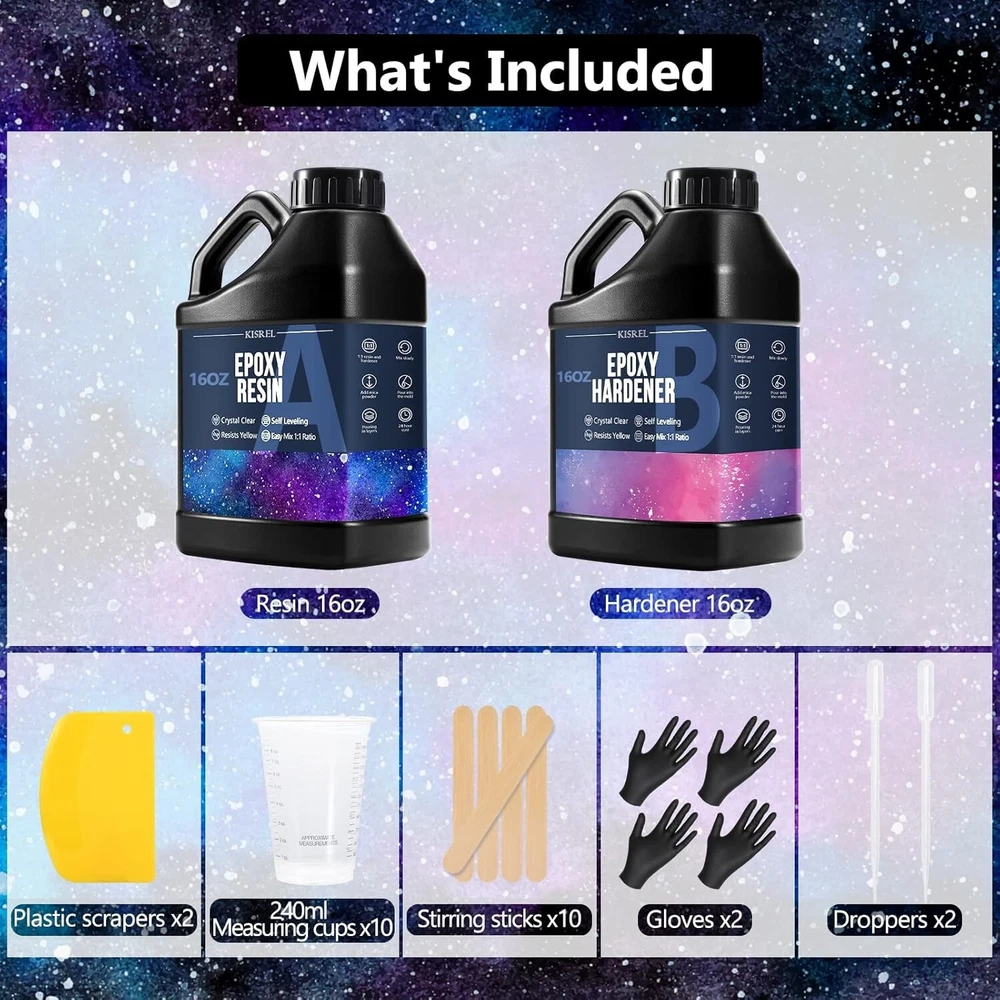 【Perfect Epoxy Resin Kit】:Includes 16OZ clear resin, 16OZ clear hardener, 10 x 240ml measuring cups, 2 x plastic spatulas, 10 x wooden stirring sticks, 2 x gloves, 2 x droppers. Everything you need to start your project is included, perfect for experienced people and beginners. 【High Quality Resin Epoxy】:Crystal clear, easy to mix, less bubbles and self defoaming self-leveling function, safe and non-toxic, filler does not settle after mixing, easy to complete perfect works without worry. 【Perfect Works】:Glossy surface after the table top epoxy resin is cured, perfect texture, no yellowing and high temperature resistance, wear-resistant and durable, ideal for projects such as desktop coating. 【Easy to Use】:Epoxy resin 1:1 easy to mix, 8 hours drying 24 hours curing, resin heat dissipation temperature is not high will not damage the mold, easy to use very suitable. 【Wide Range of Applications】:Ideal for casting, coating, artwork, suitable for coasters, countertops, crafts, jewelry making, painting, molds, woodwork, etc. Create your great works.