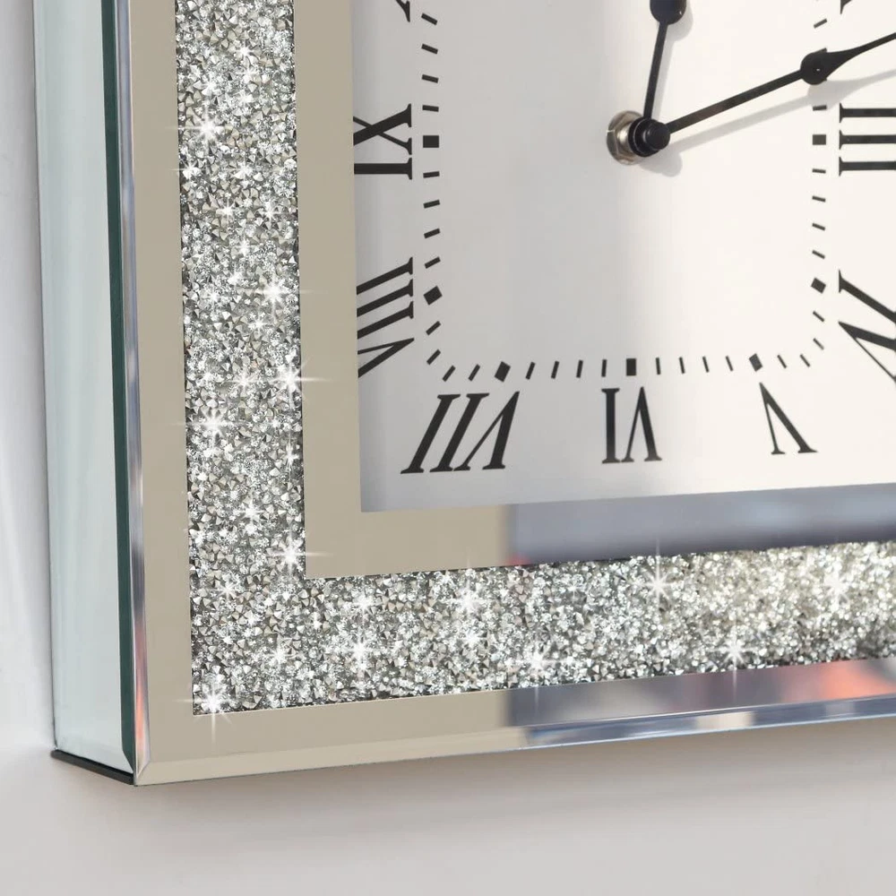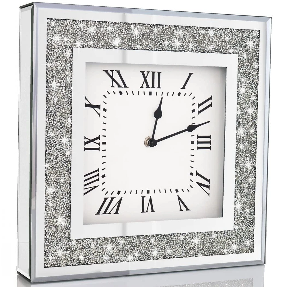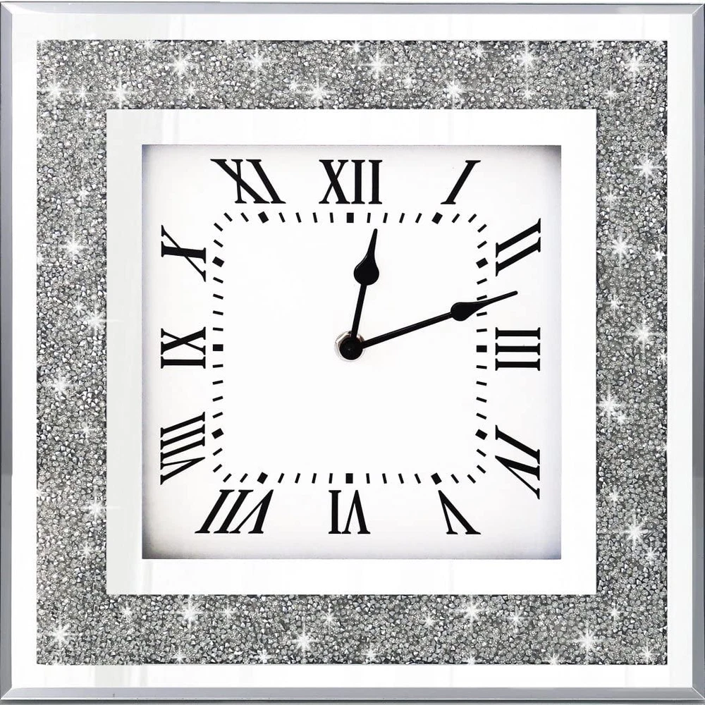 Crushed Diamond Mirror Wall Clock size: 12x12x2inches. Use AA Battery (For safety reason, Battery is not included in package). Clock Material: front surface all covered by silver mirror and glass, excellent bevel craft. Crush diamond for decoration. Quartz Clock. Upgrade Clock Mechanism: is the key point for accurate time, pointer silent movement help people sleep peaceful and comfortable. Gorgeous crystal crush diamond with mirror frame, simple clear Roman numbers dial, black metal pointer, comfortable and easy to read time. Europe top grade design in exquisite craft: crush diamond big mirror clock will add sparkle twinkle bling live element to you home. Fashion beautiful elegance gorgeous, impress everyone. Well decorate home, office, living room, bedroom, restaurant, dining room and other place. Install Instruction: Back with 2 hangers, easy for wall hang. Clock need one piece of AA battery, for safety reason, battery is not included in the package.