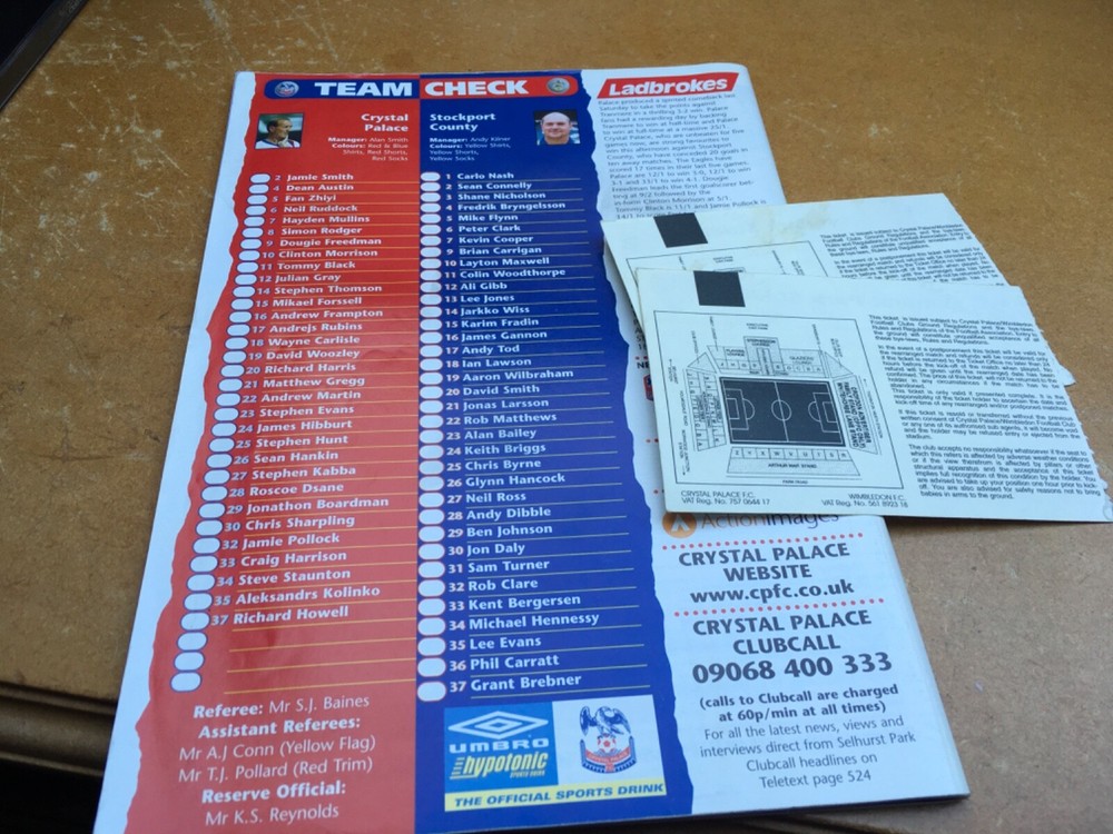 Programme and ticket s from the match between Crystal Palace and Stockport County at Selhurst, 25th November 2000. I have several other tickets and programmes available , please see my other listings. Happy to combine postage. Any questions please ask