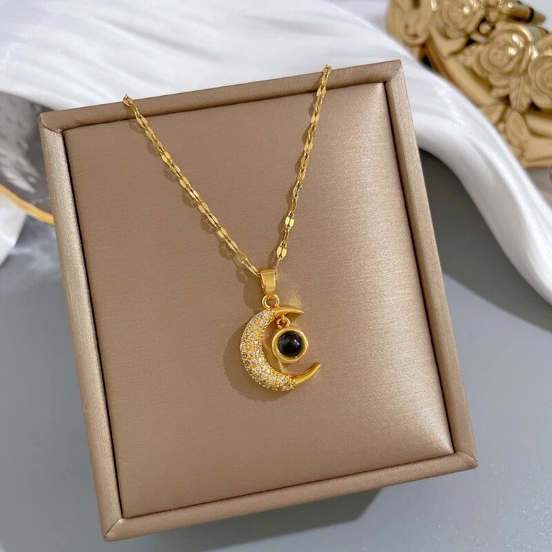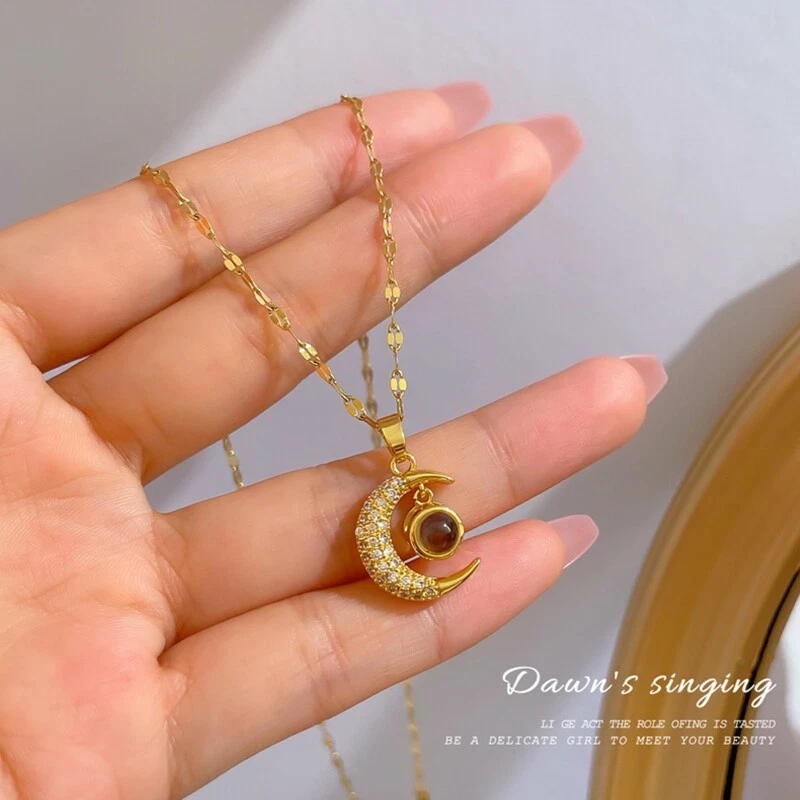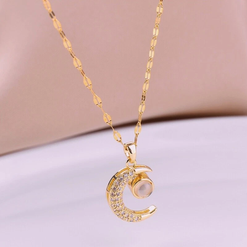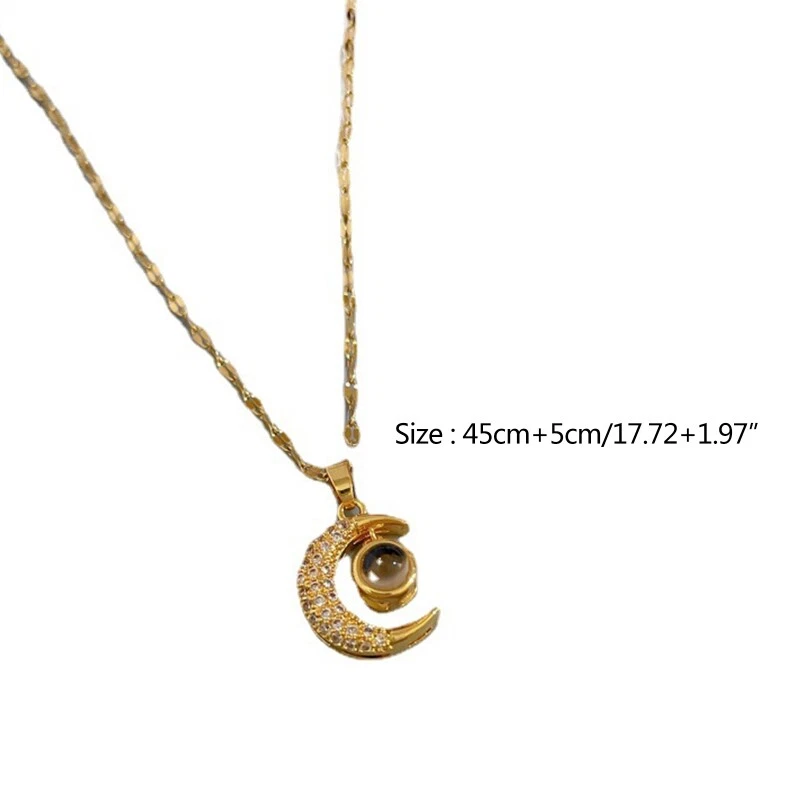 Crystal Zircon Moon 100 Languages I Love You Necklace Stainless Steel Clavicle and high Features: I Love You Necklace: "I Love You" 100 Languages Moon Projection Necklace, for Time will take away a lot of things, but it will never take away love for you. moon means having a bright future, when you realize you want to spend the rest of your life with somebody. You the rest of your life will never end, and you want to be with her for a long for time. ‘You me~’ It is a super surprise for your lover. Designed for love: the crystal pendant necklace is designed with loving message that is [I love you] written in 100 different languages, which is easy to display with your cellphone, romantic and sweet way to show your love. Product size: the projection pendant necklace measures approx. 17.72+1.97 inches long, with 2 inches long extension chain for you to adjust the tightness, suitable for most women and girls. High stainless steel lip chain and alloy inlaid zircon and projection beads, anti-allergy. Blessing necklace full of bright future. Show your love: love you necklace in 100 different languages is a delicate and meaningful your lover, intimate mom, sisters, family members or other people on birthday, New Year, anniversary, Valentine's Day and other important days, which will leave deep for impression. Necklace only,other accessories in the picture is not included. Specification: Stainless steel lip chain + alloy inlaid zircon + projection beads Necklace Length: app.45+5cm/17.72+1.97in Color: Golden Quantity: 1 Pc Note: No retail package. Please allow 0-1cm error due to manual measurement. pls make sure you do not mind before you bid. Due to the difference between different monitors, the picture may not reflect the actual color of the item. Thank you! Package Contents: 1 x Necklace
