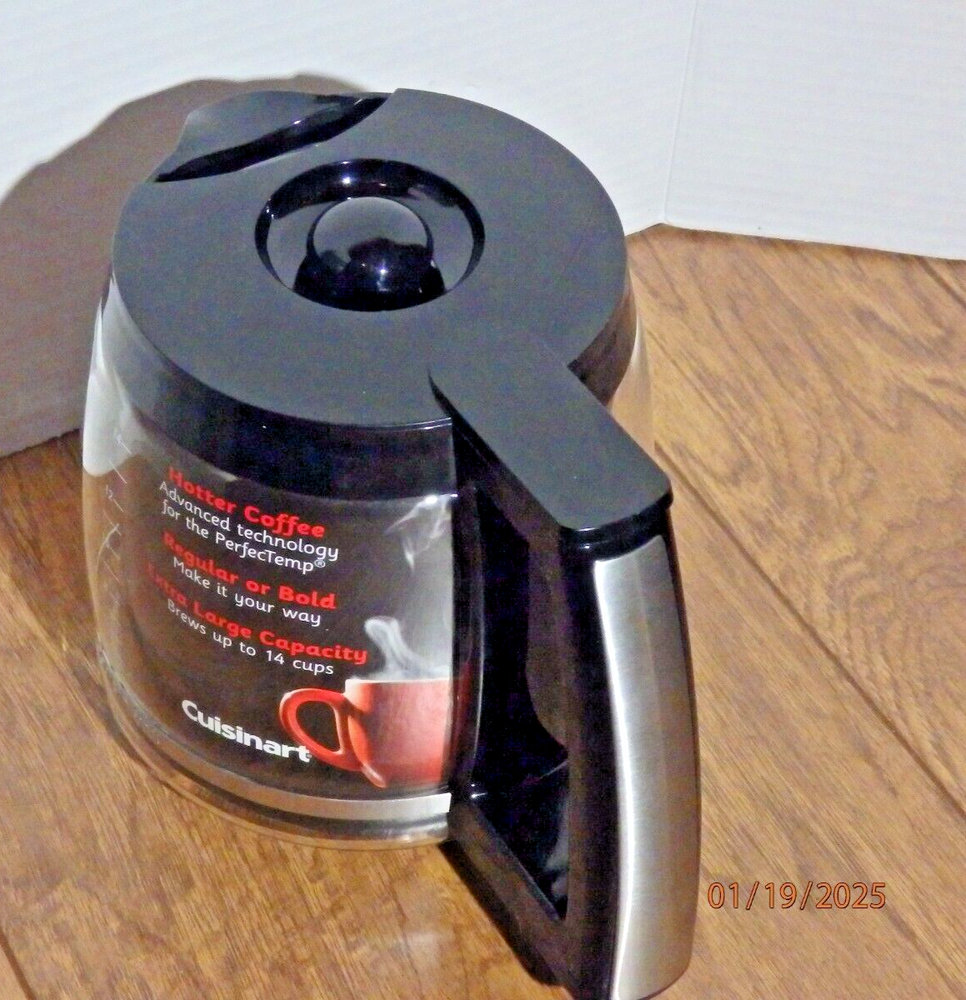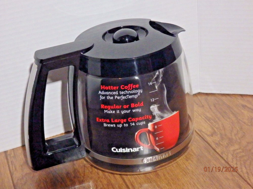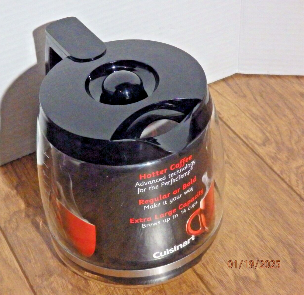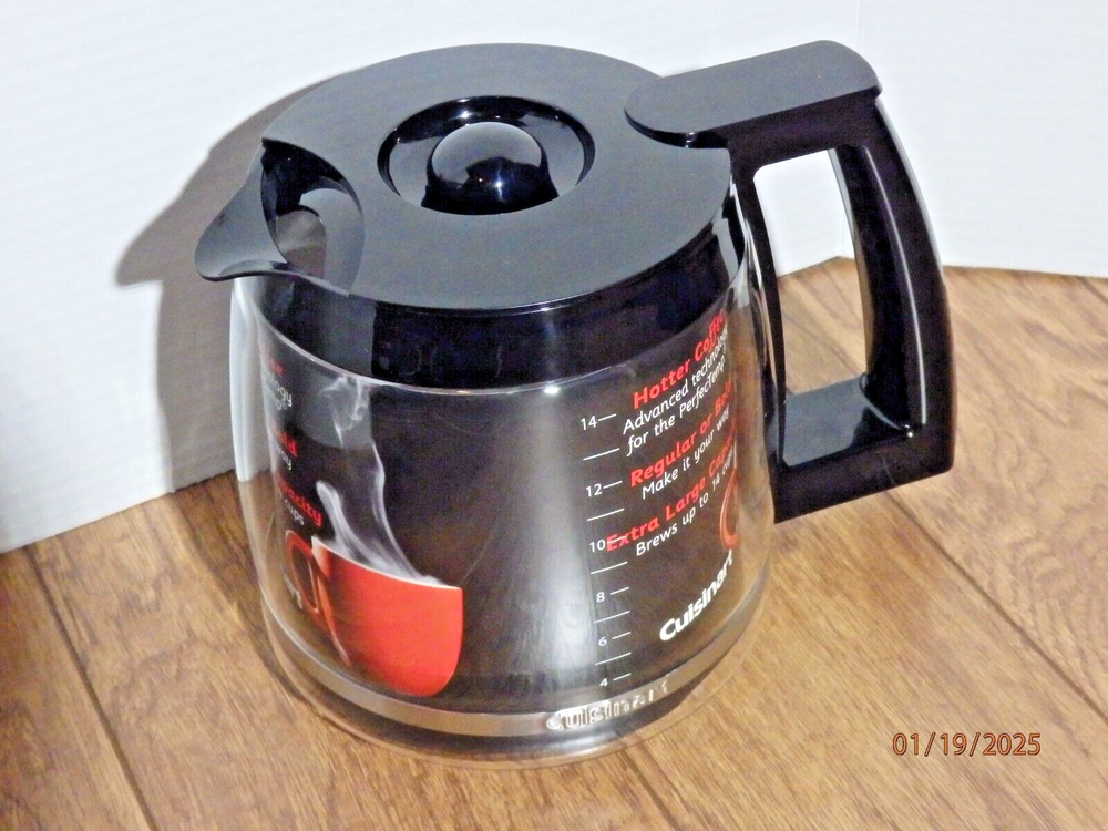 The Cuisinart Coffee Pot Replacement Glass Carafe is designed to hold 14 cups of coffee and comes with a black lid. It is compatible with Cuisinart coffee makers and is a genuine Cuisinart product. The carafe is brand new and does not come in its original packaging. This replacement carafe is perfect for those in need of a new glass carafe for their Cuisinart coffee maker, ensuring they can continue to enjoy freshly brewed coffee at home. The item is in new condition as pictured. I offer fast shipping with prompt payment. Please check out my page for other great items and collectibles!!