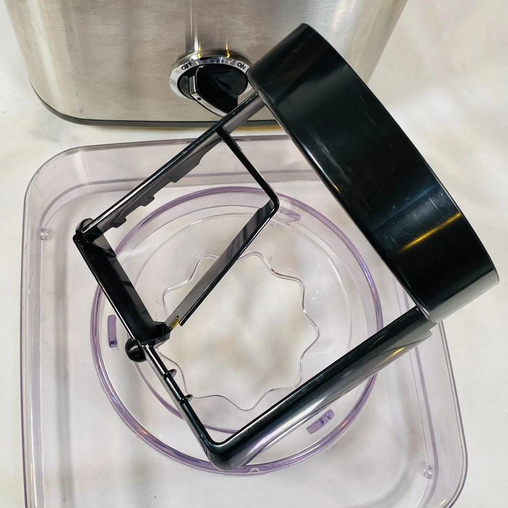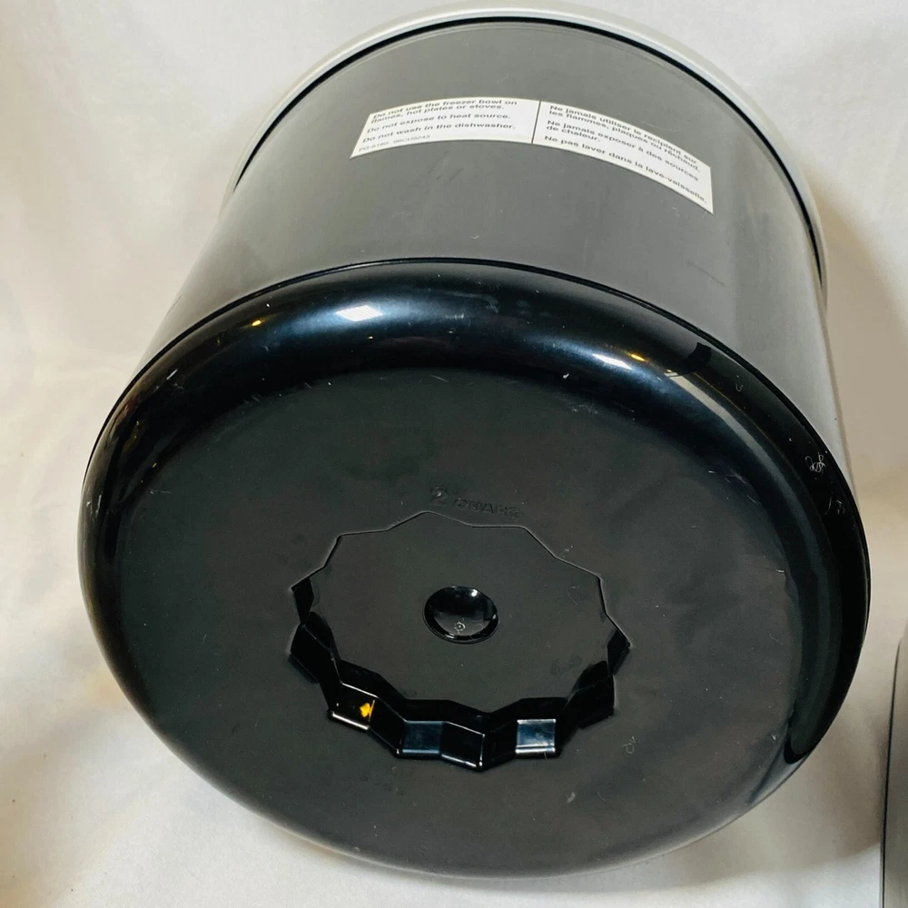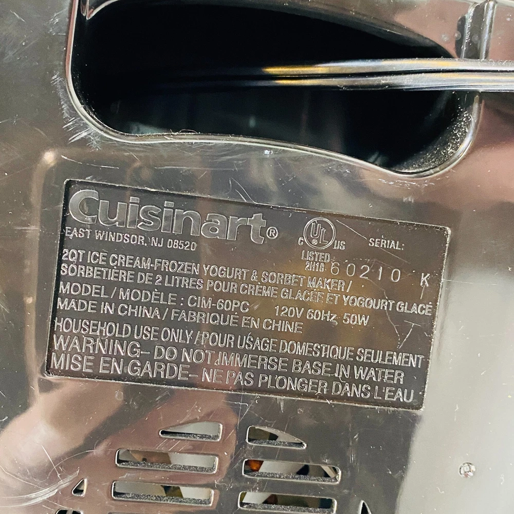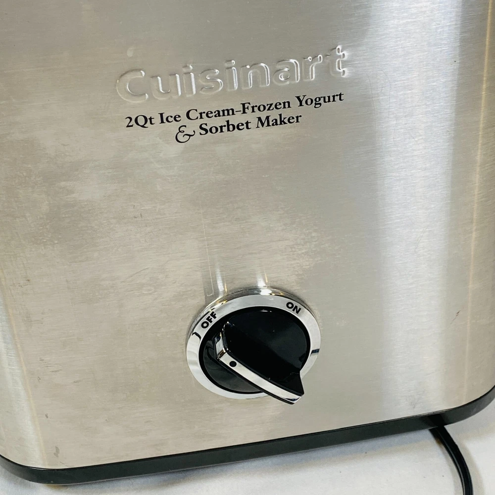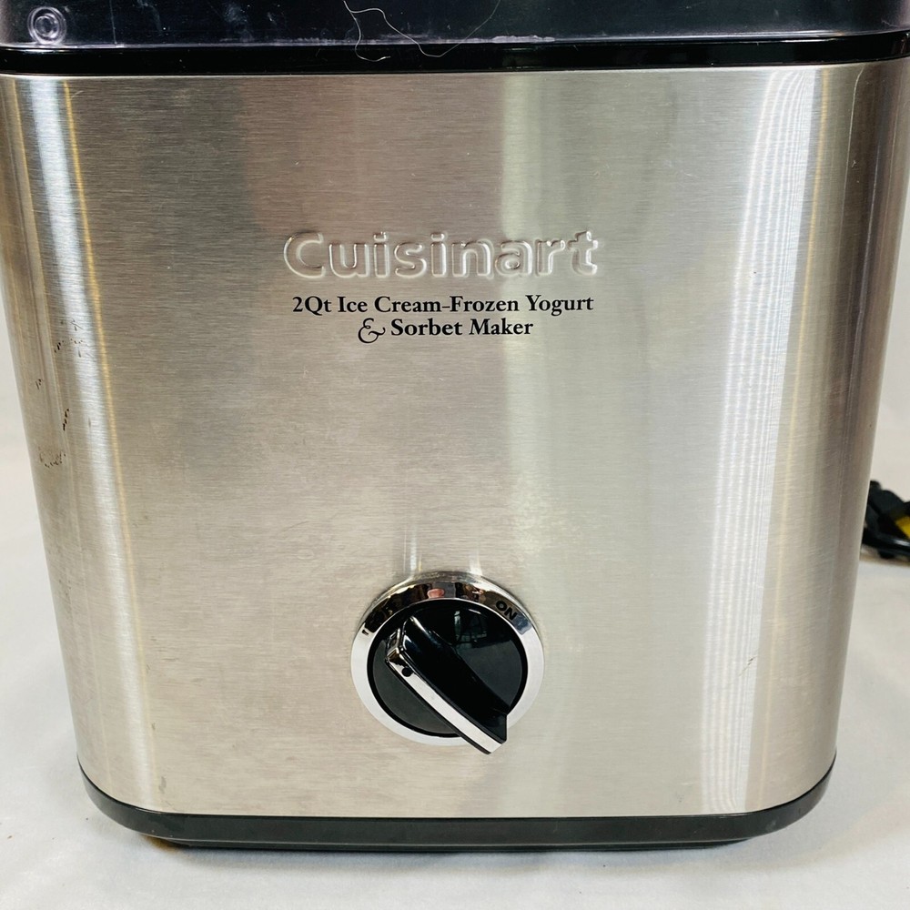 Cuisinart 2 Quart Ice Cream, Frozen Yogurt, & Sorbet Maker. Model CIM-60PC. Complete Machine: Black/Silver Motor Base, Double-Insulated Bowl, Mixing/Churning Paddle, and Clear Lid w/ Large Ingredient Spout. Fully-automatic electric ice cream maker, easy to use and makes the best desserts! Tested and works perfectly, in excellent condition. Minor scratches/scuffs and such to the exterior, nothing significant. Nothing cracked/broken/damaged. Please see all pictures for exact cosmetic condition and other details, as they are part of the description as well, and ask any questions before purchasing. We are a husband and wife team with a growing family, and greatly appreciate your support of our small business. Please browse our eBay store for a variety of other kitchen equipment. We hope you enjoy this ice cream maker! Product Description: Housed in brushed stainless steel with an embossed logo, this fully automatic small appliance makes frozen yogurt, sorbet, and homemade ice cream in as little as 25 minutes. The frozen-dessert maker features a heavy-duty motor and a double-insulated freezer bowl that holds up to 2 quarts of frozen dessert at a time. Simply add ingredients, turn the machine on, and frozen drinks and desserts are ready in minutes. Its large ingredient spout allows for easily adding favorite mix-ins, and an instruction book and recipes come included. A fun addition to any birthday party or backyard barbecue, the frozen-dessert maker measures approximately 8-1/4 by 8 by 11-1/4 inches.