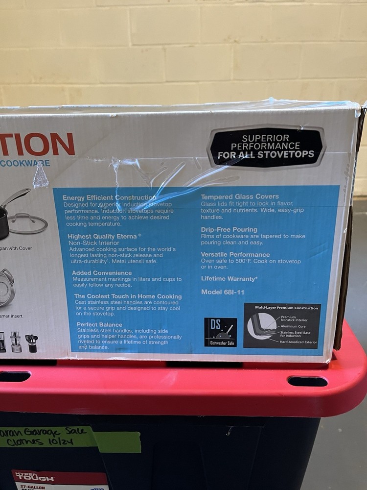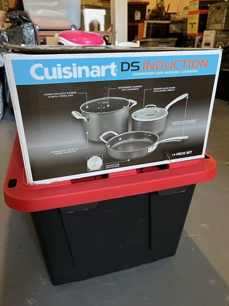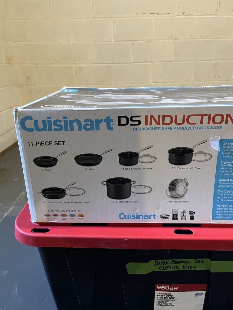 The Cuisinart Chef's Classic 11-Piece Cookware Set in Black is a high-quality pan set designed for use on various stove types including induction, electric, and gas. Made of stainless steel with aluminum core and a non-stick surface coating, this set includes a variety of items such as saucepans, skillets, and a stockpot. The set not only comes with lids for each piece, but also features heat resistance of up to 500°F and is dishwasher safe for easy cleaning. With a lifetime manufacturer warranty, this set is a reliable and durable addition to any kitchen. Given to us as a duplicate wedding gift. Brand new and never used.