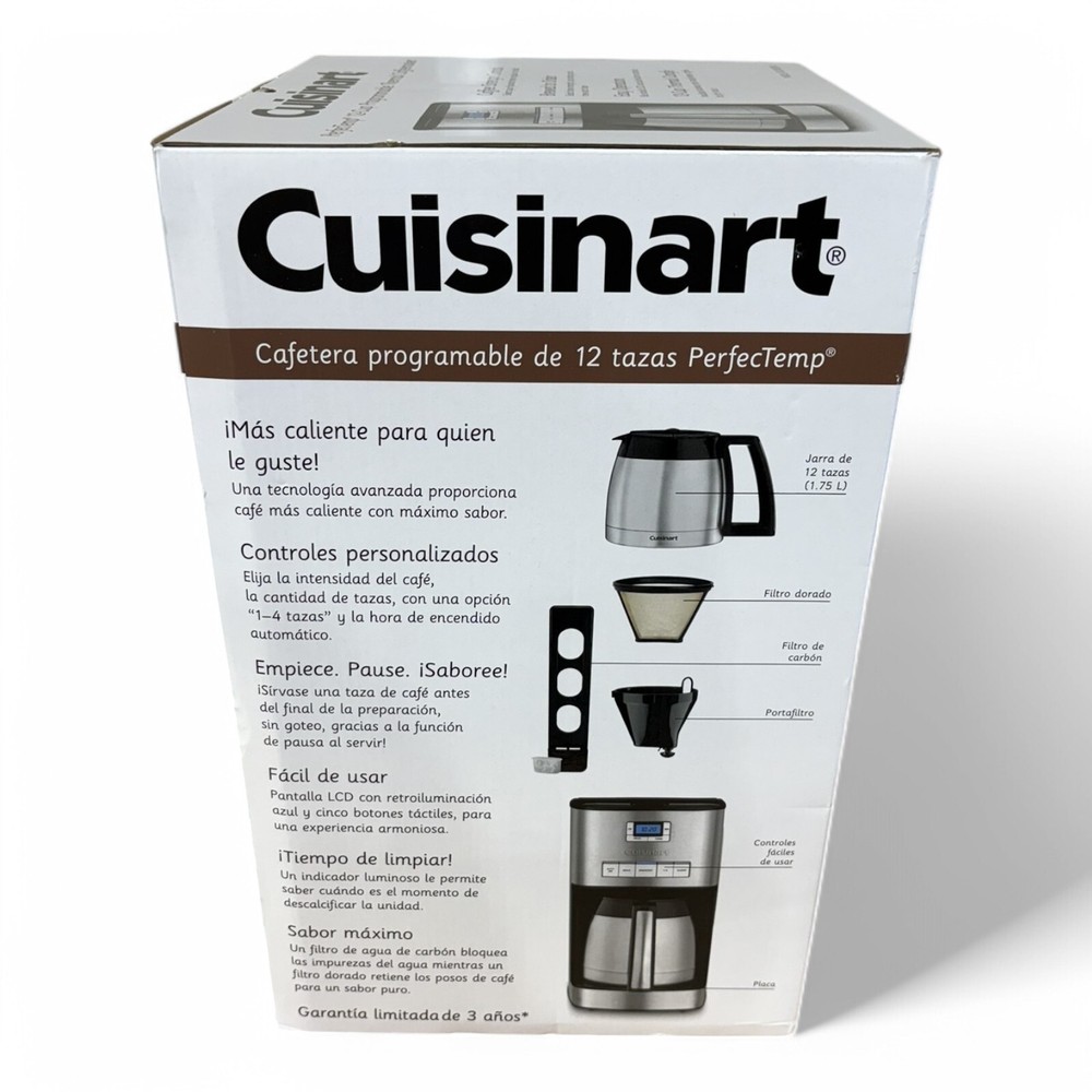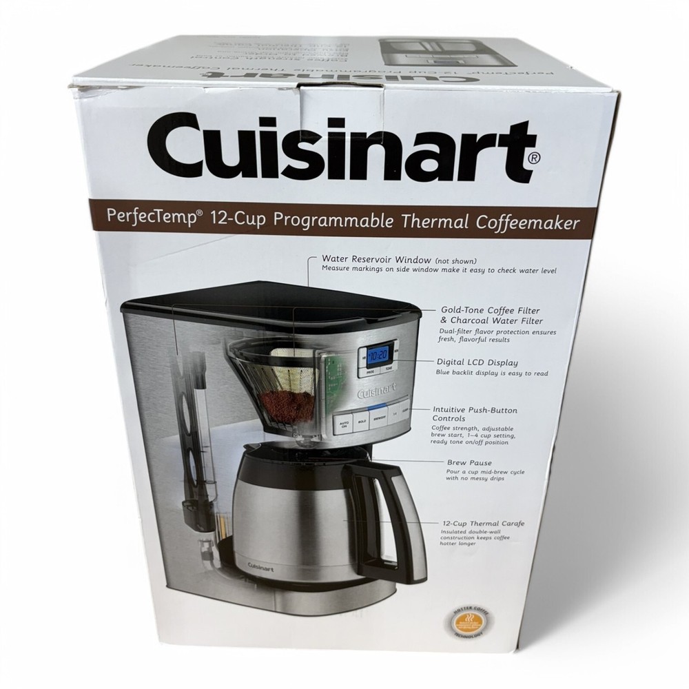Description With hotter coffee and brew strength options, the Cuisinart 12 Cup Programmable Thermal Coffeemaker is a virtuoso among gourmet coffee makers. Equipped with cutting edge coffee technology to give you hotter coffee without sacrificing taste. Choose a flavor profile with regular or bold strength control, and set brew-time up to 24-hours ahead. Our backlit LCD is easy-to-read, a ready tone can be turned on or off, and an indicator light signals when it’s time to decalcify. Highlights 12 Cup double walled carafe Brew Strength Control, charcoal, and a gold-tone fine filter 60 Second Reset helps recall prior settings and brewing process in case of an electric power outage Automatic -programmable for up to 24-hour cycle Self clean and descale for easy care BPA free 30 inch cord, 1050 watts