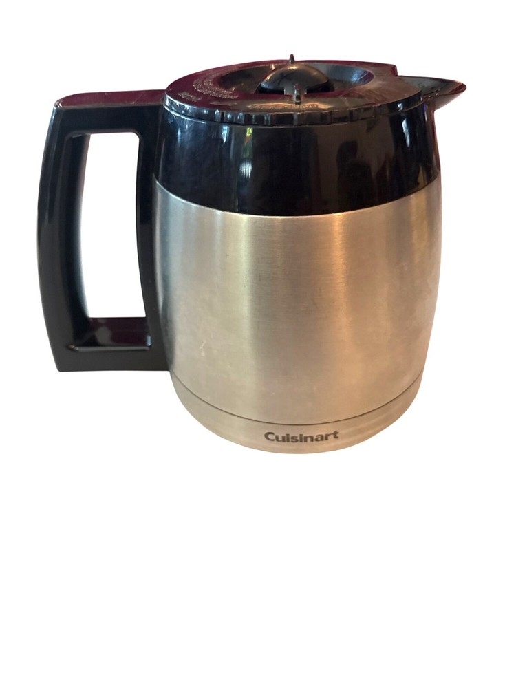 No longer will your coffee's warmth be as fleeting as your enthusiasm for morning exercise. This carafe keeps it steaming hot until you're ready to caffeinate and conquer. It's like a cozy blanket for your brew—minus the fluff. • Fits 10-cup coffee maker • Thermal insulation • Secure black lid • Comfortable handle Cuisinart DCG-600RC 10-Cup Replacement Thermal Carafe with Lid, Compatible with Cuisinart Coffeemakers, Stainless Steel Minor scratches on the body, lid in good condition. Size: 10 Condition: Pre-Owned Good