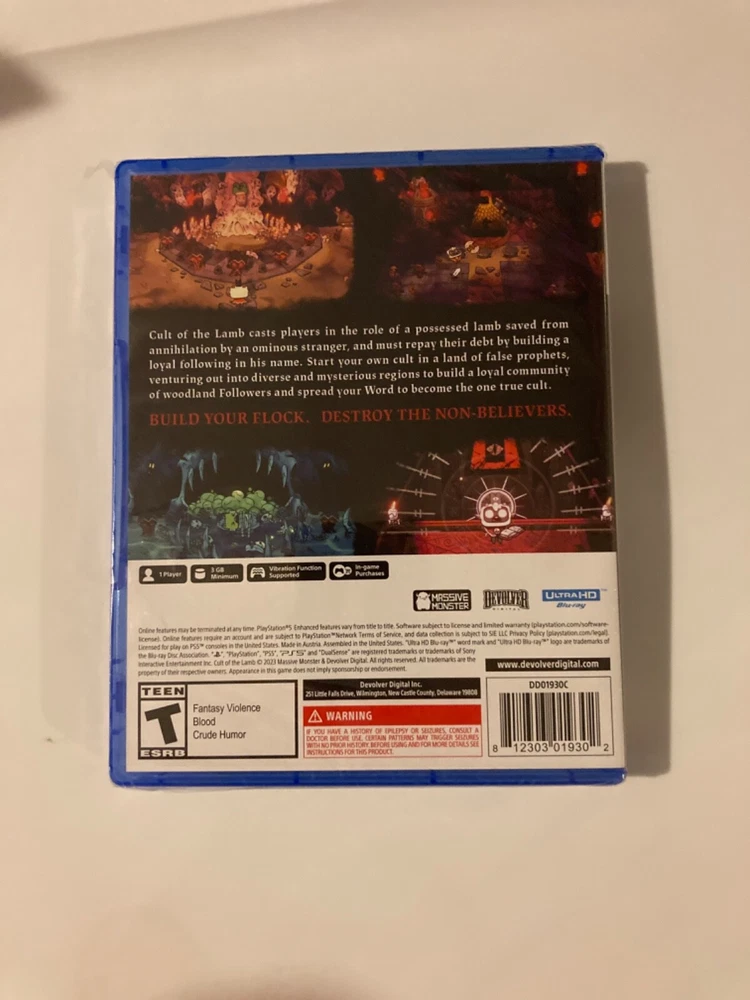 Region Code:Region FreeRelease Year:2023Game Name:Cult of the LambRating:T-TeenUPC:812303019302gtin13:812303019302Features:Physical Edition, Standard EditionVideo Game Series:Cult of the LambPlatform:Sony PlayStation 5Publisher:SonyMPN:DD01931Country/Region of Manufacture:United StatesGenre:Action & Adventure, Strategy, Roguelike, Indie