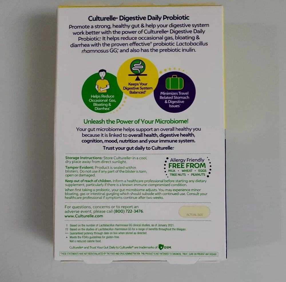 Let's face it. Occasional digestive problems are no fun- occasional upset stomach, gas, bloating, or diarrhea are uncomfortable and can be embarrassing. Many of these digestive issues can be caused by an occasional imbalance of good bacteria in the digestive tract. Culturelle Digestive Health contains 10 billion live active cultures of Lactobacillus rhamnosus GG, the most clinically studied probiotic strain†† to help your digestive system work better; plus the prebiotic Inulin.