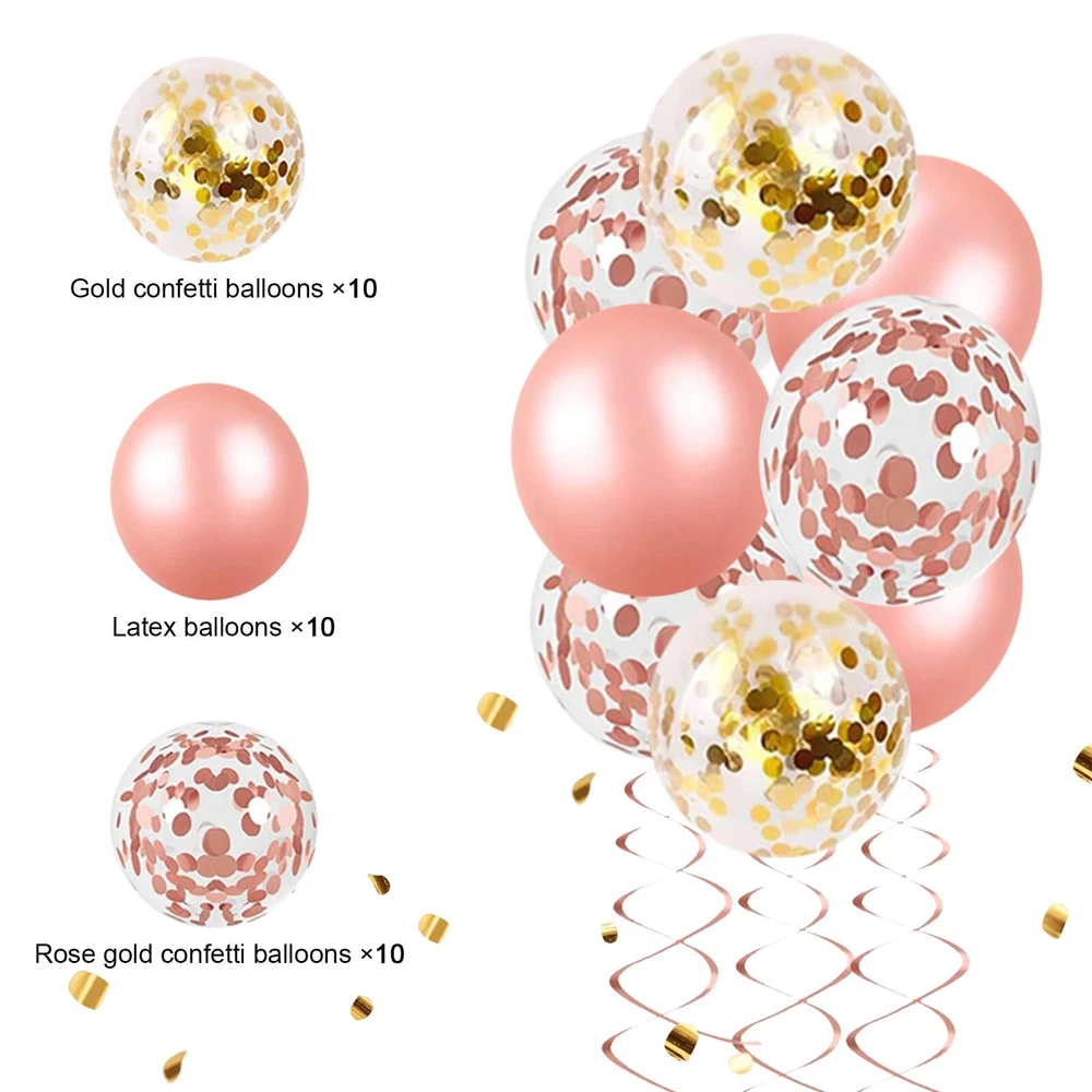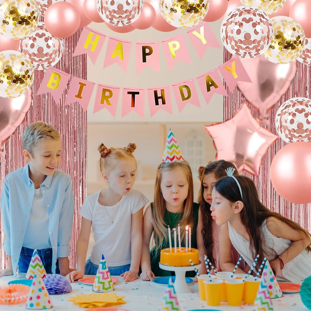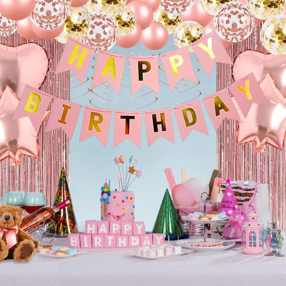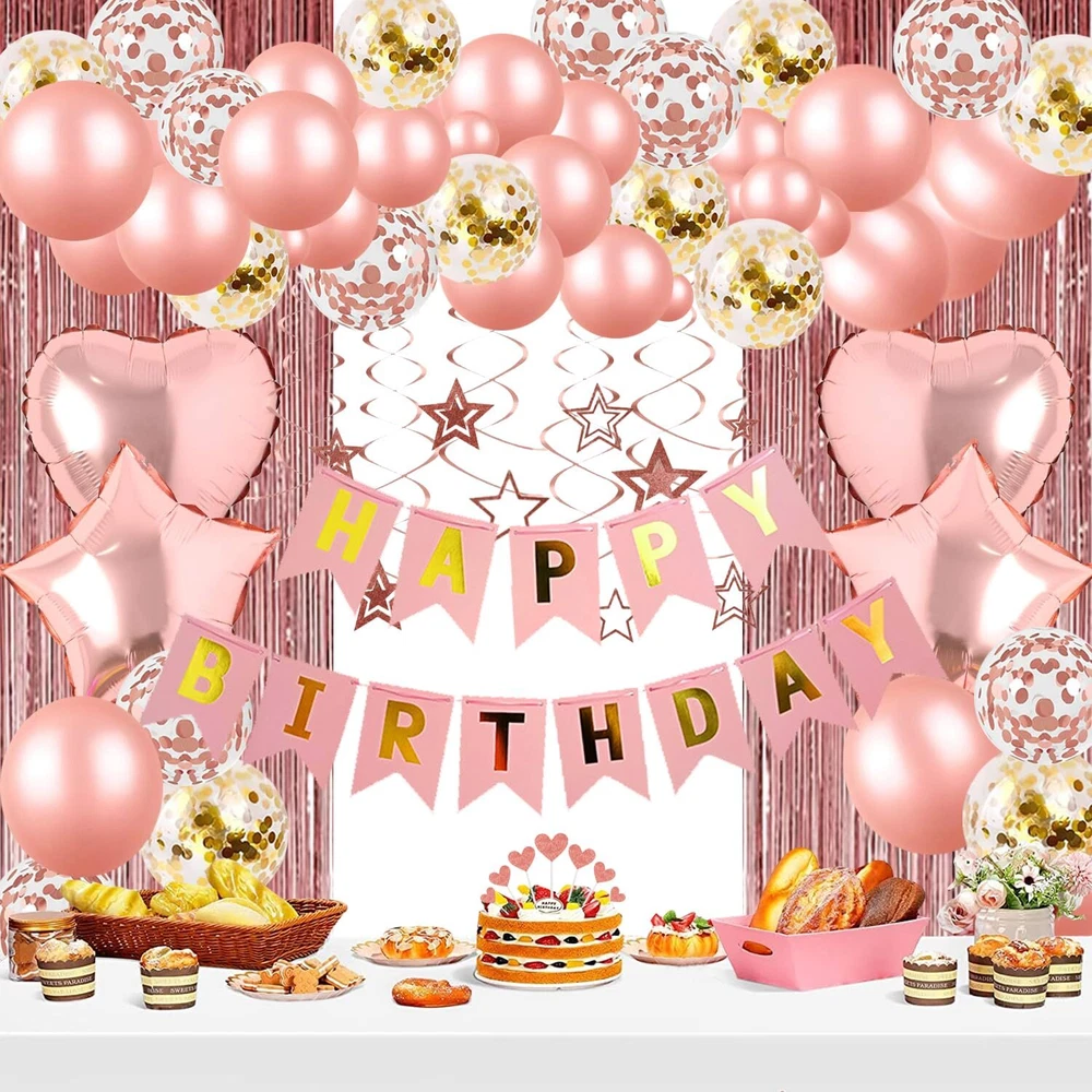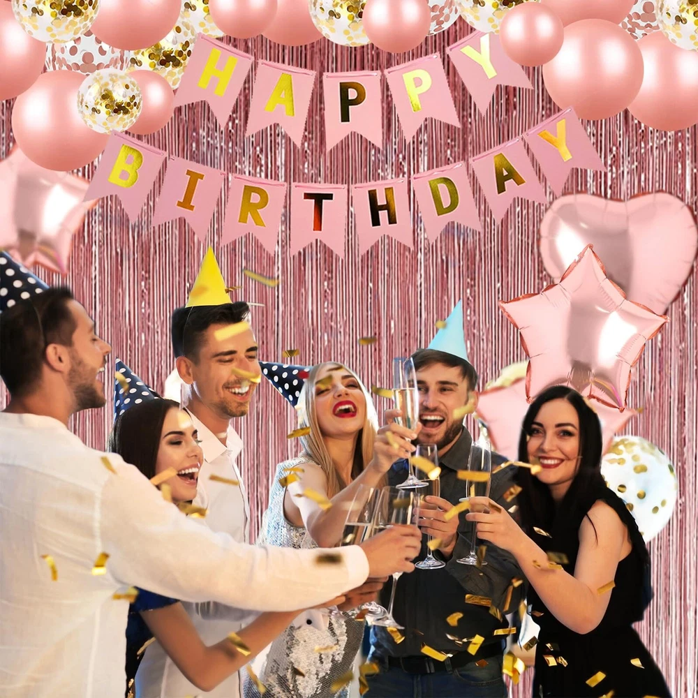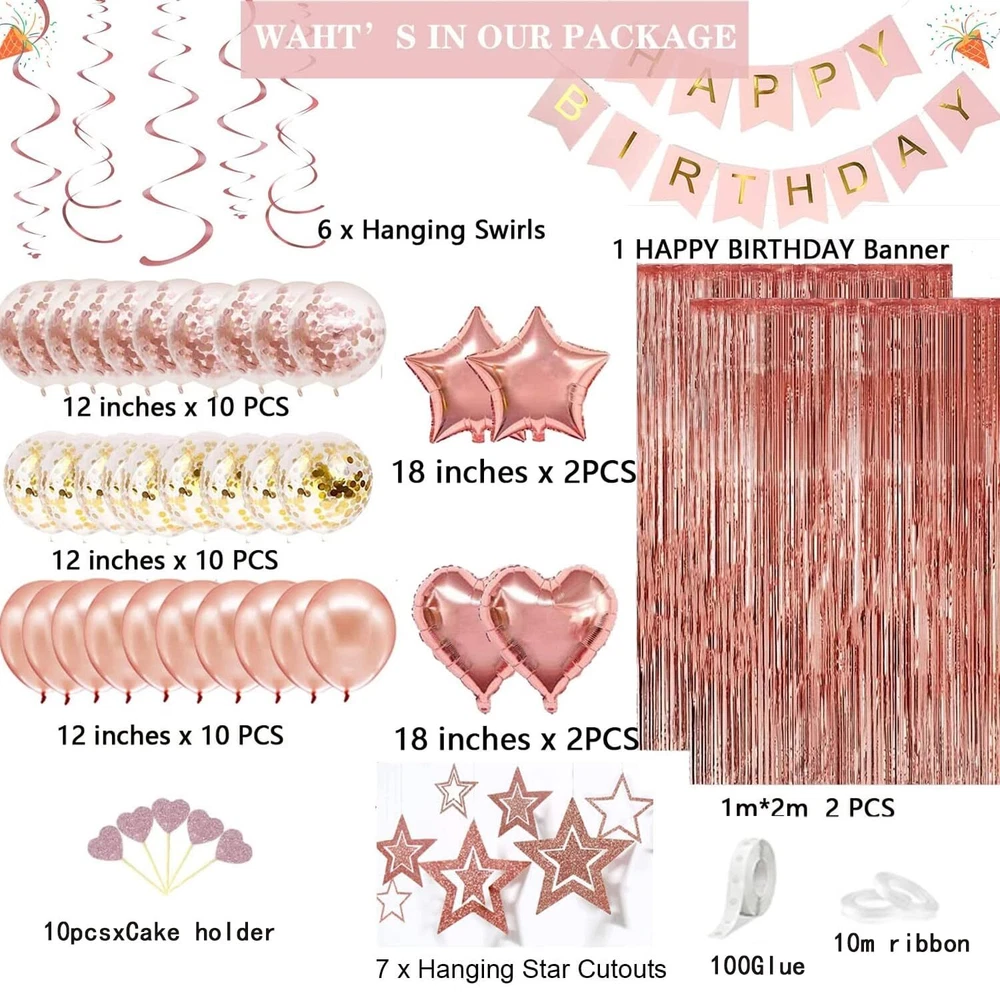 [ROSE GOLD BIRTHDAY DECORATIONS SET for GIRLS WOMEN]-62Pcs. Including 1pc rose gold “HAPPY BIRTHDAY“ banner, 2pcs 3.3*6.5ft rose gold fringe party curtains, 6pcs rose gold hanging swirls, 7pcs glitter rose gold hanging star cutouts, 20pcs 12inch confetti balloons, 10pcs 12inch latex balloons, 4pcs 18inch star and heart foil balloons, 10pcs cake holders, 1pcs ribbon/ dot glue. [EASY TO USE]-Rose gold foil fringe party curtains come with self-adhesive strips at the back, you just peel off the strips and hang them on wall or door. It is made of tinsel, non-fading. The birthday decoration kit is easy to assemble and hang. You only need to hang or stick them through the ribbon or dot glue, firm and lasting. [UNIQUE EYE-CATCHING DESIGN]-The birthday party decorations suitable for all birthday parties. Decorate them at home, classroom, office or other places, add a strong birthday party atmosphere. 2pcs rose gold fringed foil shiny curtains for backdrop,creating sparkle nice atmosphere as decorations for parties. [PREMIUM QUALITY MATERIAL]-The happy birthday banner is made of high quality cardstock, wrinkle resistant and durable. Sturdy ribbon, twinkle star hanging decor. All balloons are thick and not easy to blow, non-toxic and odorless, safe to use. Rose gold, vibrant colors, add to the party atmosphere. The high-quality birthday decorations can be carefully stored away and reused. Don't damage the wall. [ATTENTIVE SERVICE]-Perfect for all ages. 1st 5th 10th 13th 15th 16th 18th 20th 21st 22nd 23rd 24th 25th 30th 35th 40th 45th 50th 60th 70th 80th 90th 100th. If you have any questions, welcome to contact us, we will reply you within 24 hours.