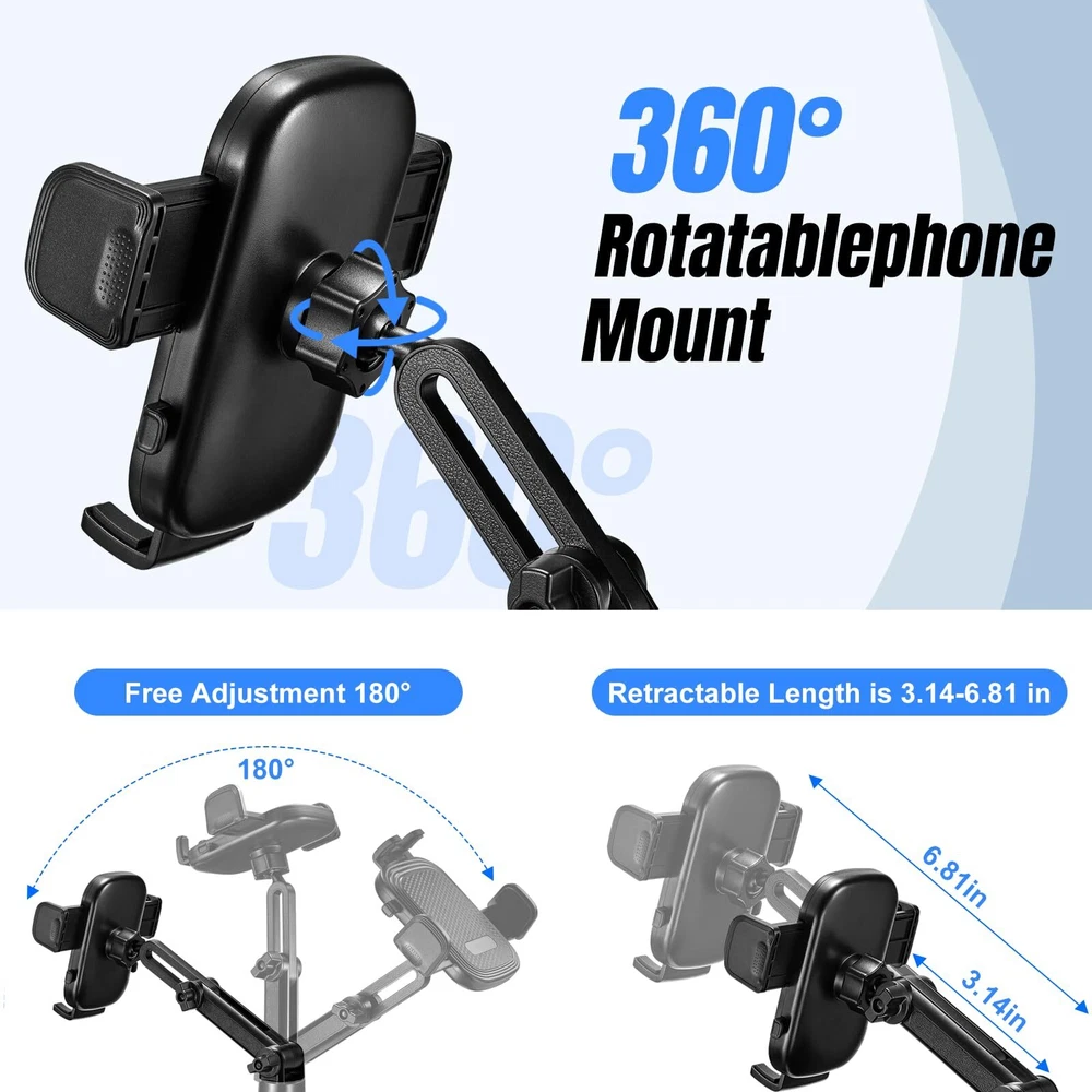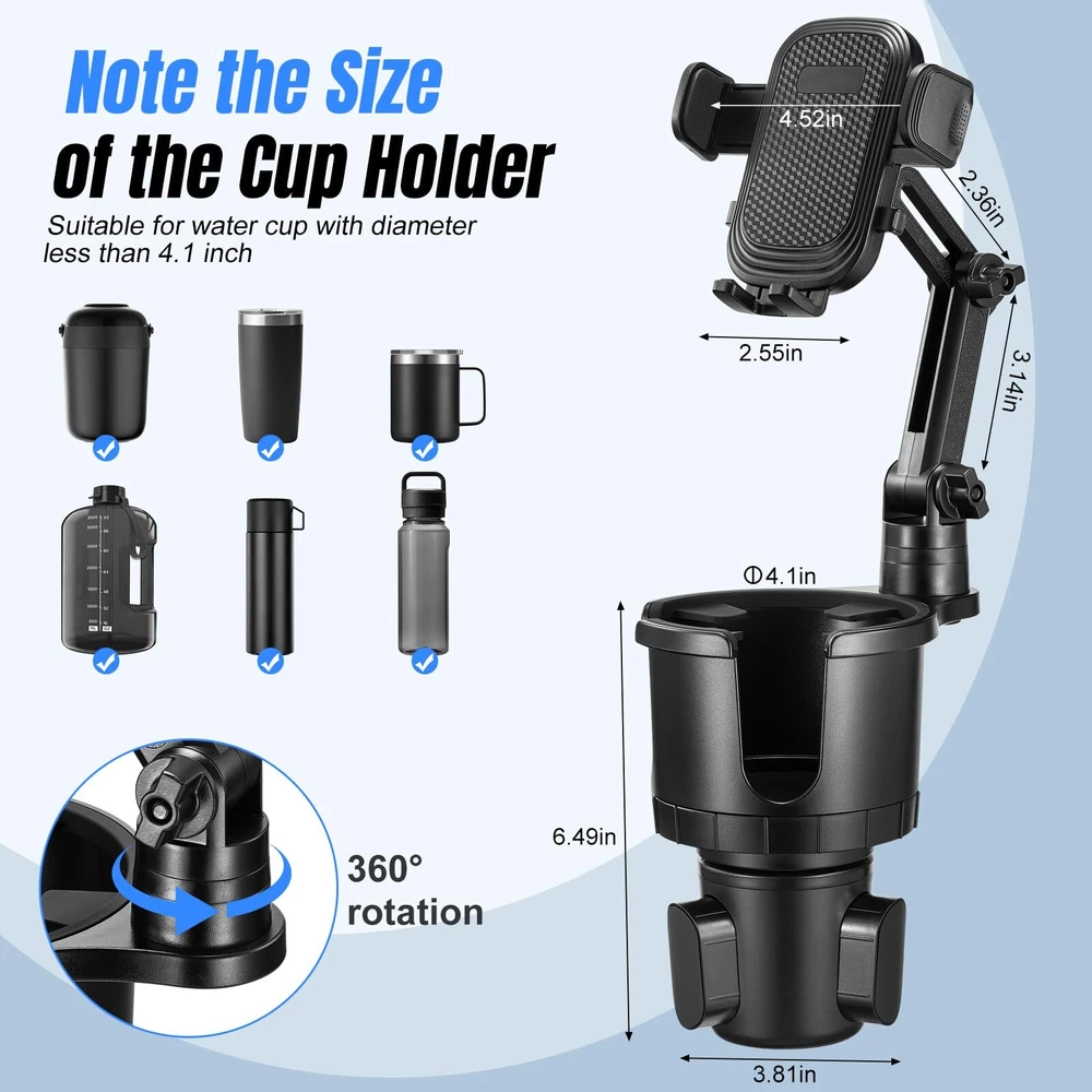 ✔【Compatible Models】:The cup holder phone holder fit for smartphones up to 7”,compatible with iPhone 14 Pro Max / 14 Plus /14/ 13 / 12/ X/ Xs/ 8 plus/ 8/ 7 plus/ 7/ 6s plus, Samsung Galaxy S10/ S10e/ S9/ S8, and more. just press buttons on both sides of car phone holder mount,it can hold your phone tightly. ✔【2-in-1 Perfect Design】: Have you ever been frustrated when the center console cup holder couldn't accommodate the large bottle? Our innovative design has solved this inconvenience for you. It's not just a phone holder; it's also a Cup Holder Expander that can adapt to popular brand bottles ranging from 18-40 oz or cups with a mouth diameter of less than 4.1 inches. ✔【Sturdy Expandable Base】: Our cell phone holder car cup holder with an adjustable base that securely mounts cups less than 4.1inch in diameter, it's a versatile choice for most vehicles, including cars, SUVs, trucks, and even unconventional options like golf carts, treadmills, and massage recliners. In addition, our cup holder mount boasts a weighted base with three extensions and non-slip silicone, forming a rock-solid triangular structure. This innovative design offering unmatched stability. ✔【Adjustable Height for Your Comfort】: What sets our phone cup holder for cars apart is its exceptional height adjustability. The extendable neck can be effortlessly adjusted from 12" to 14.37", ensuring you can position your phone at the perfect, ergonomic height. Unlike flimsy gooseneck designs that tend to droop when exposed to heat, With two adjustable knobs and a 360°rotation feature, you can immobilization your phone holder, making it the ideal choice for a safe driving experience. ✔【Universal Fit with 12-Month Protection】:This car phone cup holder is fit for almost all phones.With our cup holder phone mount, you'll enjoy 12 months Protection.
