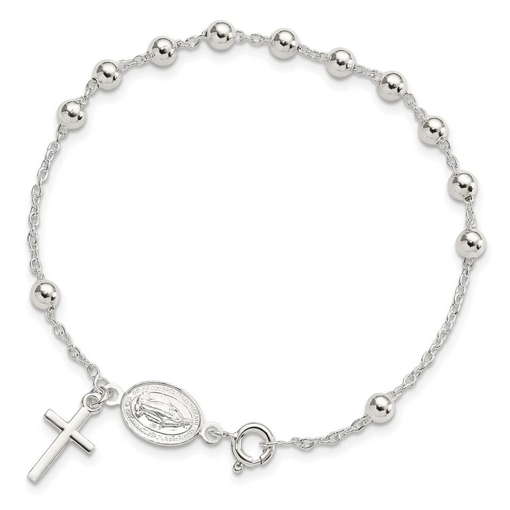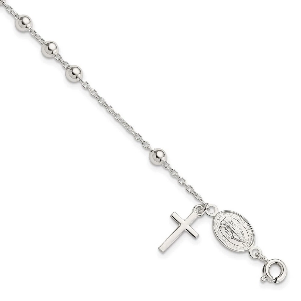 4mm Sterling Silver Polished Rosary Bracelet - 7.5 Inch - 4.0 Grams in Sterling Silver - Charm/Element Width: 8.4 mm - Width of Item: 4 mm - Charm/Element Length: 17.6 mm - Length of Item: 7.5 in - Chain Length: 7.5 in - Chain Width: 1.58 mm - Clasp /Connector: Spring Ring - Finish: Polished - Chain Type: Cable - Feature: Semi-Solid - Clasp Width (Male end): 5.69 mm - Clasp Width (Female end): 2.7 mm - All of our jewelry for women and men are authenticated with a 10K or 14K hallmark and are tested to pass FTC regulations. Free Shipping Over $49.99* Details Curata 925 Sterling Silver 7.5" Polished Rosary Dangle Cross Bracelet Product Description: 4mm Sterling Silver Polished Rosary Bracelet - 7.5 Inch - 4.0 Grams in Sterling Silver - Charm/Element Width8.4 mm - Width of Item4 mm - Charm/Element Length17.6 mm - Length of Item7.5 in - Chain Length7.5 in - Chain Width1.58 mm - Clasp /ConnectorSpring Ring - FinishPolished - Chain TypeCable - FeatureSemi-Solid - Clasp Width (Male end)5.69 mm - Clasp Width (Female end)2.7 mm - All of our jewelry for women and men are authenticated with a 10K or 14K hallmark and are tested to pass FTC regulations.