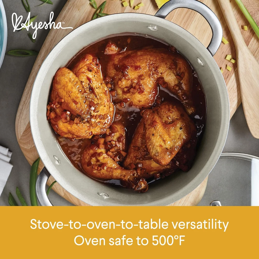 Store New Arrivals Add to Favorite View Feedback Contact Curry Home Collection Nonstick Cookware Pots and Pans Set, 9 Piece, Twilight Teal Description Item model number 10769 Global Trade Identification Number 00631899107695 Closure Material Glass Color Twilight Teal Included Components 1.5-Quart Saucepan^Lid^ 2-Quart Saucepan^Lid^5.5-Quart Dutch Oven^Lid^ 8.5-Inch Skillet^ 12-Inch Skillet^Lid Material Aluminum Country of Origin Thailand Is Dishwasher Safe Yes Item Weight 15.32 pounds Is Oven Safe Yes Handle Material Stainless Steel Size 9 Piece Material Type Free PFAS Free, PFOS Free Special Feature Gas Stovetop Compatible Product Dimensions 24 x 13.63 x 9.25 inches Compatibility Options oven safe Number of Pieces 9 COOKWARE BY AYESHA CURRY: Essential cookware set for bringing practical features and elevated design to the kitchen HIGH PERFORMANCE: Kitchen pots and pans set is crafted from aluminum for fast, even heat to bring recipes together in a flash PRO GRADE POTS AND PANS: Cookware pieces are oven safe to 500 degrees F and feature dual-riveted stainless steel handles and tempered glass lids to seal in heat and flavor DIAMOND NONSTICK: Pots and pans are crafted with stylish hard enamel porcelain exteriors and enhanced, diamond-textured, nonstick interiors for long-lasting food release and easy cleanup COOKWARE SET INCLUDES: 1.5-quart saucepan with lid, 2-quart saucepan with lid, 5.5-quart Dutch oven with lid, 8.5-inch frying pan, 12-inch frying pan with lid Stylish porcelain enamel cookware from Ayesha Curry brings practical features and elevated design to the kitchen. Get stove to oven to table performance to bring out the flavors that bring the family together. This eye-catching nonstick cookware set includes all the essentials for creating big brunches and weeknight family favorites. Constructed from fast, even-heating aluminum with stylish hard porcelain exteriors, these pro-grade pots and pans are oven safe to 500° F and feature dual-riveted stainless steel handles for a confident grip and tempered glass lids to lock in heat and flavor. Plus, interiors boast a diamond textured surface with enhanced nonstick for long-lasting, effortless food release and easy cleanup. ABOUT US We offer the best prices around on high quality products. Our E-store includes media such as books, movies, music and games while offering electronics, toys, sporting apparel, clothing, tools, general home, garden items and more. SHIPPING We are always working hard to ensure your package arrives as soon as possible. Please understand that some factors like weather, high postal traffic, and the performance of shipping companies are outside of our control. We offer free shipping to the lower 48 states and ship within 2 business days of payment, usually sooner. We do not accept P.O. Boxes. Please provide a physical address. For shipping outside of the continental USA, we only use eBay's Global Shipping Program.The item is shipped to KY and then sent to the rest of the world. International customers are responsible for all duties and taxes. Continue to check out in order to calculate costs for shipping the item to your country. Messages regarding eBay's Global Shipping Program MUST be directed at eBay EXCLUSIVELY. RETURNS We offer a 30-Day Return Policy on items which you are not completely satisfied with. You have the option for a full-refund or an exchange of the item. No returns are available on items shipped outside of the USA. PAYMENT We accept PayPal. CONTACT US This page content is yet to come Please ad us to your favorite seller and visit again later Thank You CUSTOMER SATISFACTION We try our very best to make sure every customer is completely satisfied. If there's a problem, message us! We're happy to help. WE ACCEPT Copyright © 2021 AutoDS. | All Rights Reserved