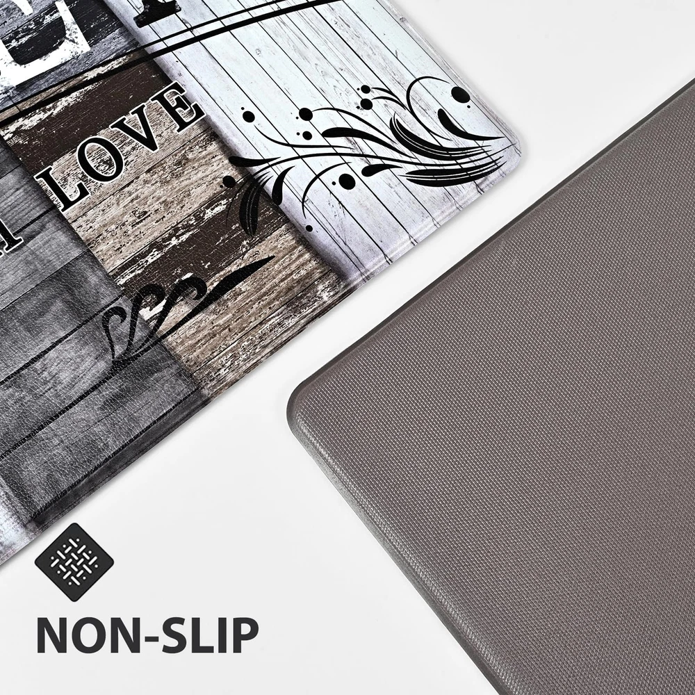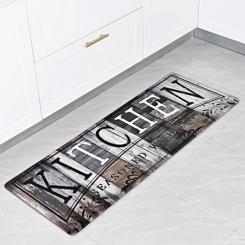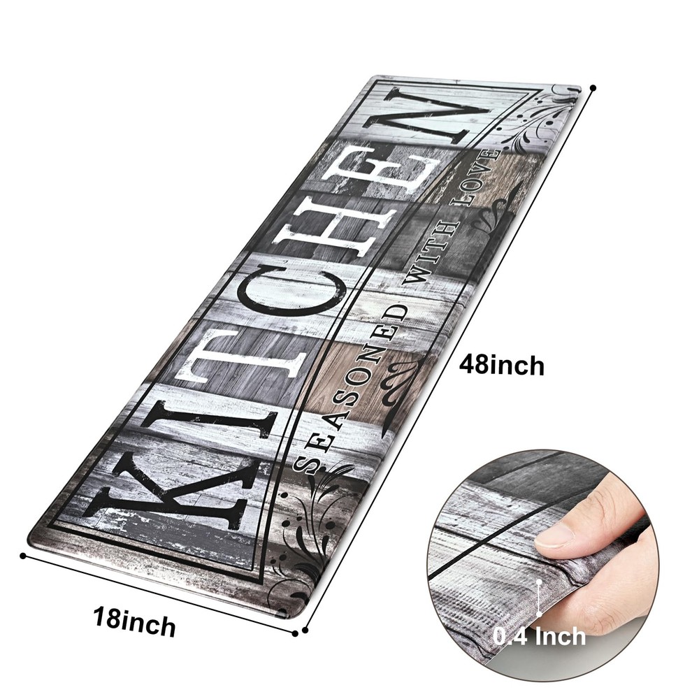 ANTI FATIGUE: Want to experience the relaxing and comfortable feeling of your feet while standing? Our vintage kitchen rug runner is 10mm thick and provides comfort while standing, reduces stress on knees and ankles, and provides comfortable support, perfect for those who spend a lot of time on their feet at work or at home. EASY TO CLEAN: The rustic kitchen mat rug and runner is made of waterproof PVC material that is easy to clean, resistant to water, liquids, oil or stains and if anything spills, it can be cleaned up effortlessly. Simply clear dust on the mat with a vacuum cleaner or wipe stains with a damp cloth or sponge or mop, with no stain residue. NO SLIP: This farmhouse padded floor mat is designed with weave textured pattern surface and the non-slip backing, keeping the kitchen rugs stay in place and prevents slipping. The gel mat is durable enough to hold up to a lot of walking on it by pets or the robot vac going over it, holding up very well with frequent use. SIZE INFORMATION: Our farm standing rug for kitchen floor is measured 48"(L) x 18(W)" x 0.4(H)", which may be used to meet different needs, will work well with your family, also helps to prevent dishes from breaking and protect your floor from any types of damage. MULTIPLE OCCASIONS: About the personalized floor comfort mat, not only does it add a vintage atmosphere to the room, but it also cushions the hard floor. You could use the wooden kitchen runner mat for laundry room, kitchen, office, farmhouse,in front of sink or any other high-traffic indoor or outdoor space.