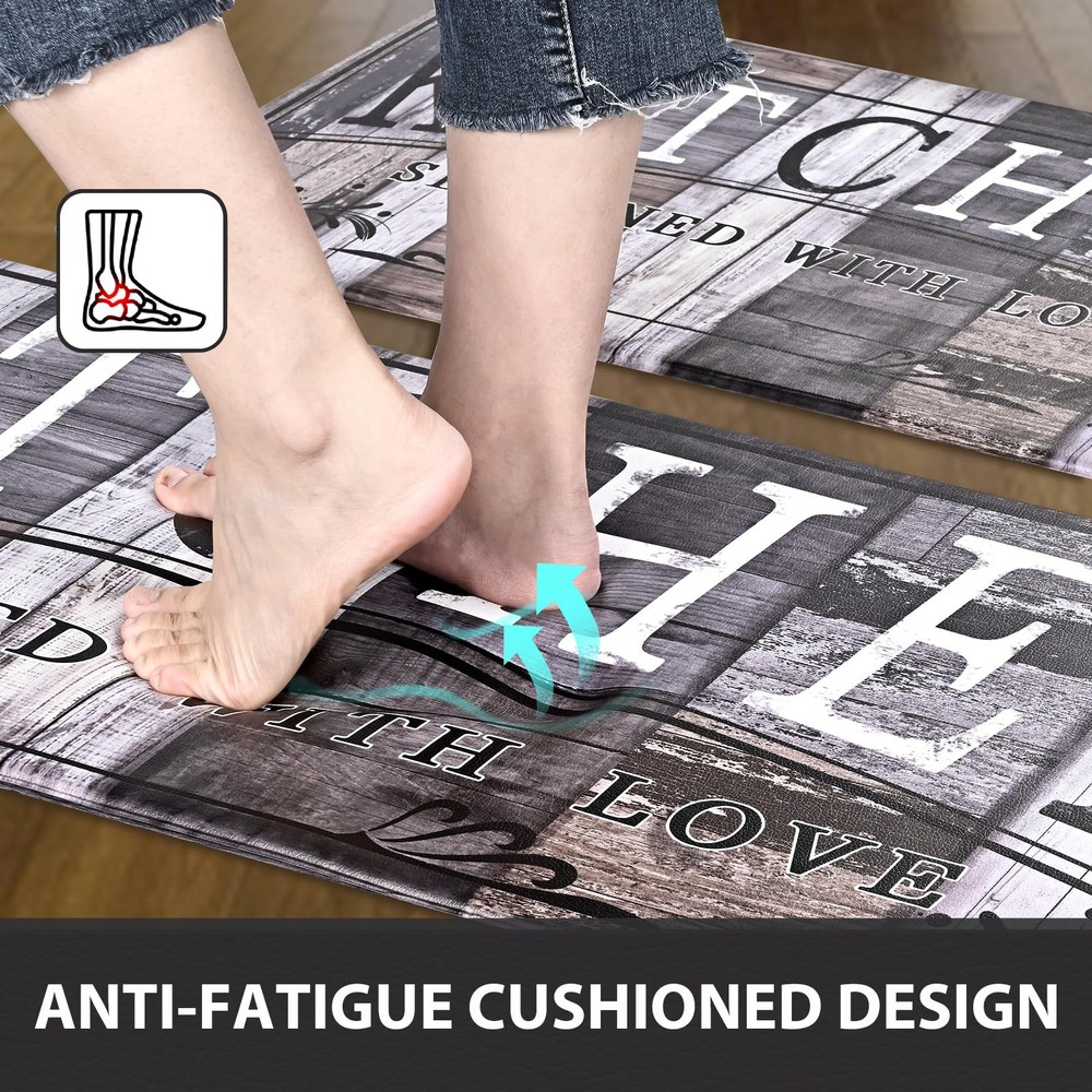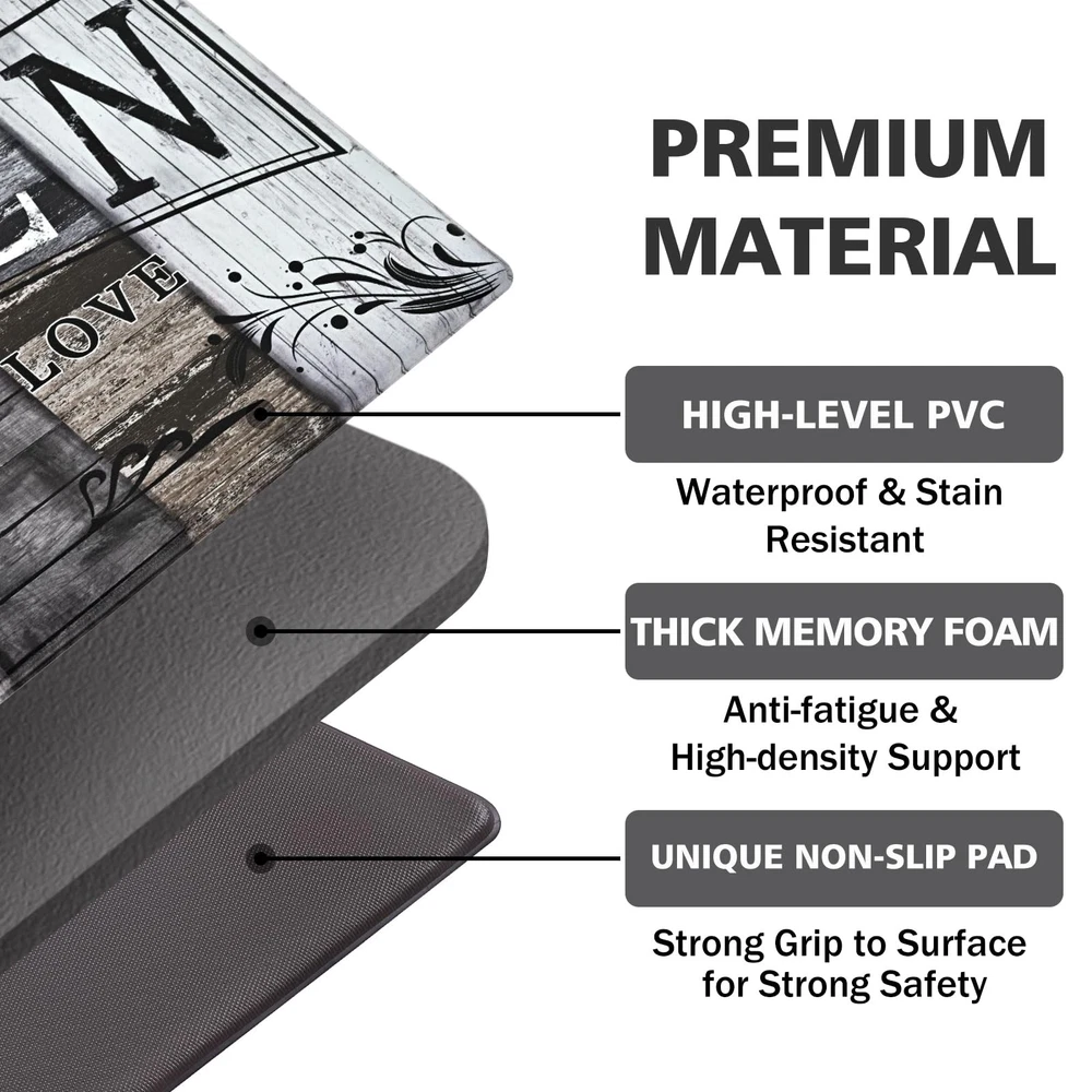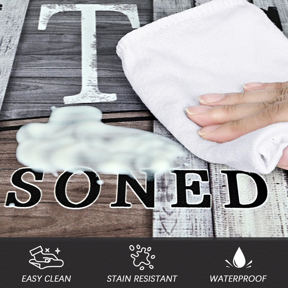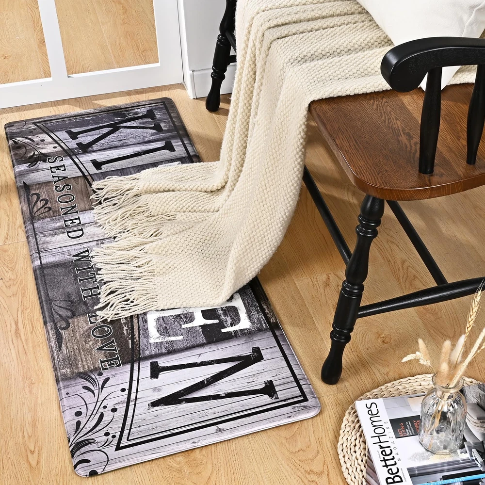ANTI FATIGUE: Want to experience the relaxing and comfortable feeling of your feet while standing? Our vintage kitchen rug runner is 10mm thick and provides comfort while standing, reduces stress on knees and ankles, and provides comfortable support, perfect for those who spend a lot of time on their feet at work or at home. EASY TO CLEAN: The rustic kitchen mat rug and runner is made of waterproof PVC material that is easy to clean, resistant to water, liquids, oil or stains and if anything spills, it can be cleaned up effortlessly. Simply clear dust on the mat with a vacuum cleaner or wipe stains with a damp cloth or sponge or mop, with no stain residue. NO SLIP: This farmhouse padded floor mat is designed with weave textured pattern surface and the non-slip backing, keeping the kitchen rugs stay in place and prevents slipping. The gel mat is durable enough to hold up to a lot of walking on it by pets or the robot vac going over it, holding up very well with frequent use. SIZE INFORMATION: Our farm standing rug for kitchen floor is measured 48"(L) x 18(W)" x 0.4(H)", which may be used to meet different needs, will work well with your family, also helps to prevent dishes from breaking and protect your floor from any types of damage. MULTIPLE OCCASIONS: About the personalized floor comfort mat, not only does it add a vintage atmosphere to the room, but it also cushions the hard floor. You could use the wooden kitchen runner mat for laundry room, kitchen, office, farmhouse,in front of sink or any other high-traffic indoor or outdoor space.