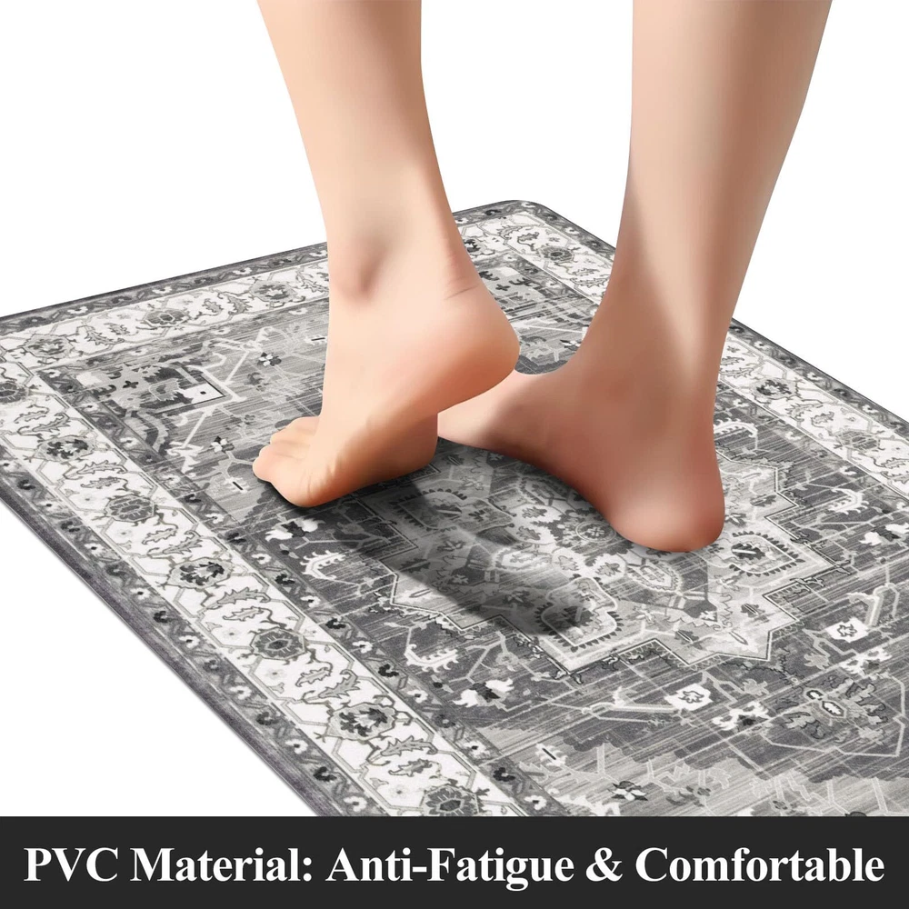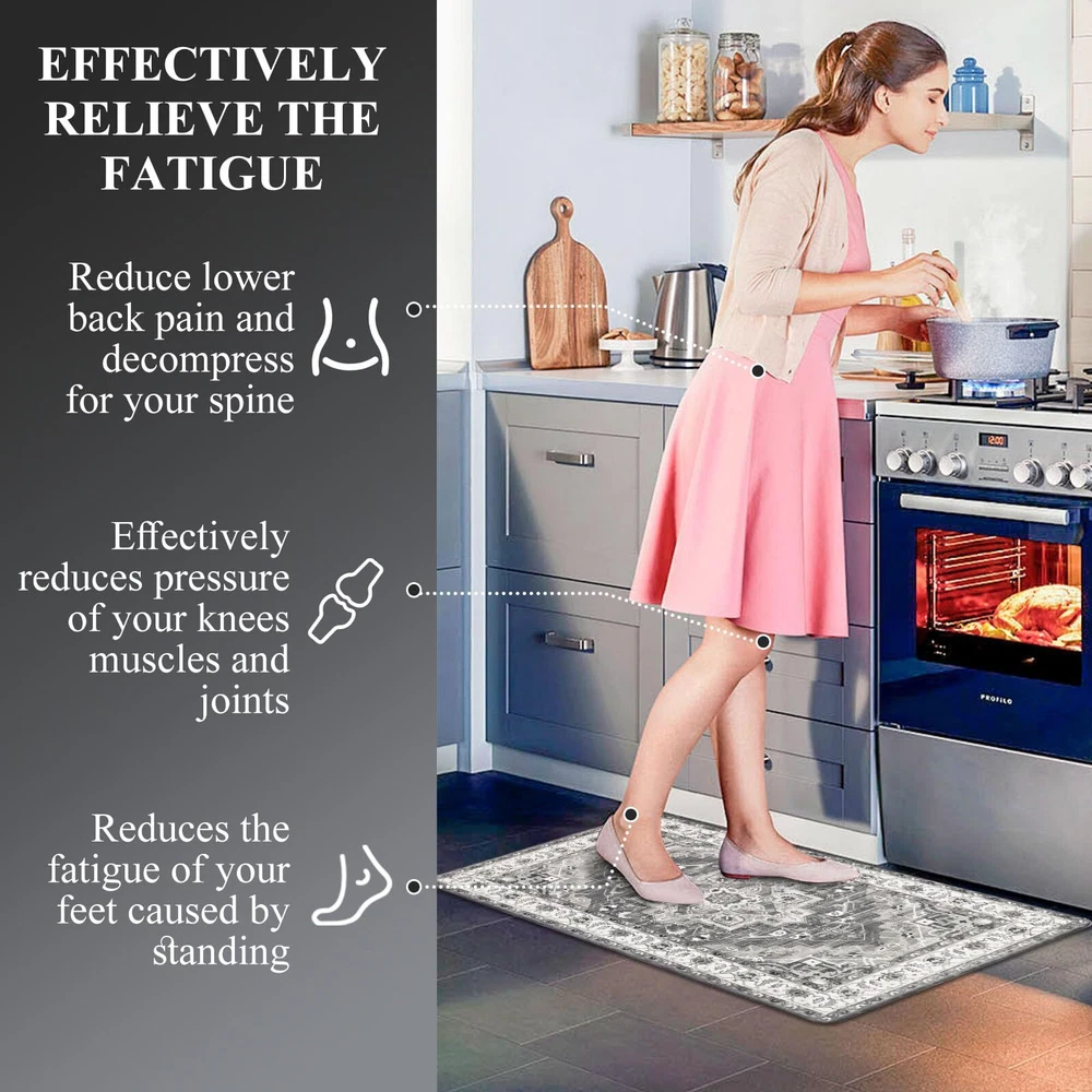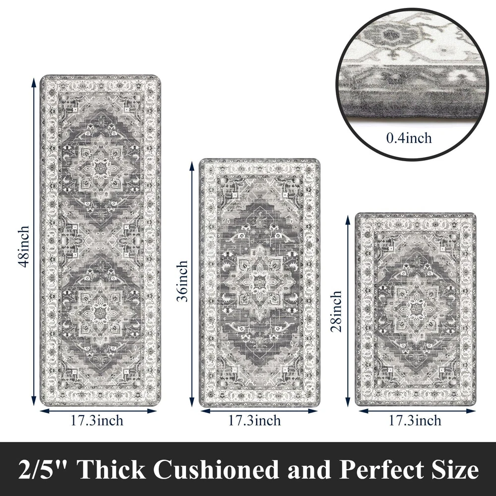 Anti Fatigue Kitchen Mats for Floor 3 Piece Set: Our farmhouse antifatigue kitchen mat and runner set measures 17.3''x28''+17.3''x 36''+17.3''x 48''.The comfort standing mat with runner are made of premium PVC materials,which is not easily deformed Comfort Anti-fatigue Mats for Kitchen Floor: 0.4'' thick cushioned anti fatigue kitchen floor mats are ergonomically engineered,so thick and cushioned that you are able to stand comfortably while working in the kitchen or at any work station Non Slip Kitchen Rug Set: Backing of the anti fatigue kitchen mat set is made of non-slip material;also beveled edges help prevent tripping.Please clean the floor before use.Clean and dry surface will be conducive to the kitchen mats slip resistant Waterproof Kitchen Rugs Set of 3: If the kitchen rug runner set gets dirty,just simply wipe clean with a damp cloth or sponge in a timely manner,or use any common household cleaner to clean.Please do not put it in the washing machine Versatile Cushioned Kitchen Rugs and Mats Set: Washable kitchen floor carpet set provides ample support for standing in kitchen, kitchen sink, stove, laundry room, office, farmhouse or any other high-traffic indoor or outdoor space