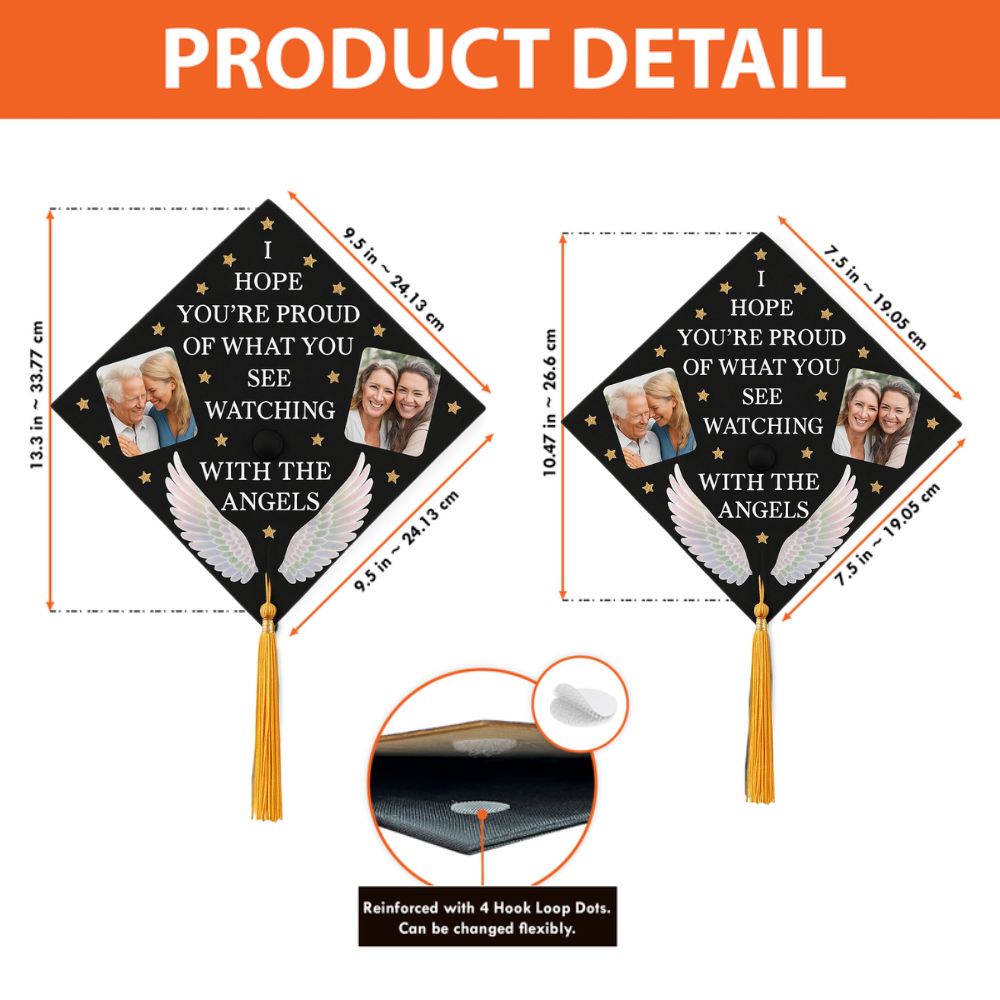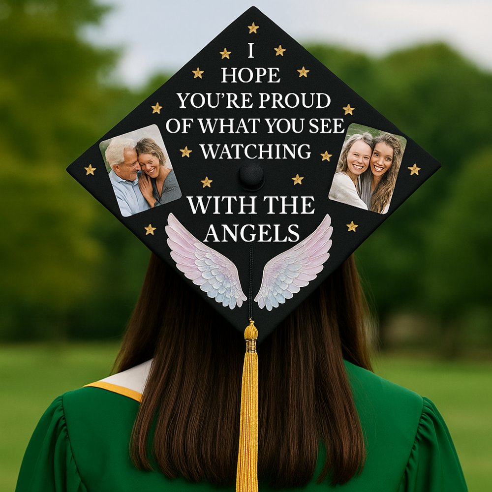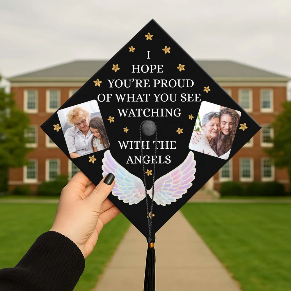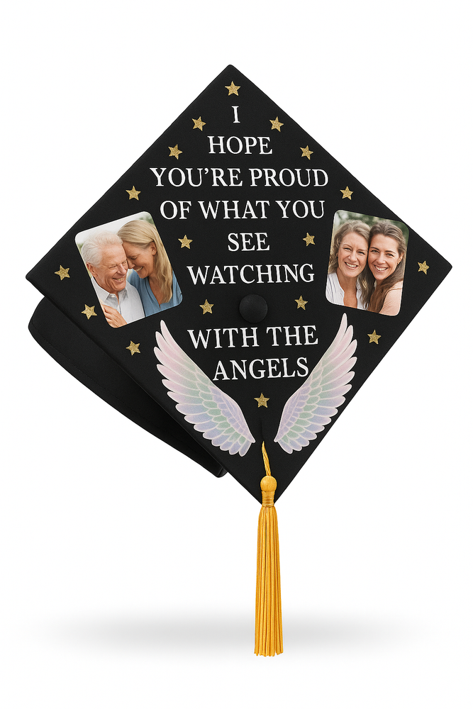 Honor Your Journey and Loved Ones with a Custom Memorial Photo Graduation Cap Topper 2025 Celebrate your graduation in a heartfelt and meaningful way with our Custom Memorial Photo Graduation Cap Topper – a beautiful tribute to cherished memories and loved ones who continue to inspire your journey. 🎓 Premium Quality Materials Each topper is crafted from your choice of durable acrylic (1mm thickness) , solid wood (2mm) , or high-quality paper , ensuring a clean, polished look that lasts beyond the ceremony. 🖼 Personalized with Your Photo & Message Add a custom photo and personal message to honor someone special who has been part of your story. Whether it’s a tribute to a parent, grandparent, friend, or mentor, this topper helps you carry their memory with you as you step into the next chapter of life. ✨ Elegant & Thoughtful Design Embellished with optional glitter, rhinestones, metallic accents , or other meaningful touches, this graduation cap topper is designed to reflect your unique story and deep emotions. It’s not just an accessory—it’s a visual expression of love, gratitude, and remembrance. 🌹 Perfect for the Class of 2025 A touching way to stand out during your ceremony while keeping a loved one close to your heart. This topper makes a meaningful graduation gift for daughters, sons, friends, or yourself. 🎁 A Keepsake to Treasure Forever Beyond graduation day, this custom topper becomes a lasting keepsake —a reminder of your strength, your achievements, and the people who’ve helped shape who you are.