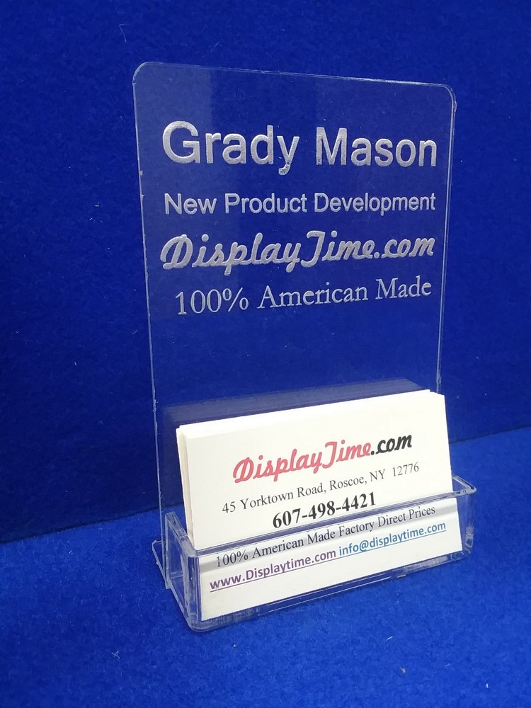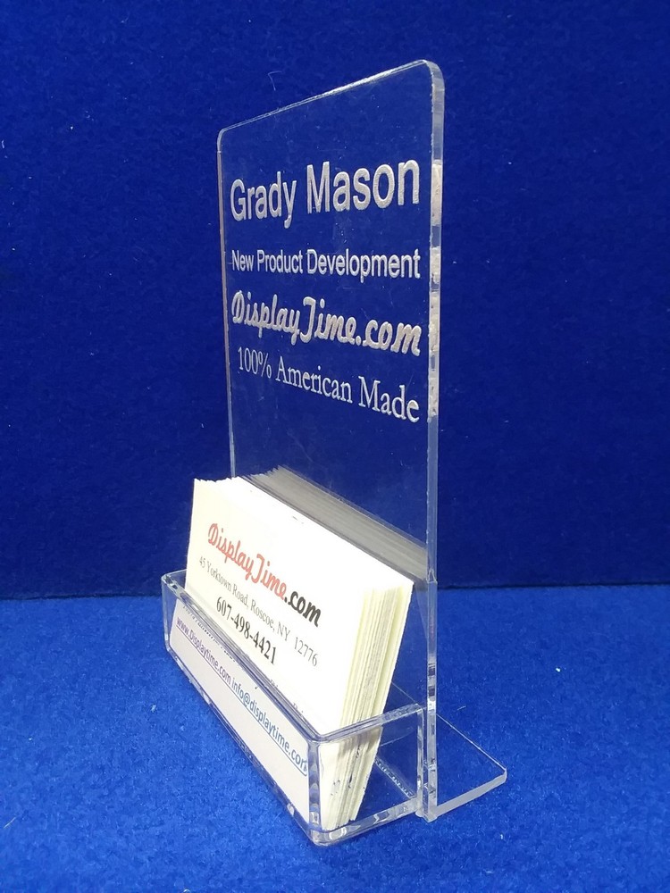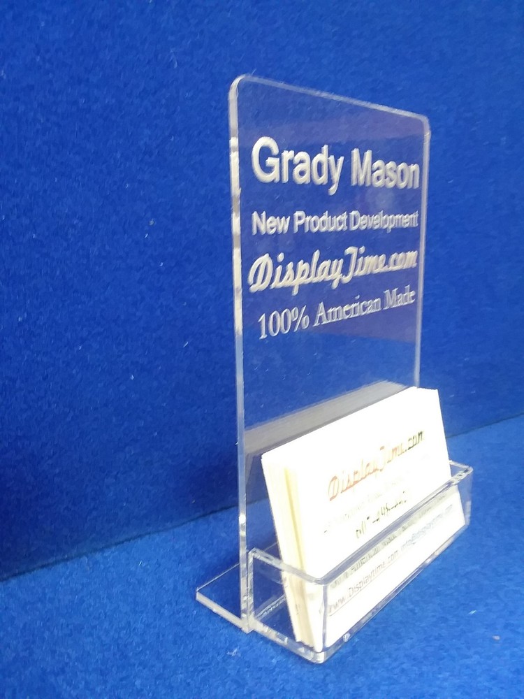 ACRYLIC GLASS DESK NAMEPLATE with BUSINESS CARD HOLDER Verticle space saving design personalized with your name and title. 6" high by 4" wide. Stand out above the crowd! Reverse engraving makes the lettering "POP" . Solid .125 acrylic glass one piece construction. Custom designs available. Put your name, title and preferred Font in the "Note To Seller " section in the checkout area. We will contact you by email to confirm and make sure you get exactly what you order. Quantity Discounts available. See our other listings for more unique designs and styles.