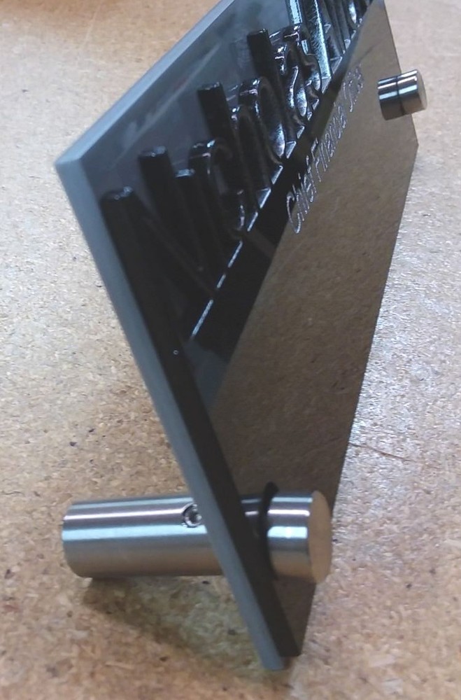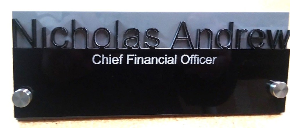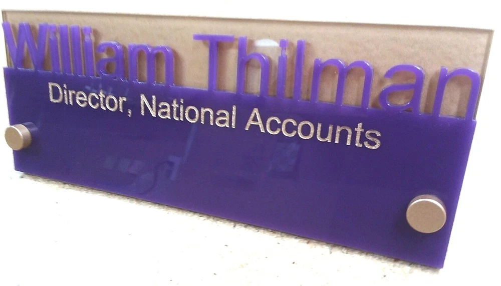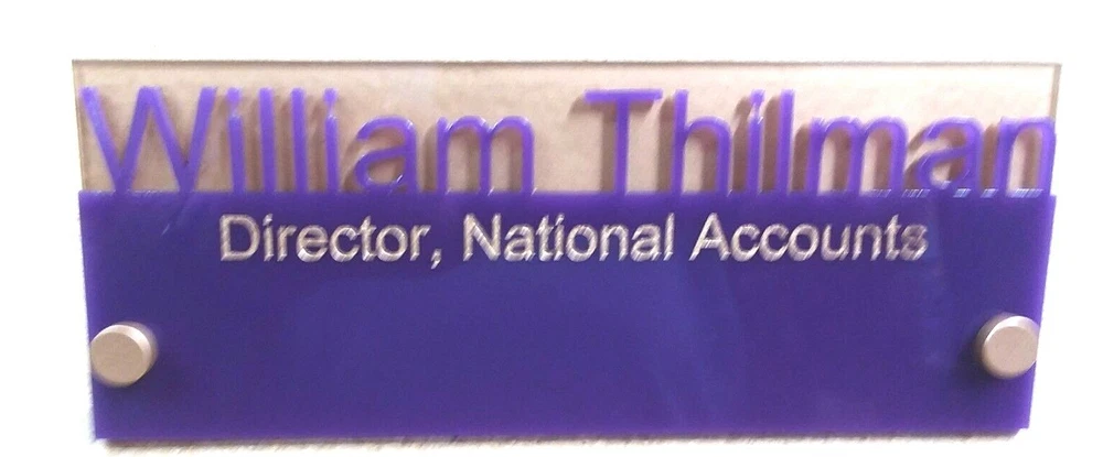 ACRYLIC GLASS DESK NAMEPLATE UPSCALE with STANDOFFS. Custom personalized with your name and title. 8" long by 3" high. Solid .125 acrylic glass two piece construction. Top letters are individually cut. Lower line is engraved and filled with silver or gold. Shown in black over grey with silver fill. Color combinations can be red, blue, yellow, grey, black, white, brown, green, clear and several more. Custom designs available. Put your name, title, colors and preferred Font in the "Note To Seller" section in the checkout area. We will contact you by email to confirm and make sure you get exactly what you order. Quantity Discounts available. See our other listings for more unique designs and styles.