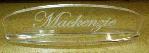 ACRYLIC GLASS DESK NAMEPLATE Custom personalized with your name and title. 8" long by 1 1/2" high. Solid .250 ( 1/4" thick ) acrylic glass one piece construction. Custom designs available. Put your name, title and preferred Font in the "Note To Seller" section in the checkout area. We will contact you by email to confirm and make sure you get exactly what you order. Quantity Discounts available. See our other listings for more unique designs and styles.