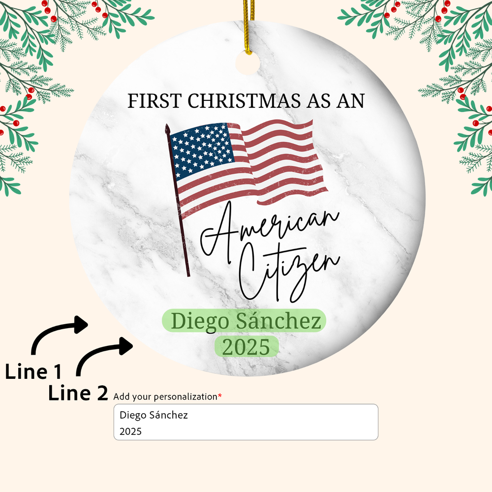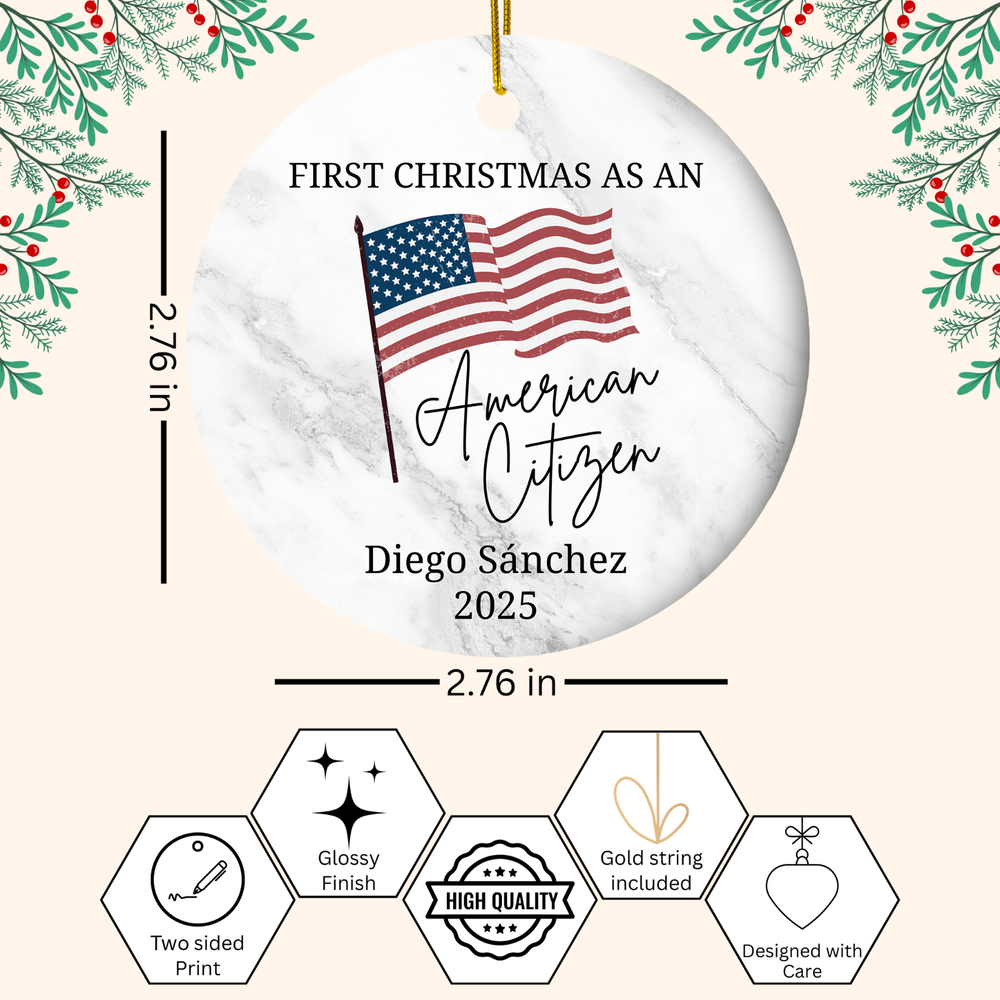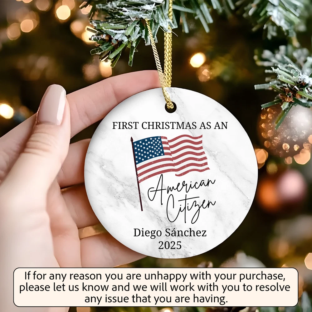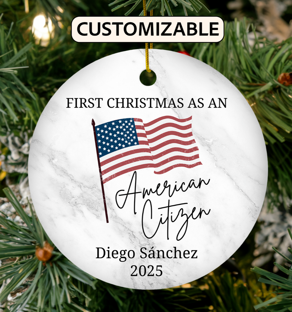 Celebrate the year you became an American citizen with this personalized ornament! After years of hard work and dedication, you’ve achieved your dream—now commemorate this milestone with a special keepsake. It also makes a thoughtful gift for a spouse, friend, or family member who has recently gained their citizenship. Personalized Design: Add your name and date to create a one-of-a-kind keepsake that's uniquely yours. Perfect Gift: A thoughtful and cherished choice for that recently became a citizen. Versatile Use: More than just a tree ornament! Display this beautiful keepsake in your home year-round as a lasting reminder of your special day. Our ‘Citizenship.’ ornament is more than just a decoration—it's a heartfelt keepsake, symbolizing the continuation of your journey in America. Each ornament is meticulously crafted to capture the joy and happiness of your first holiday season as a new citizen of America. ❤️ Ordering Instructions: Please use the customize button to place an order. Fill in the personalized text that is highlighted and add it to your cart. ❤️ Cancellation, refund and exchange: ➤ Refunds and Exchanges are not accepted unless the item defected or wrongly sent. ➤ Please contact us if you have problems with your order. We would be very happy to solve it. ❤️ Material Description: .: 0.125" (3mm) thick high-quality ceramic .: Glossy finish .: One-sided print .: Hole and gold-toned hanging string included ❤️ Processing time: 1-2 business days Please notice that the processing time is not included shipping time. Depending on orders that is being handled at a time. There can be a short waiting time until the final personalized order is confirmed and double checked before starting the print. Please be aware that we will work as fast and delicate as we possibly can. The processing time and shipping time may be longer due to the high demand Christmas holiday.