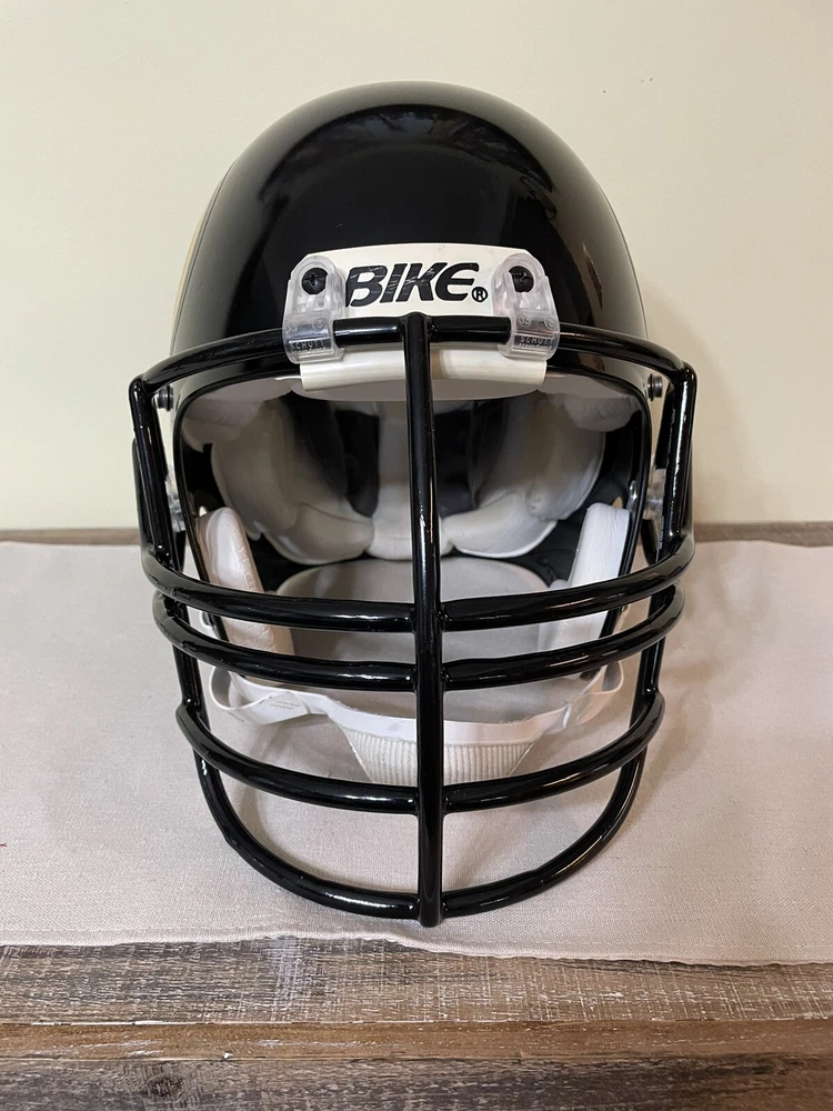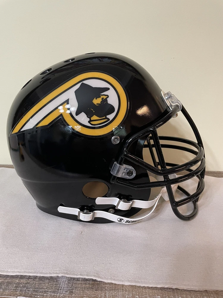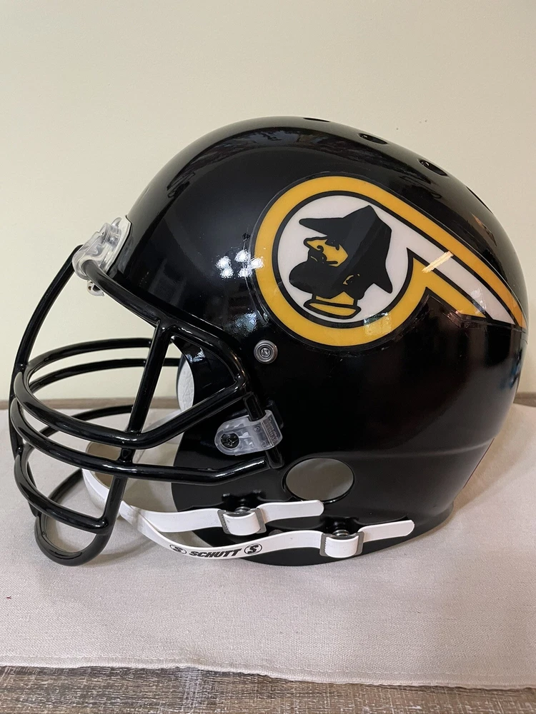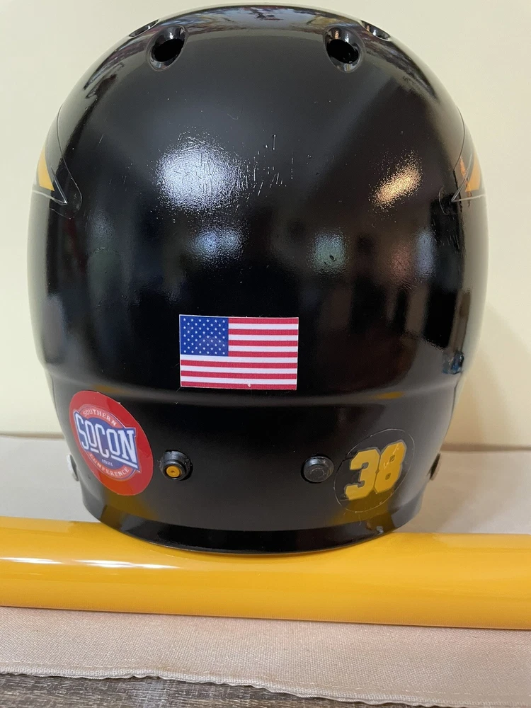 Custom Appalachian State Football Helmet 1983-1988 Dino Hackett style. From the Mack Brown and Sparky Woods era. Helmet is gloss black and has the full cage face mask like Dino Hackett wore. Get this helmet for your tailgate, office and/or man cave! Ships to US only-lower 48.