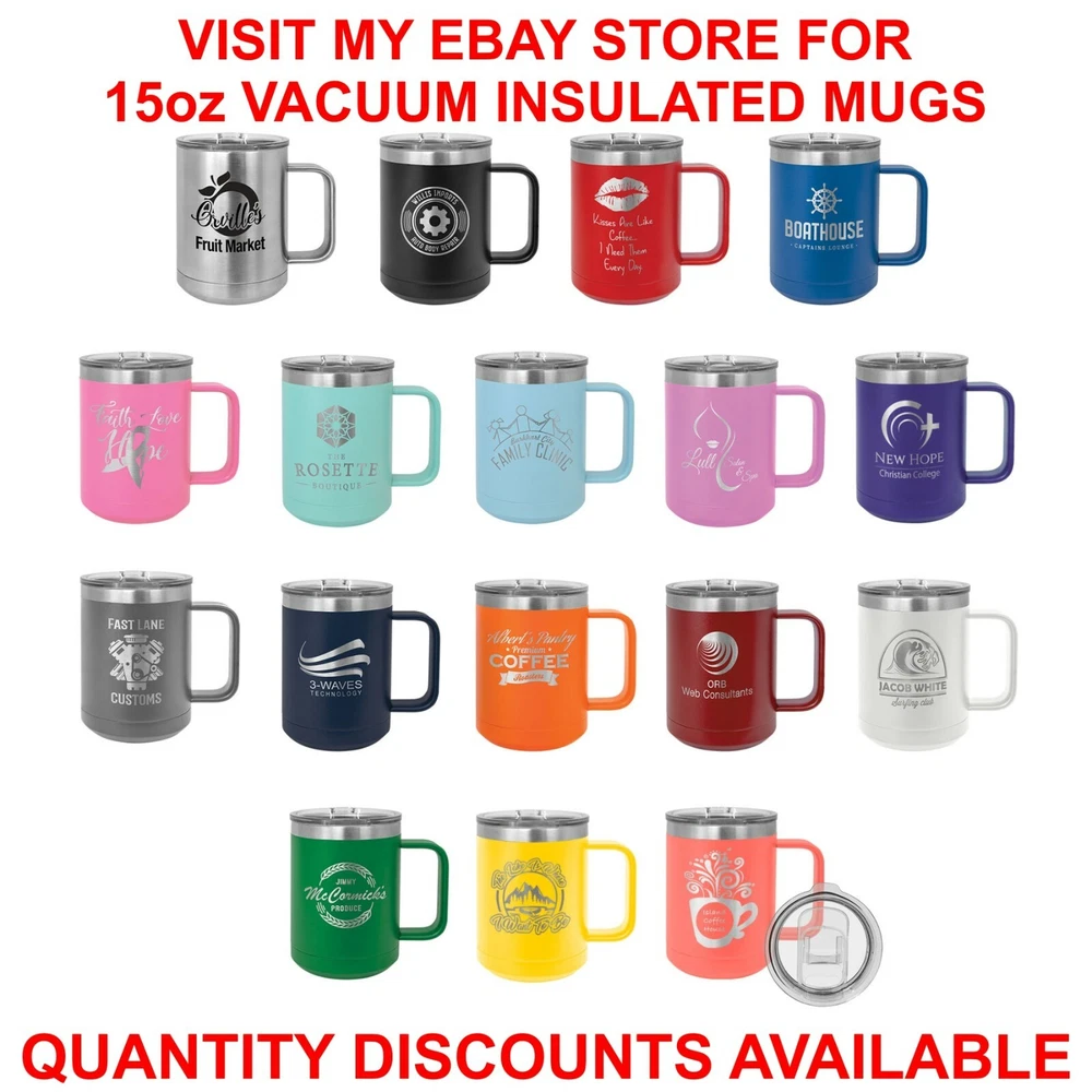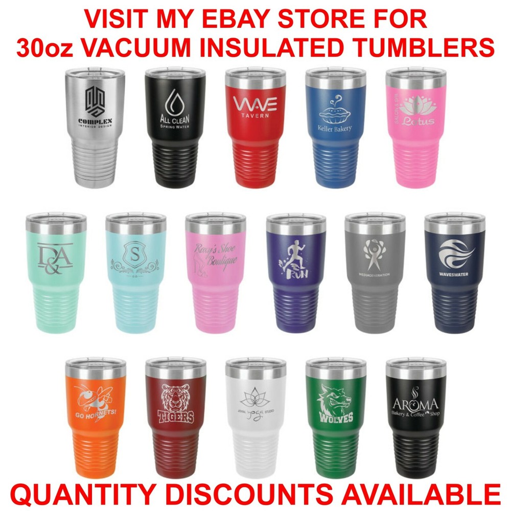 THIS IS NOT A YETI TRAVEL MUG - THIS A KNOCKOFF BRAND CALLED POLAR POLAR TRAVEL MUGS PREFORM JUST AS GOOD AS YETI THIS LISTING IS FOR INDIVIDUAL - 30oz POLAR BRAND VACUUM INSULATED TRAVEL MUGS ENGRAVED WITH BUSINESS LOGO OR DESIGN OF YOUR CHOICE YOU CAN EMAIL US A DESIGN OR WE WILL DESIGN IT FOR YOU JUST DESCRIBE WHAT YOU WANT AND WE WILL SEND YOU A LAYOUT FOR YOU TO APPROVE WE HAVE LOTS OF CLIP ART TO CHOOSE FROM OR YOU CAN SEND US ARTWORK & CLIPART For More Items Click to Visit My eBay Store: Laser-Etch-USA QUANTITY DISCOUNTS AVAILABLE CONTACT SELLER TO FOR ORDERS OVER 5 TO RECEIVE DISCOUNT PRICING PRODUCT DESCRIPTION Travel mugs are made of high grade stainless steel. Black powder coated. Double walled, vacuum sealed for over 12 hours of cooling capability. Comes with rubber sealed press on lid. Travel mugs are laser engraved, not screen printed. The engraving will not ware or fade with time. The engravings appear a grey(silver) in color. Black or gray scale engravings only. No color available. Can engrave almost any design you like. Mug size with lid is 7..75" tall with 4" rim and 2.75" base. HOW TO ORDER Input the quantity want to purchase. Sold individually. Contact seller if interested in quantity discounts. Click "Buy It Now". Once order is placed you can send a message with your paypal payment or send it through Ebay messages with the personalized information for your design. If we don't see your message, we will contact you. Travel mugs do not all have to be the same. Each mug can have its own design. Quantity discount mugs must have same design, but can have different names. You can send us clipart, logo, or your own design if you have something specific in mind. There is different fonts to choose from. See the picture listings for available fonts and some available designs. We will send you your layout for approval before engraving and shipping. TERMS AND CONDITIONS We only accept payment through Paypal. If payment is not recieved within 7 days, we have the right to cancel the transaction and file for a non-paying bidder. If your order is returned , a charge may be issued to reship your item. All orders will be shipped in 3-5 business days SHIPPING Shipping is done by US mail or other parcel delivery service. We reserve the right to choose which method of shipping to use in order to best serve you. We ship Monday-Saturday. Rush orders are welcome, but please let us know what date you need it by. BY BIDDING THIS AUCTION YOU ARE AGREEING TO OUR TERMS AND CONDITIONS ABOVE AND EBAY POLICY