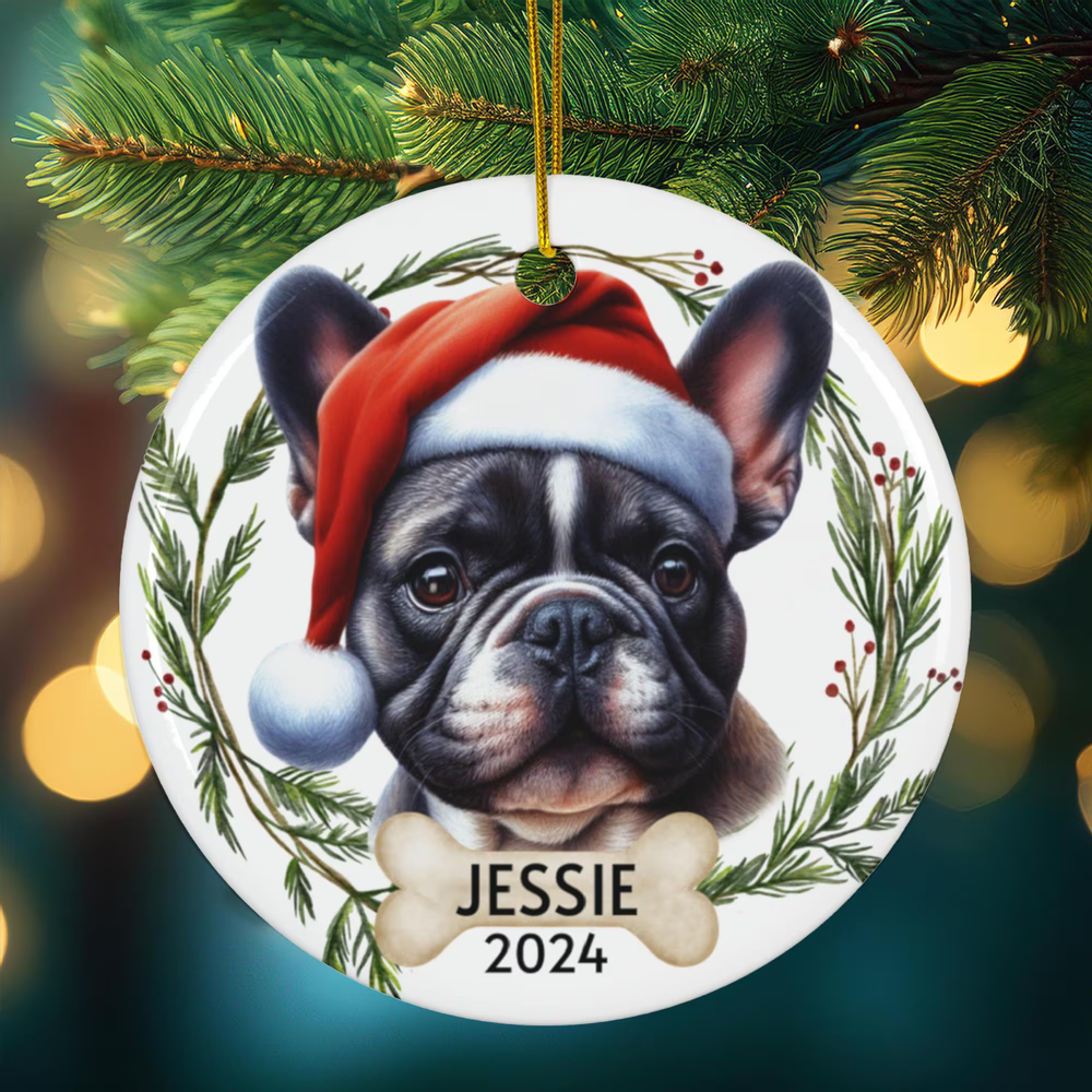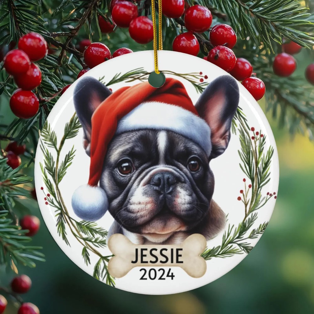 Celebrate your Boston Terrier this holiday season with a personalized dog ornament! Featuring an adorable Boston Terrier wearing a festive Santa hat and surrounded by a holiday wreath, this ceramic ornament is the perfect keepsake for any dog lover. Customized with your pet's name and the year, it makes a charming addition to your Christmas decor or a thoughtful gift for any Boston Terrier parent. Made from high-quality ceramic Approximately 3 inches in diameter Includes a gold string for easy hanging Features a Boston Terrier with a festive wreath and Santa hat Customizable with your pet's name and year on a bone tag Ideal as a holiday keepsake, pet lover gift, or Christmas decor