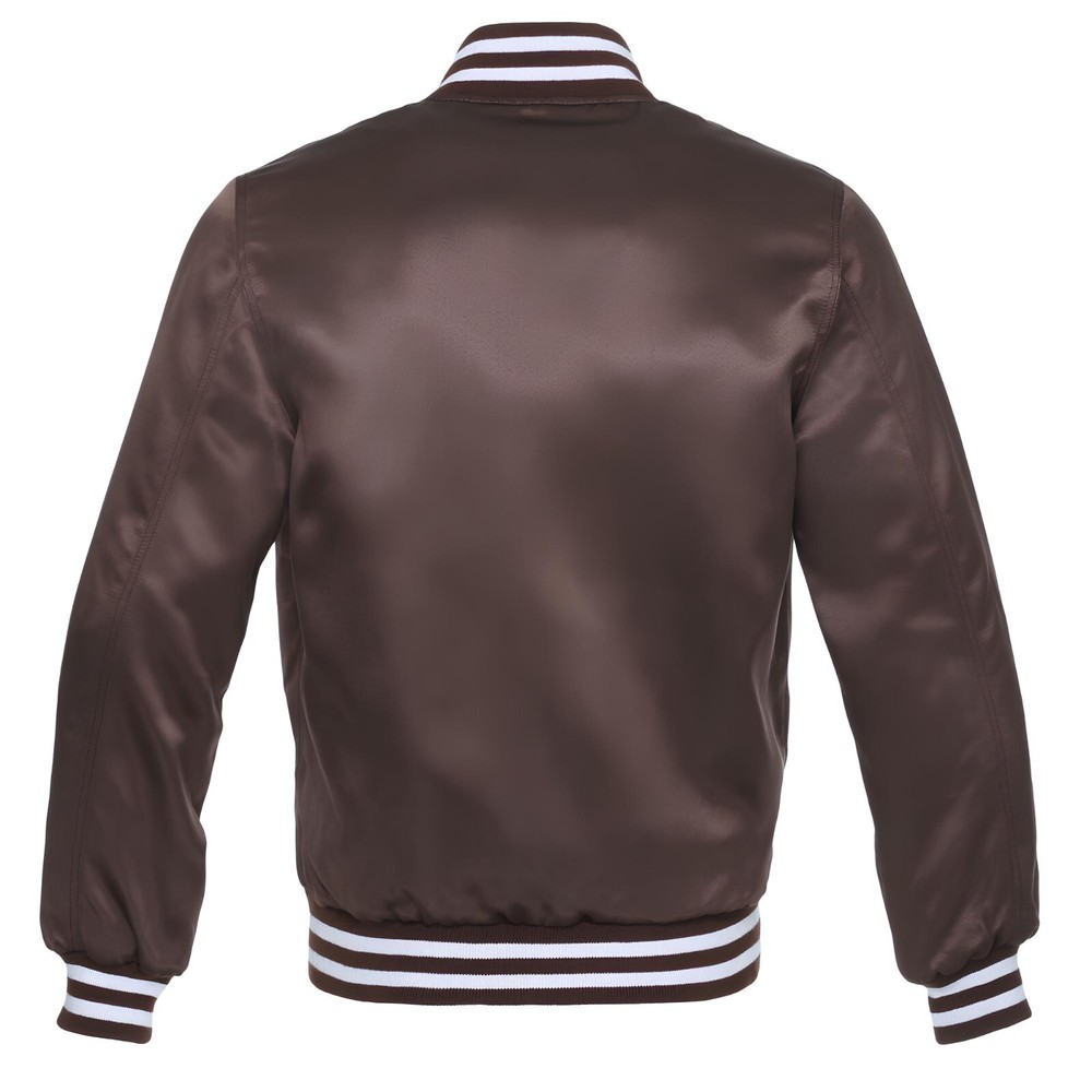VARSITY/BASEBALL JACKET Brown Satin - Baseball Jacket Varsity Jacket Letterman Jacket – Available in All Sizes We specialize in crafting personalized jackets featuring intricate embroidery and custom patches, designed to perfectly match your style and specifications. Product Description : This listing is for a beautiful well made Authentic Letterman Jacket Comes with Satin Specification : The varsity jacket is expertly crafted from premium-quality 100% satin for both the body and sleeves, ensuring a sleek and stylish finish. Varsity Jacket with 2 Front Side Pockets and 1 Interior Pocket Polyester Quilted Padded Lining for Superior Warmth and Insulation Soft-Shell Rib Knit Cuffs, Collar, and Bottom for Skin Protection We are confident that the exceptional quality and remarkable design of our products will exceed your expectations.