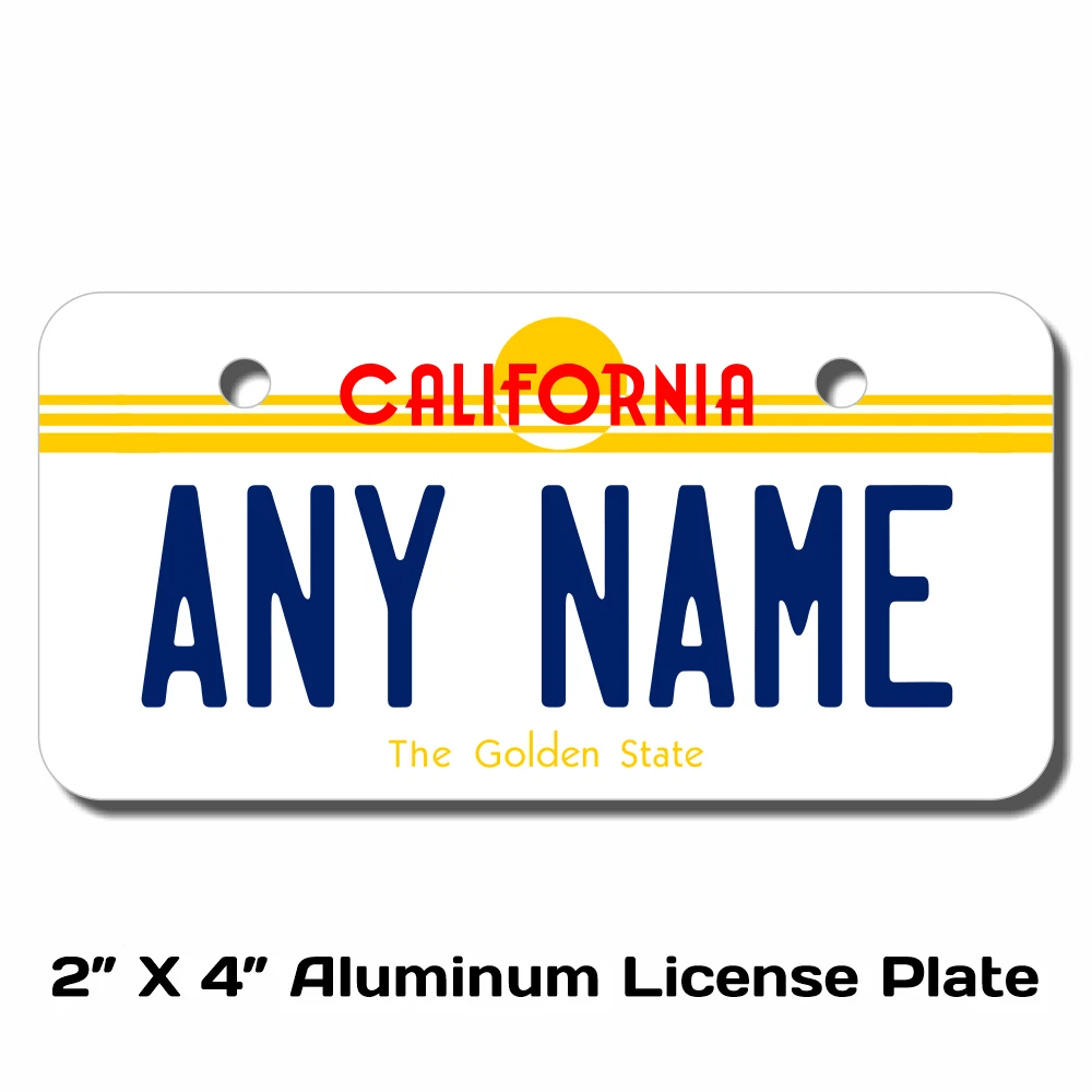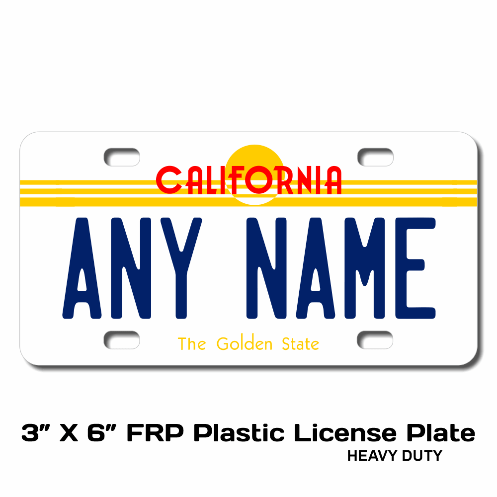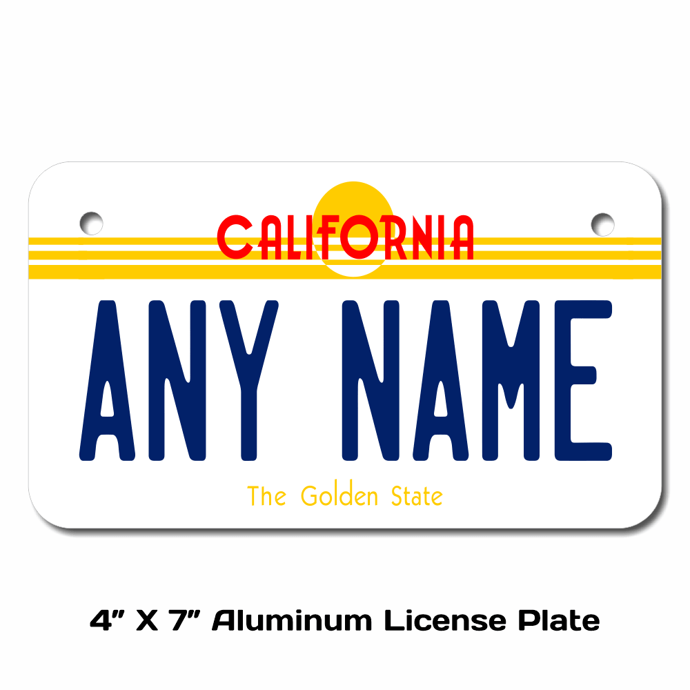 Made in the USA 5 Sizes to choose from. See size chart (Photo) for sizes and most common uses Free RUSH production. Order today and we will print and have your custom plate ready to ship on the next business day FREE economy shipping - Upgrades available at checkout Full color print, durable and UV resistant Print is flat. Letters are not raised or embossed Print is durable. Will not peel (Not a decal) Novelty item. Not intended for official motor vehicle registration US State plates offered with CAPITAL letters only For best results limit to 12 letters and or spaces, No Emoji's, No Special Characters. Font supports normal letters, numbers and standard punctuation. Printing Methods: Aluminum Plates & Keyring (UV Inkjet Printing) - Plastic Plate (Sublimation) How to order: Choose Your Plate Size. Add Item to cart. Checkout. I MPORTANT!! As soon as you complete your purchase you must use eBays "Contact Seller" feature to send us a message with the name or text that you want printed on your plate. We will need this information right away so that we can create your custom plate. Finding Your Plate Size We highly recommend that you measure the area where you would like to place a license plate and then order the appropriate size. We have included an image with a guide for common size usages, however this is only a guide. You must be sure of the size that you need for your specific application as these are custom made items and cannot be returned or exchanged. These are high quality plates and are nothing like the ones you find in a gas stations or at Walmart. The plates are professionally printed using only the best professional printing methods that the professional printing industry can provide. Our Aluminum plates are printed using Super Durable UV Inks. The print is actually dried and cured using UV light for a long lasting beautiful print. Our Plastic License Plate and or Plastic Key Ring are printed using sublimation process. The inks are heated to a very high heat and the pigments dye the surface of the plate. These inks are UV resistant. There are many uses for these plates, just to mention a few: Bikes, Bicycles, Carts, Wagons, Golf Carts, Electric Cars, Wheel Chairs, Walkers, Motorcycles, Cars, Trucks, Boats, Door Signage, Cubicle Signage, Kid's Room Door Signs, Garden Sign, Mailbox Sign, Scooters, Mopeds, Mini Electric Cars, Tricycles Please Note: These plates are novelty vanity plates. These plates are not officially issued registration plates issued by your State government and are not intended to replace the official registrations plates on your motor vehicle. License Plate Sizes - When you are trying to determine which plate size to buy, we recommend that you use a ruler or tape measure to measure the are where you would like to attach your plate and then order the appropriate size. 2" x 4" Aluminum: This is a .032 thick aluminum blank with a full color UV Ink imprint on the plate. The plate has 2 holes pre-cut in the top side of the plate. This size is great for mini electric cars, tricycles and even for use as a sign on kid's room doors or on workplace cubicles. You are only limited by your imagination. 3" x 6" FRP Plastic: This is a heavy duty, sturdy, rigid fiberglass reinforced plastic plate printed in full color using the sublimation process. The plate has 4 holes pre-cut as shown in the example. This size is great for bikes, bicycles, ATVs, scooters, walkers, golf carts and even for use as a sign on kid's room doors or on workplace cubicles. 3" x 6" Aluminum: This is a .032 thick aluminum blank with a full color UV Ink imprint on the plate. The plate has 2 holes pre-cut in the top side of the plate. This size is great for bikes, bicycles, ATVs, scooters, walkers, golf carts and even for use as a sign on kid's room doors or on workplace cubicles. 4" x 7" Aluminum: This is a .032 thick aluminum blank with a full color UV Ink imprint on the plate. The plate has 2 holes pre-cut in the top side of the plate. This size is great for bikes, bicycles, ATVs, scooters, walkers, golf carts, motorcycles and even for use as a sign on kid's room doors or on workplace cubicles. 6"x 12" Aluminum: This is a .032 thick aluminum blank with a full color UV Ink imprint on the plate. The plate has 4 holes pre-cut 2 upper and 2 lower. This is the standard size for cars and truck in the United States ( This is a novelty plate and is NOT an official registration plate) 1.5" X 3" Keyring: This is a heavy duty, sturdy, rigid fiberglass reinforced plastic key ring printed in full color on 1 side using the sublimation process. Comes with metal split ring keyring and connector. California,license,plate,custom,personalized
