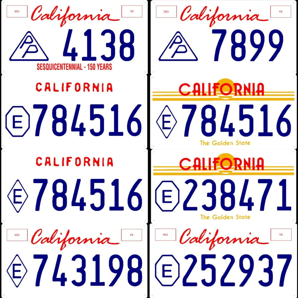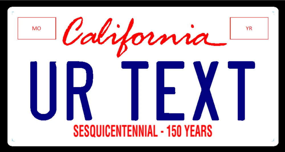 Custom reflective California license plates personalized with the text of your choice! All plates are made on site, no middleman. There are endless possibilities to creating your new custom plate! These plates use the authentic fonts and graphics for California. All plates are made with authentic, DVLA approved, British materials and their durability will hold up well over time. After payment is received you will be contacted to provide information for the creation of your custom plate. You will then receive a request for final design approval. After plate assembly, your order will be sent out within one business day! Please note, these are flat plates and are NOT embossed! The oblong size is 520mm ˟ 111mm (20.5in ˟ 4.4in) and the square size is 305mm ˟ 152mm (12in ˟ 6in). Plates will not come with mounting holes! Custom stickers are also available for applicable license plates at minimal additional cost. PLATE DESCRIPTIONS Flexible Reflective Sheet Only: * DISCONTINUED 27 JUNE 2022* A single reflective sheet with your design overlaid on top. This option does not include a solid base and therefore is very flexible -- ideal for mounting on uneven surfaces! Reflective Plate With Plastic Base: A thick plastic base with your design on top and a relective sheet in between. Recommended for most North American plate designs. Reflective Plate With Acrylic (Plexi) Base: A clear acrylic plate with your design sandwiched between it and a reflective sheet underneath. Recommended for most western European designs. If you are not completely satisfied with your new custom plate, we will exchange a remake at no additional cost! Returns available for up to 60 days. If you have any questions, feel free to contact us before purchase. DISCLAIMER: THESE ARE FOR NOVELTY AND COLLECTING PURPOSES ONLY AND ARE NOT INTENDED FOR LEGAL ROAD USE! PLEASE CHECK YOUR LOCAL LAWS BEFORE PLACING ANY CUSTOM PLATE ON YOUR VEHICLE!