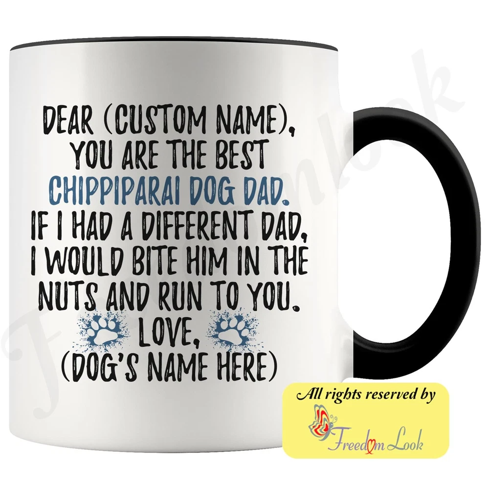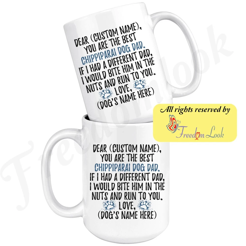 personalized chippiparai dog mug, kanni dog coffee mug, chippiparai dog gifts, chippiparai dad present gift, chippiparai dog daddy mug, chippiparai dog owner, i love chippiparai, custom chippiparai gift, dog coffee cup, fathers day gift Are you looking for a great, unique and personalized gift for a dog owner? Search no more and get this mug TODAY. They will be thankful forever. Don't miss it because you'll regret it later by not getting it. This is the perfect coffee mug with content "DEAR 'CUSTOM NAME', YOU ARE THE BEST CHIPPIPARAI DOG DAD. IF I HAD A DIFFERENT DAD, I WOULD BITE HIM IN THE NUTS AND RUN TO YOU. LOVE, 'DOG'S NAME HERE' ". CUSTOM DAD'S NAME AND DOG'S NAME Please put the dad's and dog's name in the notes at the checkout or just send us a message. By not doing this, it will delay your order. Example: Dad's name: Bill; Dog's name: Charlie A PERFECT FUNNY GIFT FOR A CHIPPIPARAI DOG DAD! This special coffee cup can be a great gift for every Chippiparai dog dad. Sizes: Colored coffee mug size: 11 oz White coffee mug size: 11 oz or 15 oz DISHWASHER AND MICROWAVE SAFE! This version of ceramic mug shows it's true colors with quality assurance to withstand heat in the microwave and put it in the dishwasher as many times as you like, the quality will not be Altered. THE MUG DESIGN IS PRINTED ON BOTH SIDES! No matter if you hold your teacup in your right or left hand, you and everyone else will be able to see this unique design. Looking at this cute coffee mug will put a smile on everyone's face! We want you to be 100% satisfied, so please let us know if there is anything wrong with your order so we can fix it right away. We truly offer the most stunning, unique and trendy highest-quality products in the world. All of our products are custom-made-to-order and handcrafted to the highest quality standards. We stand by our products the quality is outstanding rest assured. Triple check your address , we copy addresses exactly as written, any undeliverable orders due to customer error are not our responsibility. Mug for every day. Christmas birthday brother sister mom mother father dad aunt grandma grandpa girlfriend gift