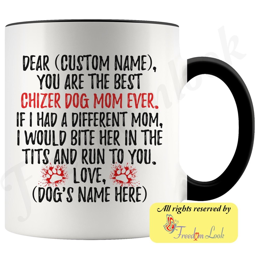 personalized chizer dog mug, schnauchi dog coffee mug, schnizer dog gifts, chizer mom present gift, chizer dog mommy mug, chizer dog owner, i love chizer dog, custom chizer dog gift, dog coffee cup, cross-breed chihuahua & mini schnauzer, mothers day gift Are you looking for a great, unique and personalized gift for a dog owner? Search no more and get this mug TODAY. They will be thankful forever. Don't miss it because you'll regret it later by not getting it. This is the perfect coffee mug with content "DEAR 'CUSTOM NAME', YOU ARE THE BEST CHIZER DOG MOM EVER. IF I HAD A DIFFERENT MOM, I WOULD BITE HER IN THE TITS AND RUN TO YOU. LOVE, 'DOG'S NAME HERE' ". CUSTOM MOM'S NAME AND DOG'S NAME Please put the mom's and dog's name in the notes at the checkout or just send us a message. By not doing this, it will delay your order. Example: Mom's name: Emma; Dog's name: Charlie A PERFECT FUNNY GIFT FOR A CHIZER DOG MOM! This special coffee cup can be a great gift for every Chizer dog mom. Sizes: Colored coffee mug size: 11 oz White coffee mug size: 11 oz or 15 oz DISHWASHER AND MICROWAVE SAFE! This version of ceramic mug shows it's true colors with quality assurance to withstand heat in the microwave and put it in the dishwasher as many times as you like, the quality will not be Altered. THE MUG DESIGN IS PRINTED ON BOTH SIDES! No matter if you hold your teacup in your right or left hand, you and everyone else will be able to see this unique design. Looking at this cute coffee mug will put a smile on everyone's face! We want you to be 100% satisfied, so please let us know if there is anything wrong with your order so we can fix it right away. We truly offer the most stunning, unique and trendy highest-quality products in the world. All of our products are custom-made-to-order and handcrafted to the highest quality standards. We stand by our products the quality is outstanding rest assured. Triple check your address , we copy addresses exactly as written, any undeliverable orders due to customer error are not our responsibility. Mug for every day. Christmas birthday brother sister mom mother father dad aunt grandma grandpa girlfriend gift