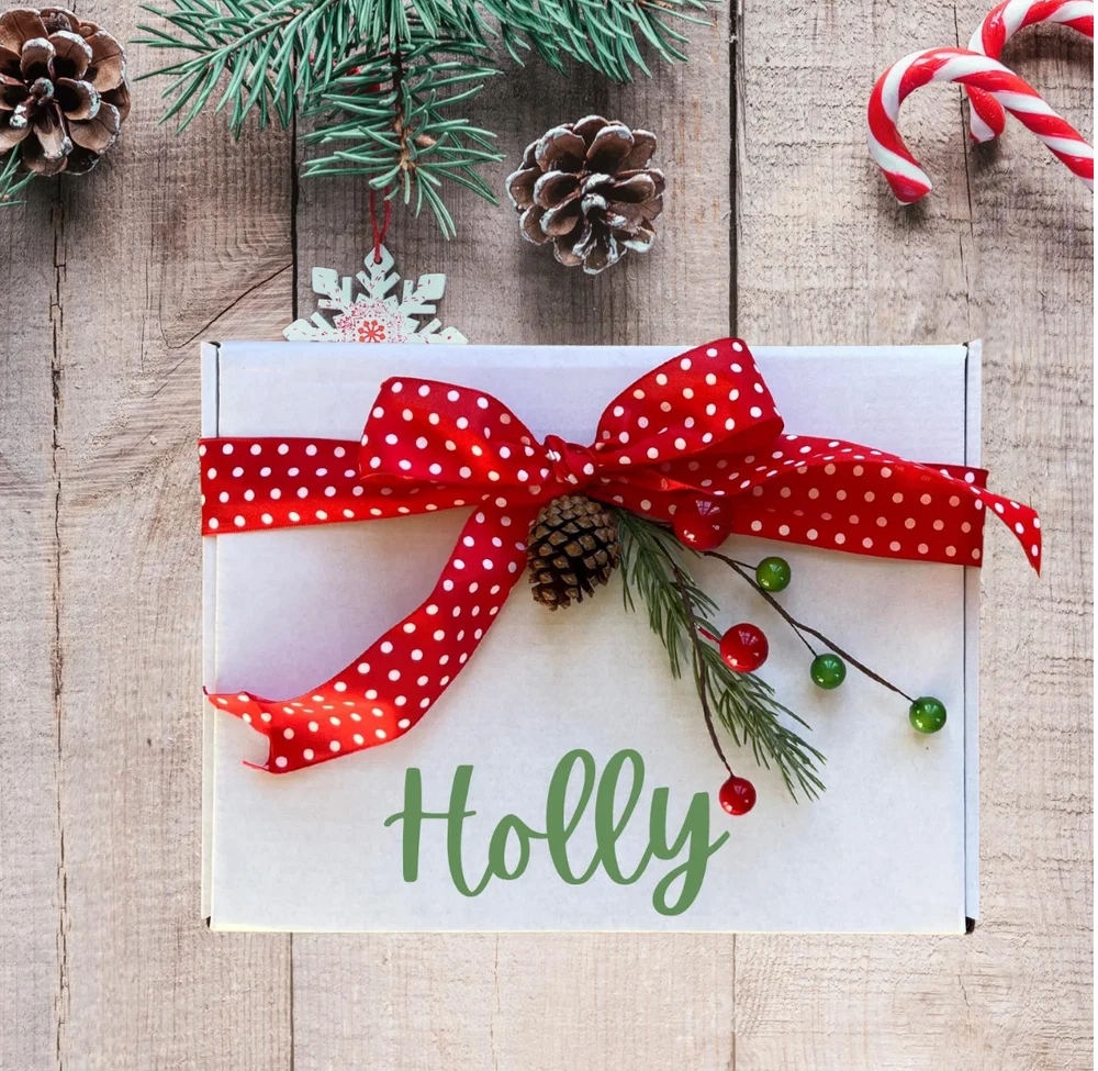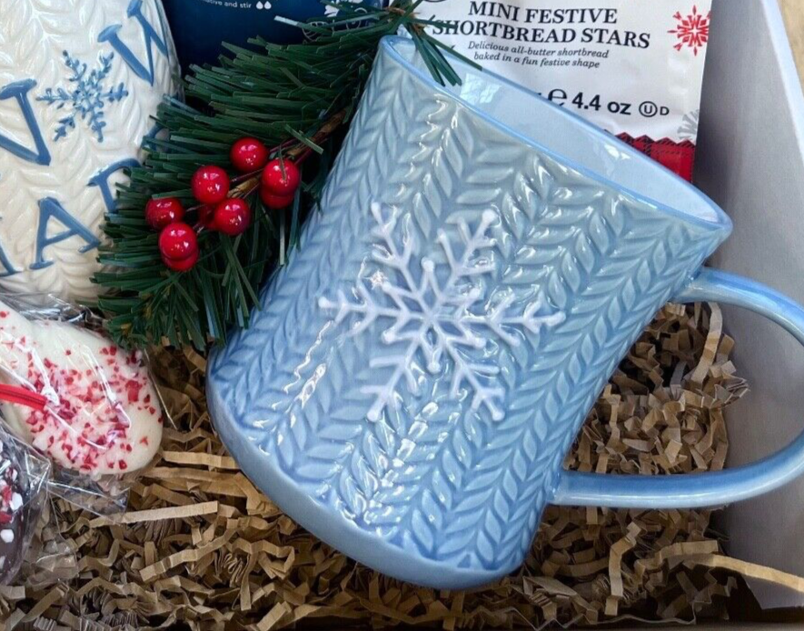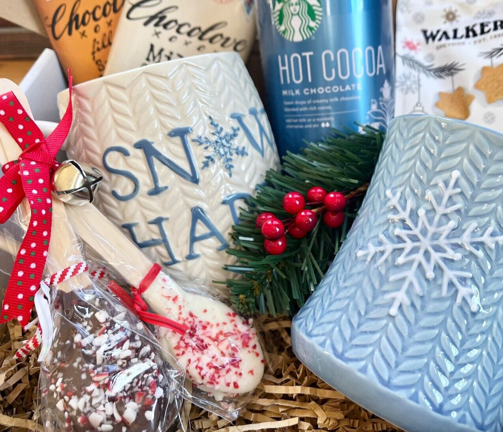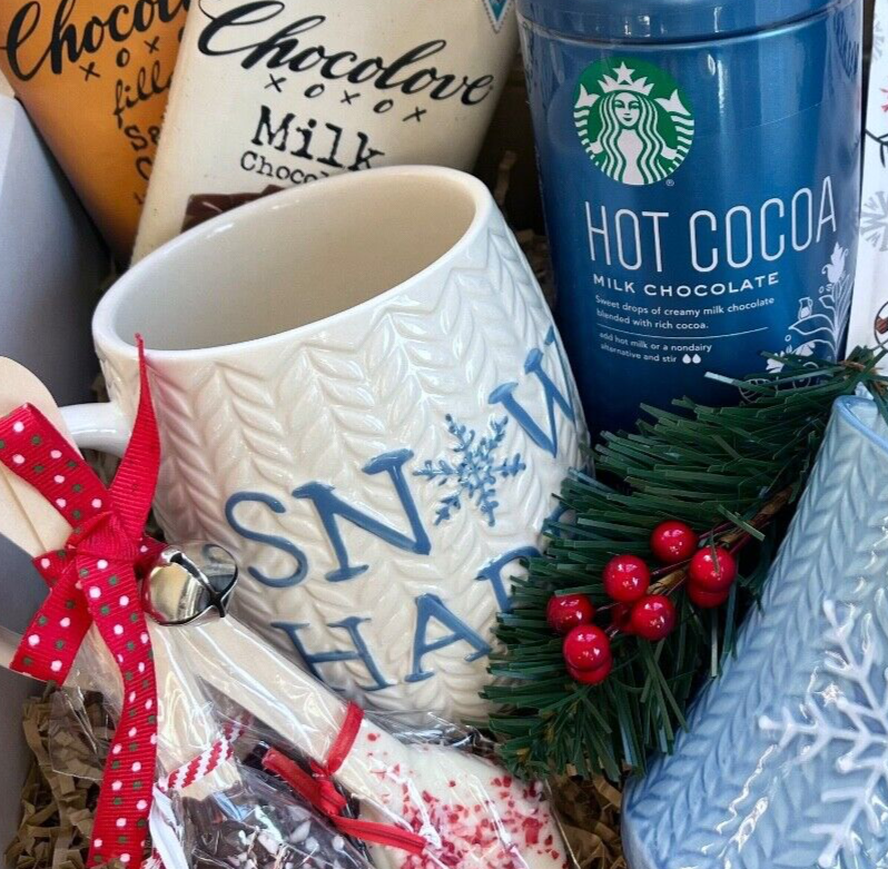 Get into the holiday spirit with this personalized Christmas gift basket. The basket includes a variety of festive treats such as chocolate bars, hot cocoa, 2 matching mugs, short bread cookies, and chocolate peppermint spoons. The recipient of this gift basket can enjoy the winter character theme and add their own personal touch to the gift box with the included personalization this will make it the perfect gift. This gift basket is perfect for anyone looking for a holiday gift that will bring joy to their home. The multicolor treats and holiday theme make it a great addition to any Christmas decor. Order now and add this special touch to your Christmas gifts this year! Be confident that your item will be packed and shipped with the care that was put into making this beautiful holiday piece. Don't wait long as it will disappear quickly. All of my items are cross listed.