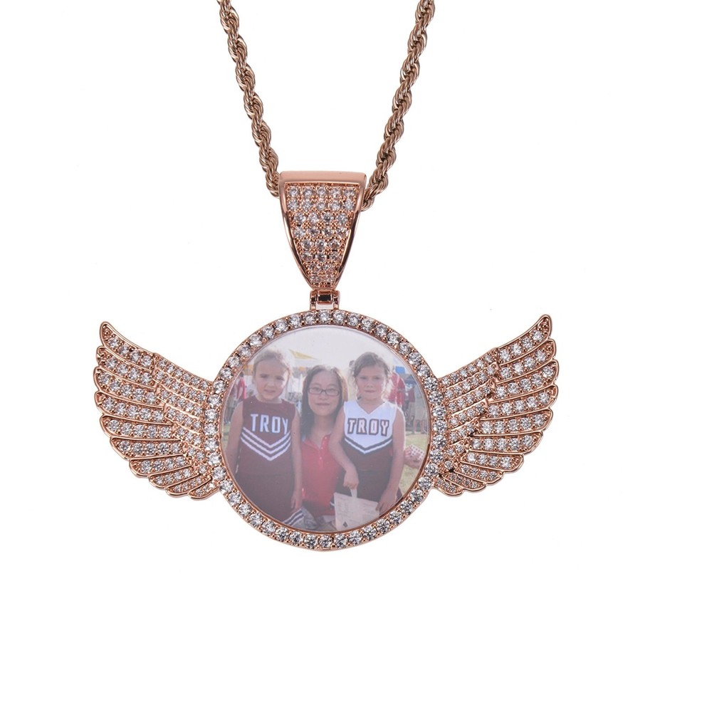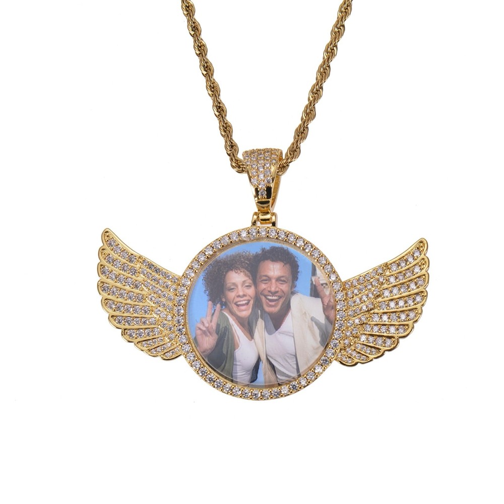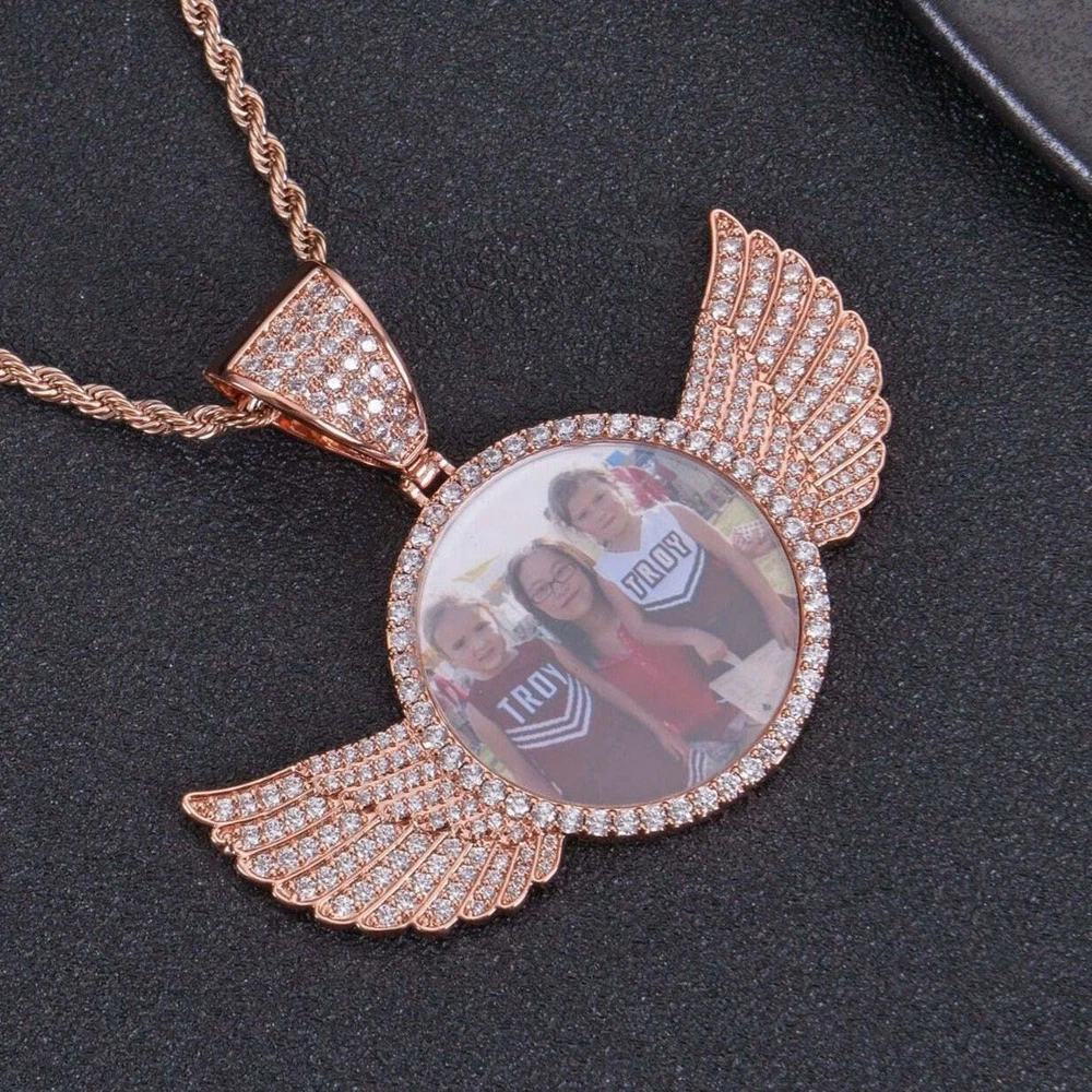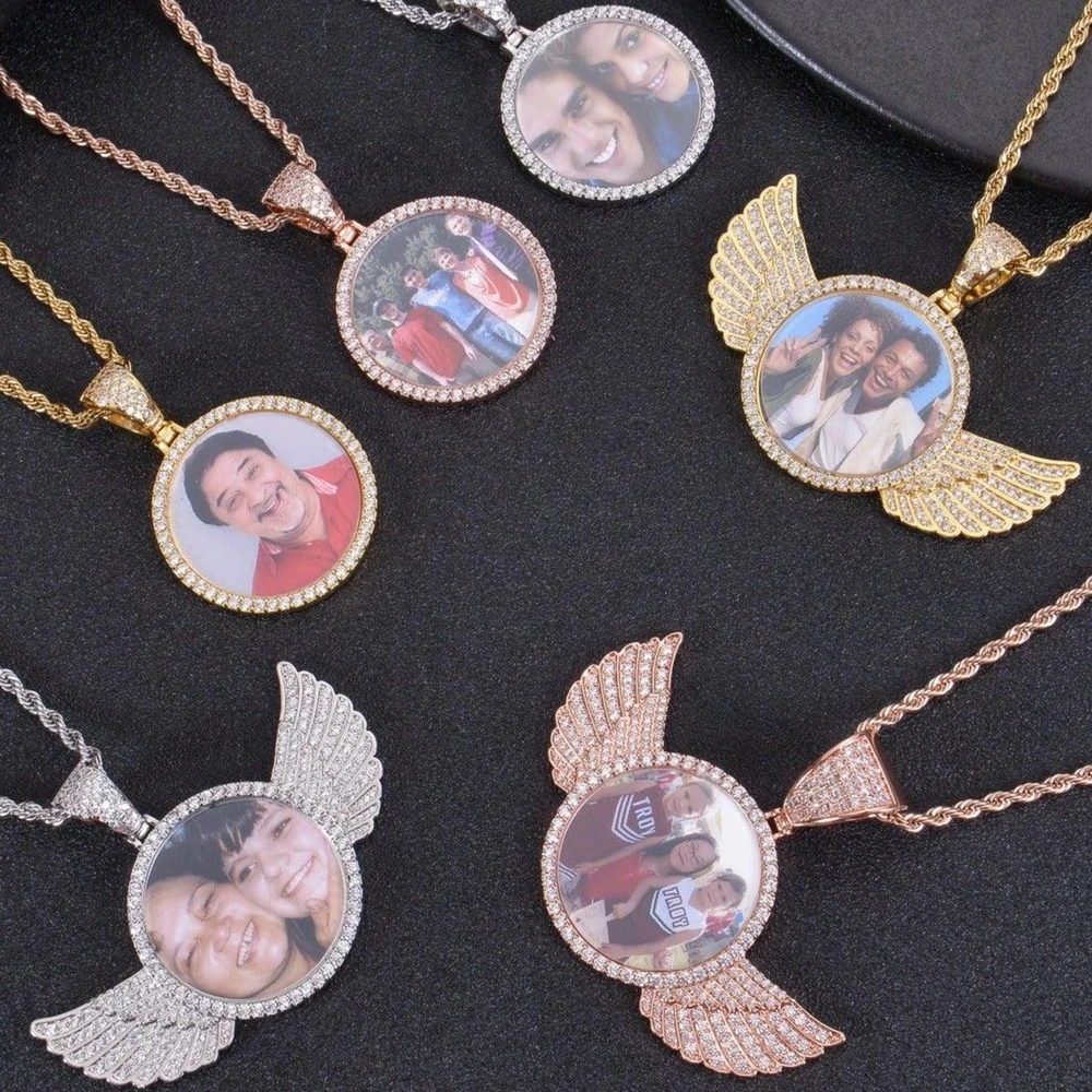 Once you place your order, please message us your image and text on EBAY. Enter Text Up To 30 Characters for the Back of the Pendant and Length of the Necklace(18, 20, 22, 24 Inches). For Example: I love you, 18 Very Affordable, and the Very Detailed Photo Necklaces: Our personalized diamond studded angel wings photo necklace pendants are very affordable and very detailed photo pendants in the market. Our price and quality are unmatched. β€β€ Engraving that Lasts: The engraving method used in these angel wings photo necklace ensure that these charms will never fade away. ππ Personalized Charm: Each hip hop photo locket necklace is carefully personalized to perfection according to the photo and text uploaded. β€β€ Perfect Gift: These custom diamond picture necklaces are perfect gift for any occasion and are sure to bring the happiness to the receiver. ππ Available in Gold & Silver: Whether you need photo pendant gold or photo pendant silver, we have got you covered. β β Free Necklaces: All of the iced custom round photo pendants come with free 3.5 mm thick necklaces or chain sizing from 18 inches to 24 inches length. ππ Your loved Ones Close to Your Heart: Your beautiful memories and your loved ones will now forever be close to your heart through these photo pendant charm. π₯°π₯° Necklace Length: 18-24 Inches Gift Box Included: Yes Image: Are multiple people allowed in the image? Yes Will background be removed during production? Yes Text: Maximum allowed characters(Back): 30 Are emojis and special letters allowed? Yes Does it tarnish or change colors? No. The materials used in the necklace/pendant ensures that it will not tarnish or change colors. How long will the engraving last? If proper care is taken, it will last forever.