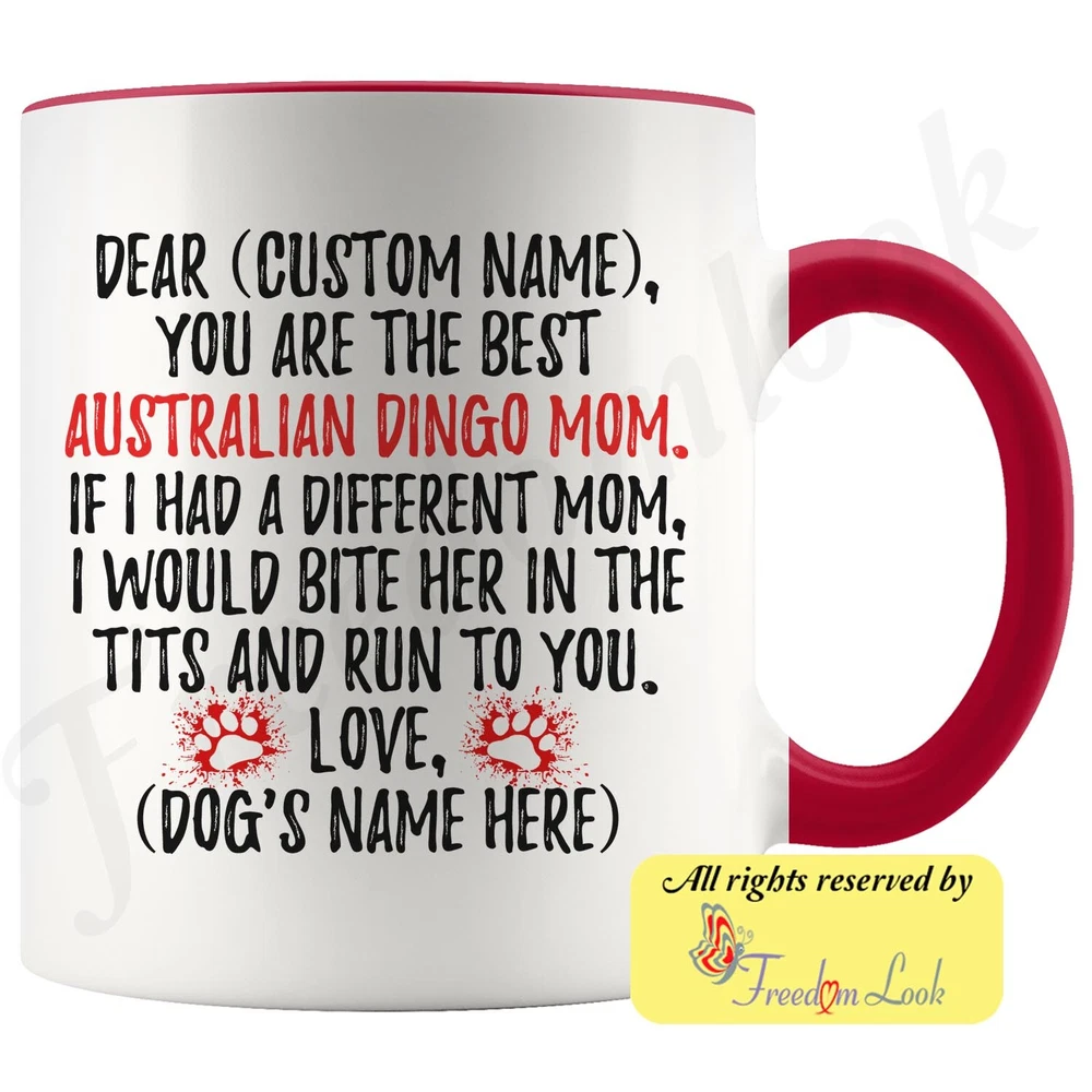 personalized dingo dog mug, australian dingo coffee mug, australian native dog gifts, maliki dog mom present gift, warrigal dog mommy mug, noggum dog owner, i love dingo, custom dingo gift, dog coffee cup, mothers day gift Are you looking for a great, unique and personalized gift for a dog owner? Search no more and get this mug TODAY. They will be thankful forever. Don't miss it because you'll regret it later by not getting it. This is the perfect coffee mug with content "DEAR 'CUSTOM NAME', YOU ARE THE BEST AUSTRALIAN DINGO MOM. IF I HAD A DIFFERENT MOM, I WOULD BITE HER IN THE TITS AND RUN TO YOU. LOVE, 'DOG'S NAME HERE' ". CUSTOM MOM'S NAME AND DOG'S NAME Please put the mom's and dog's name in the notes at the checkout or just send us a message. By not doing this, it will delay your order. Example: Mom's name: Emma; Dog's name: Charlie A PERFECT FUNNY GIFT FOR A DINGO DOG MOM! This special coffee cup can be a great gift for every Australian Dingo dog mom. Sizes: Colored coffee mug size: 11 oz White coffee mug size: 11 oz or 15 oz DISHWASHER AND MICROWAVE SAFE! This version of ceramic mug shows it's true colors with quality assurance to withstand heat in the microwave and put it in the dishwasher as many times as you like, the quality will not be Altered. THE MUG DESIGN IS PRINTED ON BOTH SIDES! No matter if you hold your teacup in your right or left hand, you and everyone else will be able to see this unique design. Looking at this cute coffee mug will put a smile on everyone's face! We want you to be 100% satisfied, so please let us know if there is anything wrong with your order so we can fix it right away. We truly offer the most stunning, unique and trendy highest-quality products in the world. All of our products are custom-made-to-order and handcrafted to the highest quality standards. We stand by our products the quality is outstanding rest assured. Triple check your address , we copy addresses exactly as written, any undeliverable orders due to customer error are not our responsibility. Mug for every day. Christmas birthday brother sister mom mother father dad aunt grandma grandpa girlfriend gift