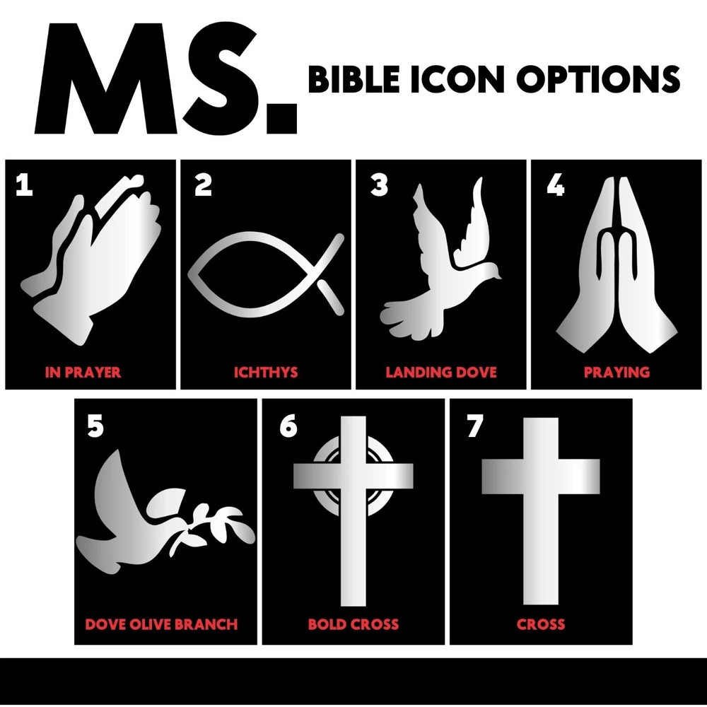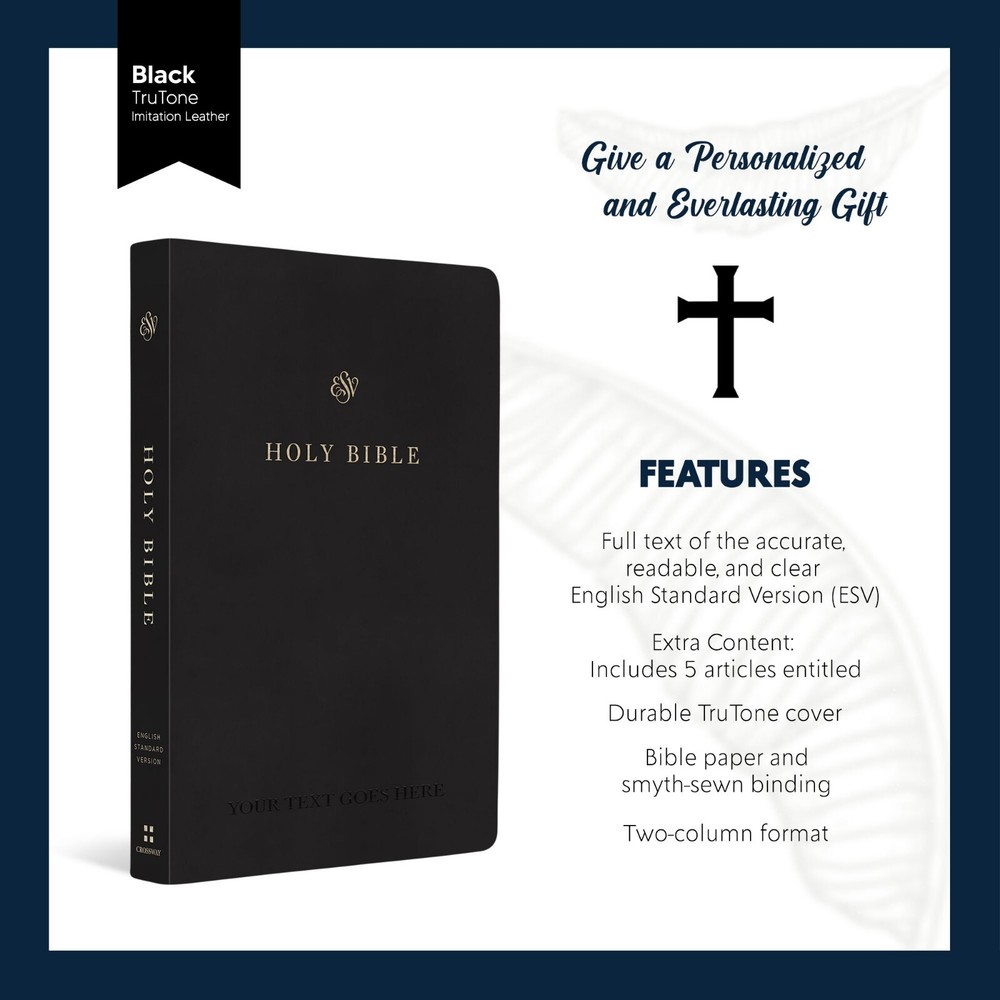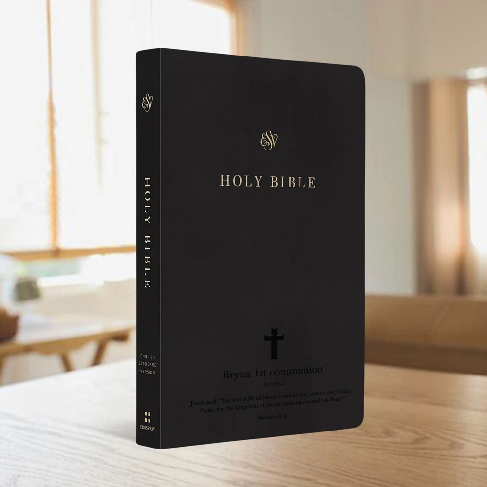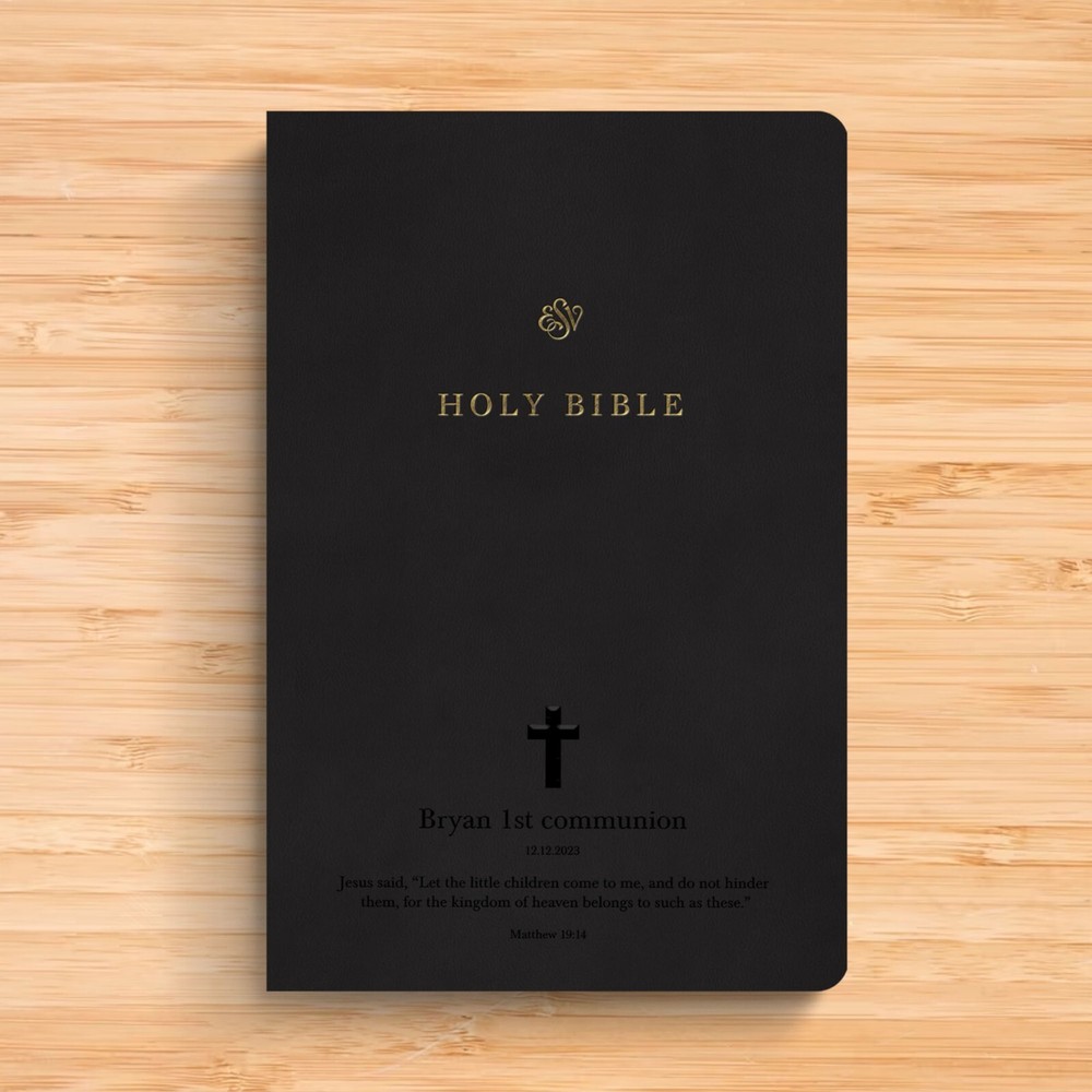 Discover the joy of owning a Bible that is uniquely yours – a testament to your faith, values, and personal journey. A personalized English Standard Version (ESV) Bible, a cherished keepsake that will illuminate your spiritual path and deepen your connection with God. ESV are known for it's accuracy and readability. Every word is carefully translated to preserve the original meaning and capture the heart of God's message to humanity. What sets this bible apart is the personal touch it bears, a bible with your name on the cover making it one-of-a-kind treasure. You can also choose from our pre-made icons to make it more special. It can also be a perfect Christian gift, be it for baptism, confirmation and even wedding. FEATURES: Personalization is debossed Measures 8.4" x 5.6" English Standard Version (ESV) Readable and Clear Two-column format Durable TruTone Cover Bible paper and smyth-sewn binding Ship fast from Florida Extra Content: Includes 5 articles entitled Individually crafted and shipped fast from South Florida, this Bible makes for an everlasting and meaningful gift. A personalized Bible can offer a unique opportunity to grow in faith and explore the depths of one’s beliefs. It is a piece of art that will forever remind them of the joys and blessings that were bestowed upon them during that special day.