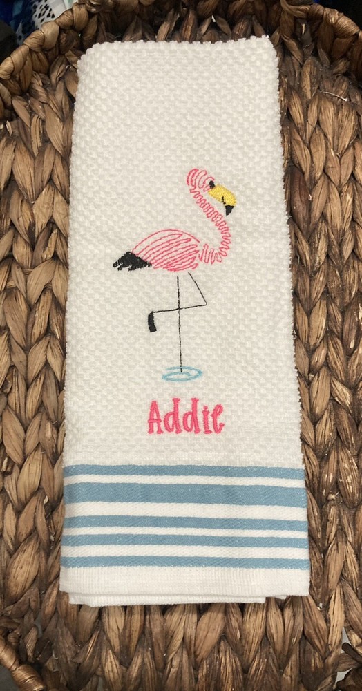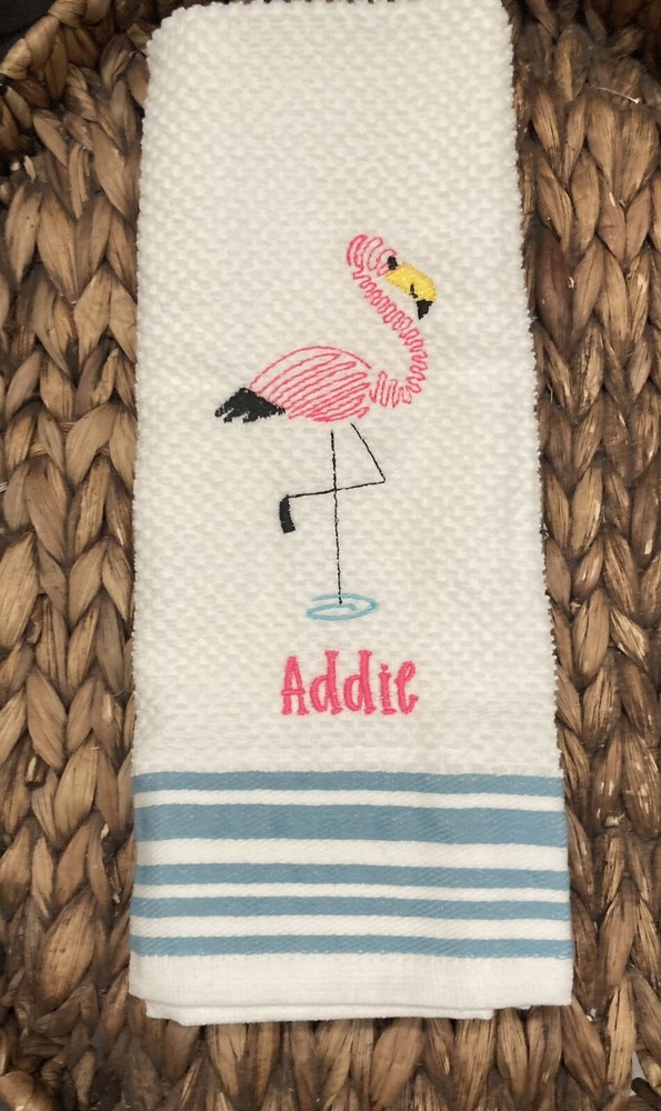 Personalized Flamingo Kitchen Towel This towel has a cute sketch design flamingo with name embroidered on it. Available in white with aqua stripe or solid white towel- note when purchasing Note name at check out Washer and lay flat to dry or hang dry for best results. From a smoke free shop Towel measures approx 26 x16