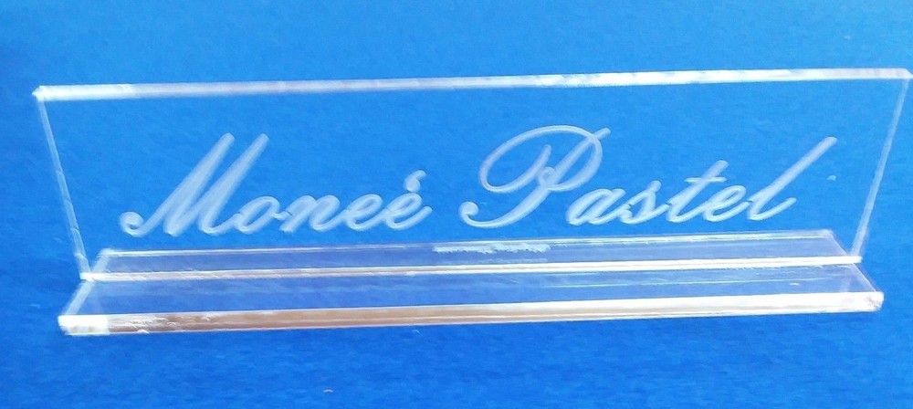 ACRYLIC GLASS DESK NAMEPLATE Custom personalized with your name and title. 8" long by 1 1/2" high. Solid .250 acrylic glass one piece construction. Custom designs available. Put your name, title and preferred Font in the "Note To Seller" section in the checkout area. We will contact you by email to confirm and make sure you get exactly what you order. Quantity Discounts available. See our other listings for more unique designs and styles.