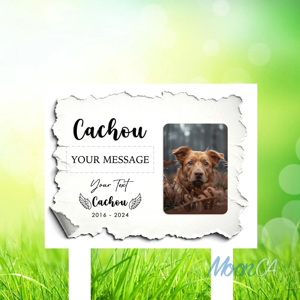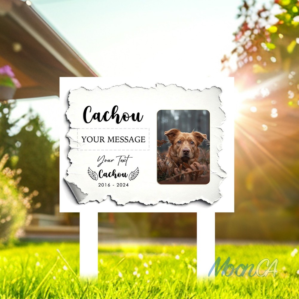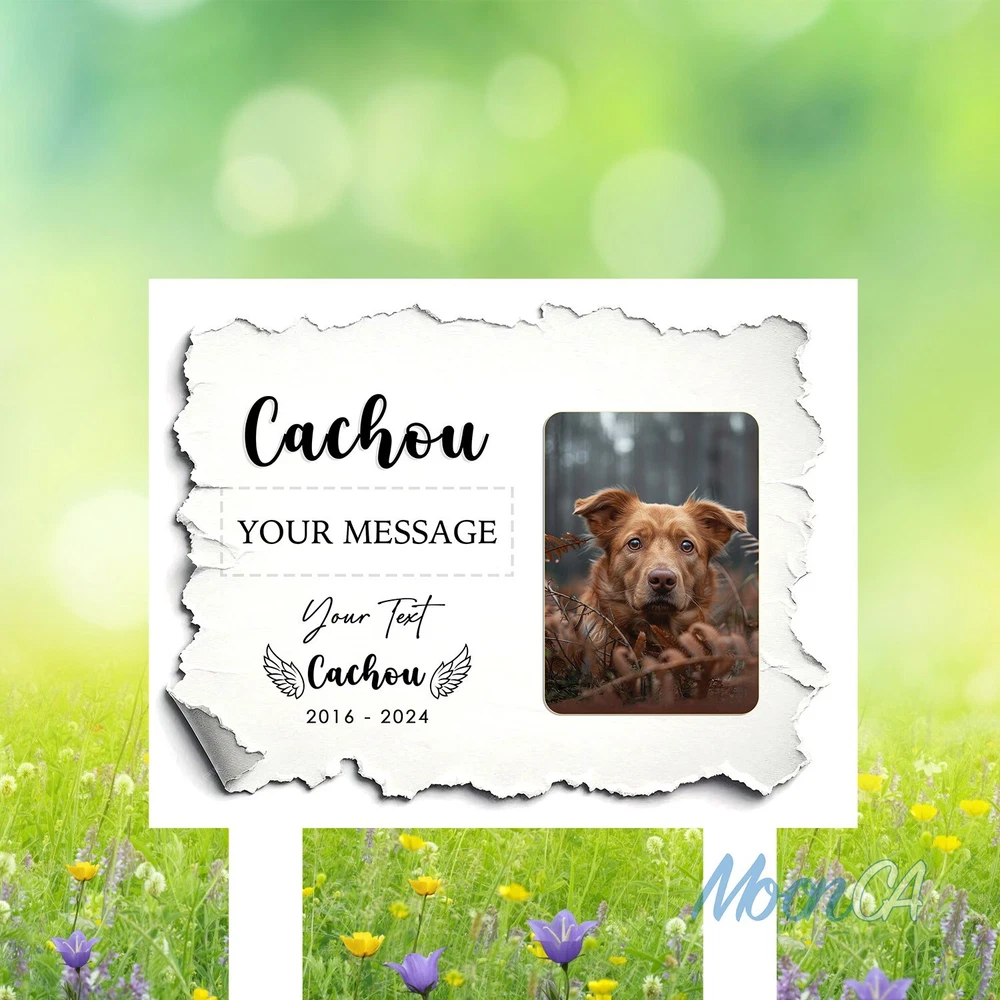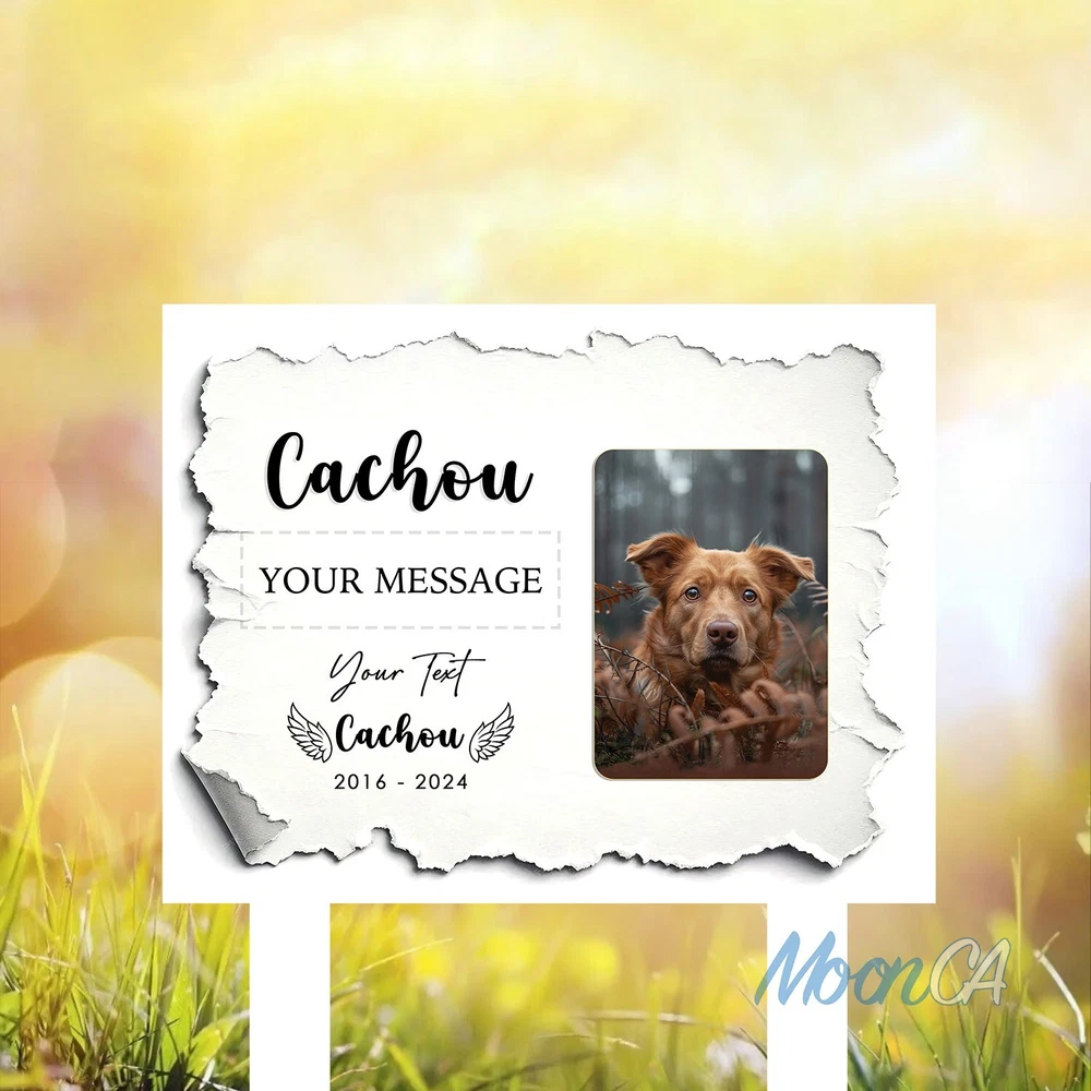 Personalized Dog Photo Grave Marker, Personalized Photo Memorial Stake, Pet Memorial Garden Sign, Custom Remembrance Plaque, Sympathy Gift Personalized Metal Art Sign – A Unique Touch for Your Home Product Introduction Add a personal, stylish flair to your space with our custom metal art signs – beautifully designed and crafted to be more than just décor. Precision laser-cut from premium steel and powder-coated for durability, this piece makes a meaningful gift or a lasting keepsake for your own home. Product Details • Material: Premium laser cut, powder coated for rust resistance. • Available Sizes: 6x6in, 8x8in, 10x10in, 12x12in, 14x14in, 16x16in, 18x18in, 24x24in • Easy to Hang: Can be mounted using wall magnets, outdoor command strips, nails, or hooks (hanging hardware not included). • Durability: Designed for both indoor and outdoor use, ensuring long-lasting quality. • Actual color may be slightly different from the image due to different monitor and light effects. • Please allow 0.5-2 cm differences due to manual measurement. The Perfect Gift for Any Occasion • A stylish accent piece ideal for decorating your home, bar, garage, foyer, living room, doors, or walls. • Thoughtfully designed to be a meaningful gift for your husband, friends, coworkers, or anyone special in your life. • Makes a standout present for weddings, housewarmings, anniversaries, birthdays, and other memorable occasions. • Whether it's a celebration or simply a gesture of love, this personalized, one-of-a-kind gift will be proudly displayed and treasured for years to come. How to Order 1.Select your desired size and style. 2.Enter your personalized text (e.g., name, message) in the provided field. 3.Proceed to payment and complete your order. If the personalization field is left blank, we will create the sign using the default text and design shown in the product photo. All custom designs will be produced exactly as entered — please double-check spelling, capitalization (UPPERCASE/lowercase), and punctuation. We are not responsible for any errors in the submitted text. Processing & Shipping • Processing time: 3–5 business days. • US Delivery time: 7–15 business days (may vary during holidays). US Average shipping time normally: 5 - 9 business days excluded production time due to personalized items. Return & Replacement Policy • As each sign is custom-made, we do not accept returns or exchanges. • Cancellations are accepted within 24 hours of purchase. • Damaged or defective items will be replaced – please contact us within 14 days of delivery with a photo of the issue. • If a mistake was made on our part, we will refund or replace the item immediately. Please give us the opportunity to make it right before leaving feedback. Important Notes • Please double-check all personalization and shipping information before checkout. • Contact us with any questions – we’re happy to help! Thank you so much for shopping with us! Cat Memorial Gifts, Dog Memorial Stake, Pet Grave Marker, Pet Memorial Stake, Pet Memorial Garden Stake, Dog Memorial Stake, Pet Sympathy Gift, Dog Loss Gift, Pet Loss Gift, Metal Pet Memorial Stake, Grave Marker Stake, Pet Memorial Marker, Dog Burial Stake