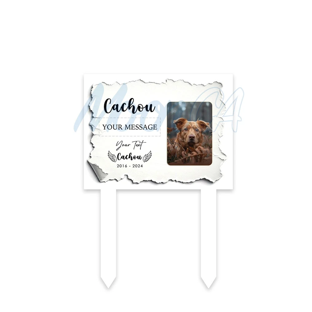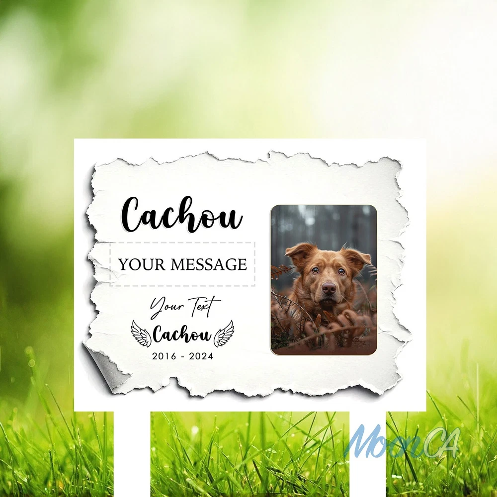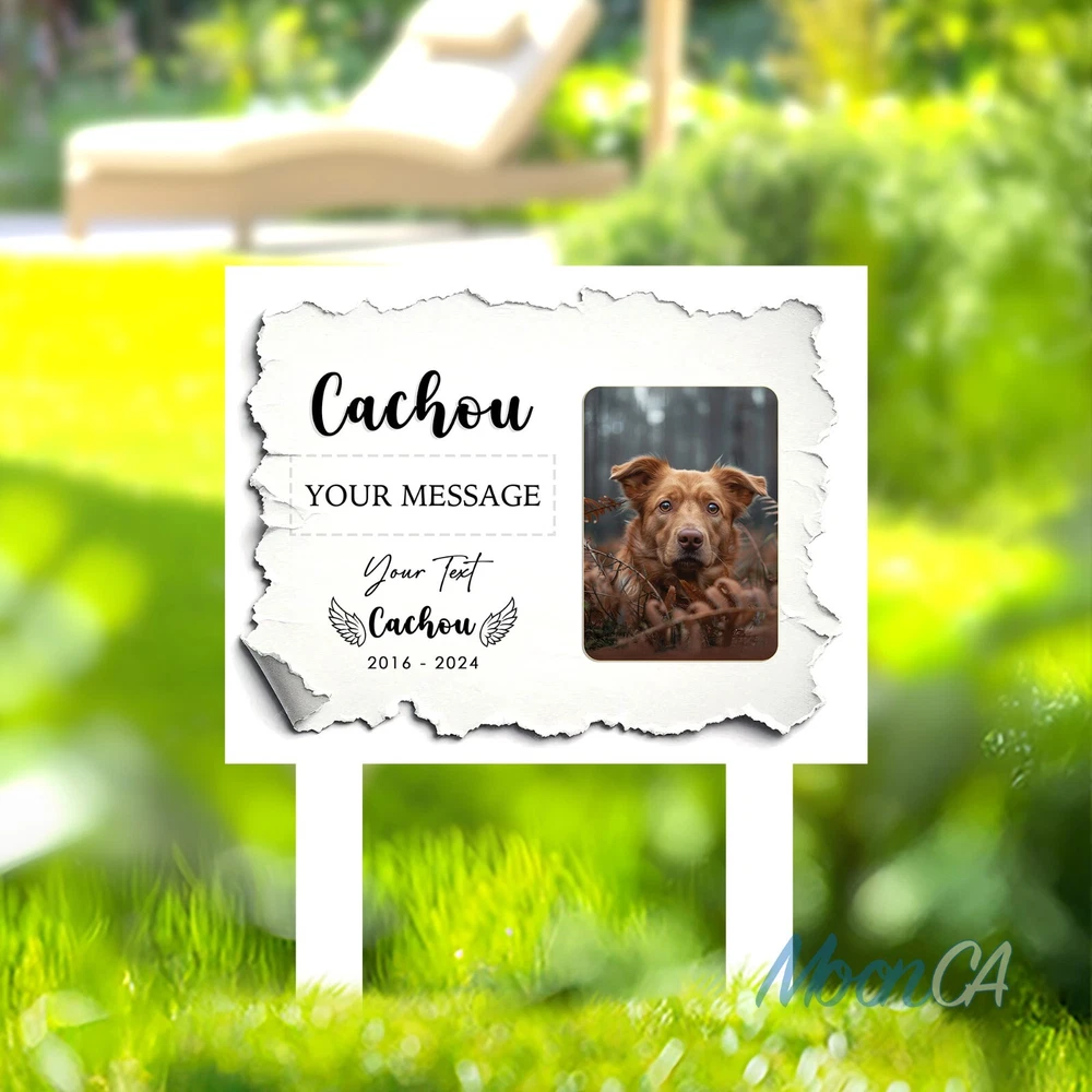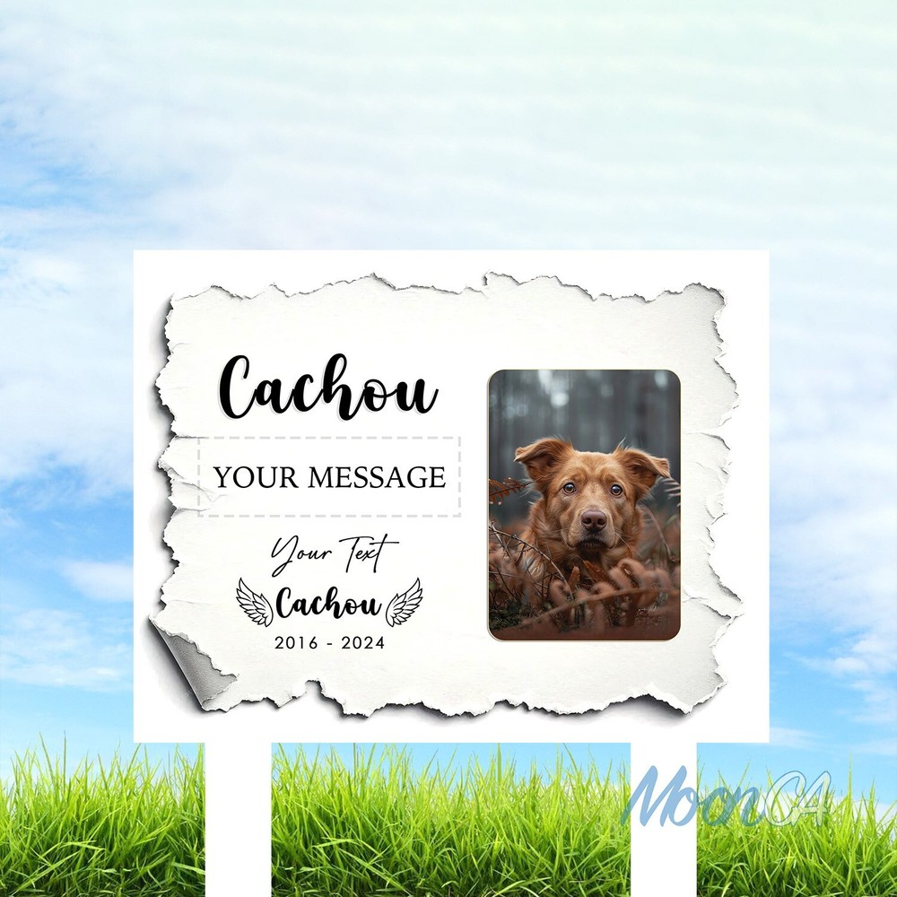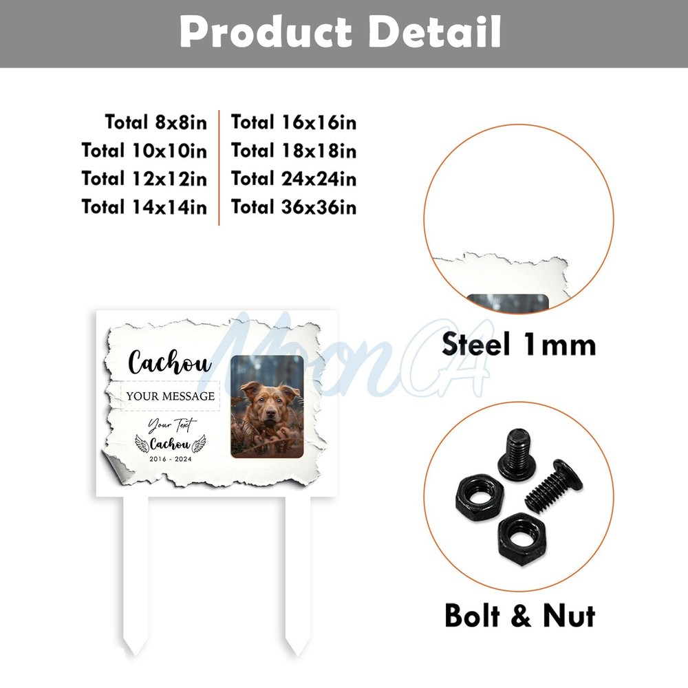 Personalized Dog Photo Grave Marker, Personalized Photo Memorial Stake, Pet Memorial Garden Sign, Custom Remembrance Plaque, Sympathy Gift Personalized Metal Art Sign – A Unique Touch for Your Home Product Introduction Add a personal, stylish flair to your space with our custom metal art signs – beautifully designed and crafted to be more than just décor. Precision laser-cut from premium steel and powder-coated for durability, this piece makes a meaningful gift or a lasting keepsake for your own home. Product Details • Material: Premium laser cut, powder coated for rust resistance. • Available Sizes: 6x6in, 8x8in, 10x10in, 12x12in, 14x14in, 16x16in, 18x18in, 24x24in • Easy to Hang: Can be mounted using wall magnets, outdoor command strips, nails, or hooks (hanging hardware not included). • Durability: Designed for both indoor and outdoor use, ensuring long-lasting quality. • Actual color may be slightly different from the image due to different monitor and light effects. • Please allow 0.5-2 cm differences due to manual measurement. The Perfect Gift for Any Occasion • A stylish accent piece ideal for decorating your home, bar, garage, foyer, living room, doors, or walls. • Thoughtfully designed to be a meaningful gift for your husband, friends, coworkers, or anyone special in your life. • Makes a standout present for weddings, housewarmings, anniversaries, birthdays, and other memorable occasions. • Whether it's a celebration or simply a gesture of love, this personalized, one-of-a-kind gift will be proudly displayed and treasured for years to come. How to Order 1.Select your desired size and style. 2.Enter your personalized text (e.g., name, message) in the provided field. 3.Proceed to payment and complete your order. If the personalization field is left blank, we will create the sign using the default text and design shown in the product photo. All custom designs will be produced exactly as entered — please double-check spelling, capitalization (UPPERCASE/lowercase), and punctuation. We are not responsible for any errors in the submitted text. Processing & Shipping • Processing time: 3–5 business days. • US Delivery time: 7–15 business days (may vary during holidays). US Average shipping time normally: 5 - 9 business days excluded production time due to personalized items. Return & Replacement Policy • As each sign is custom-made, we do not accept returns or exchanges. • Cancellations are accepted within 24 hours of purchase. • Damaged or defective items will be replaced – please contact us within 14 days of delivery with a photo of the issue. • If a mistake was made on our part, we will refund or replace the item immediately. Please give us the opportunity to make it right before leaving feedback. Important Notes • Please double-check all personalization and shipping information before checkout. • Contact us with any questions – we’re happy to help! Thank you so much for shopping with us! Cat Memorial Gifts, Dog Memorial Stake, Pet Grave Marker, Pet Memorial Stake, Pet Memorial Garden Stake, Dog Memorial Stake, Pet Sympathy Gift, Dog Loss Gift, Pet Loss Gift, Metal Pet Memorial Stake, Grave Marker Stake, Pet Memorial Marker, Dog Burial Stake