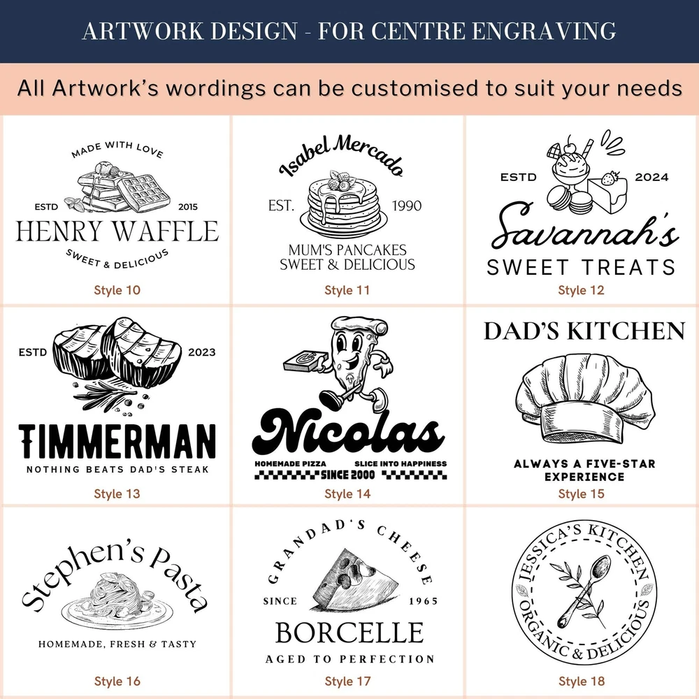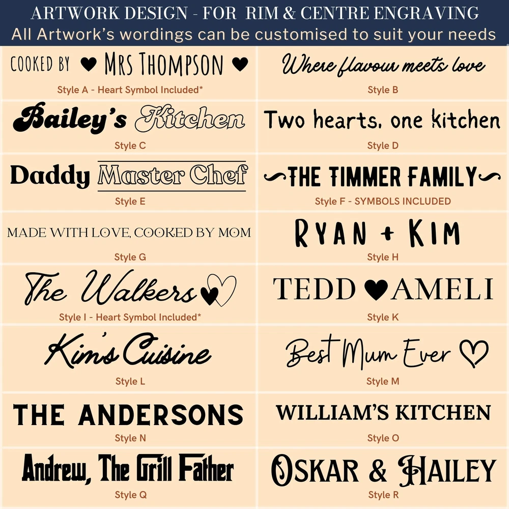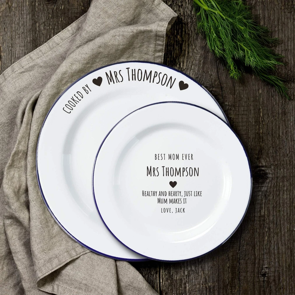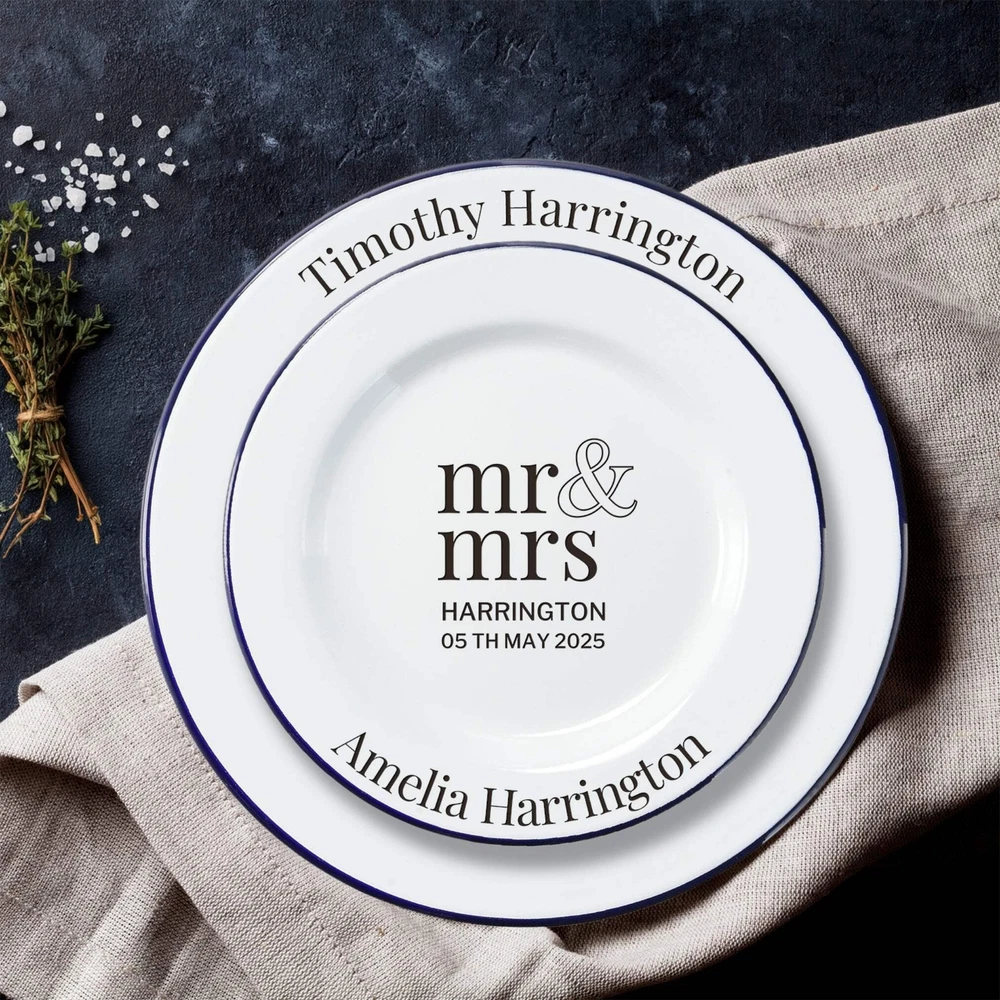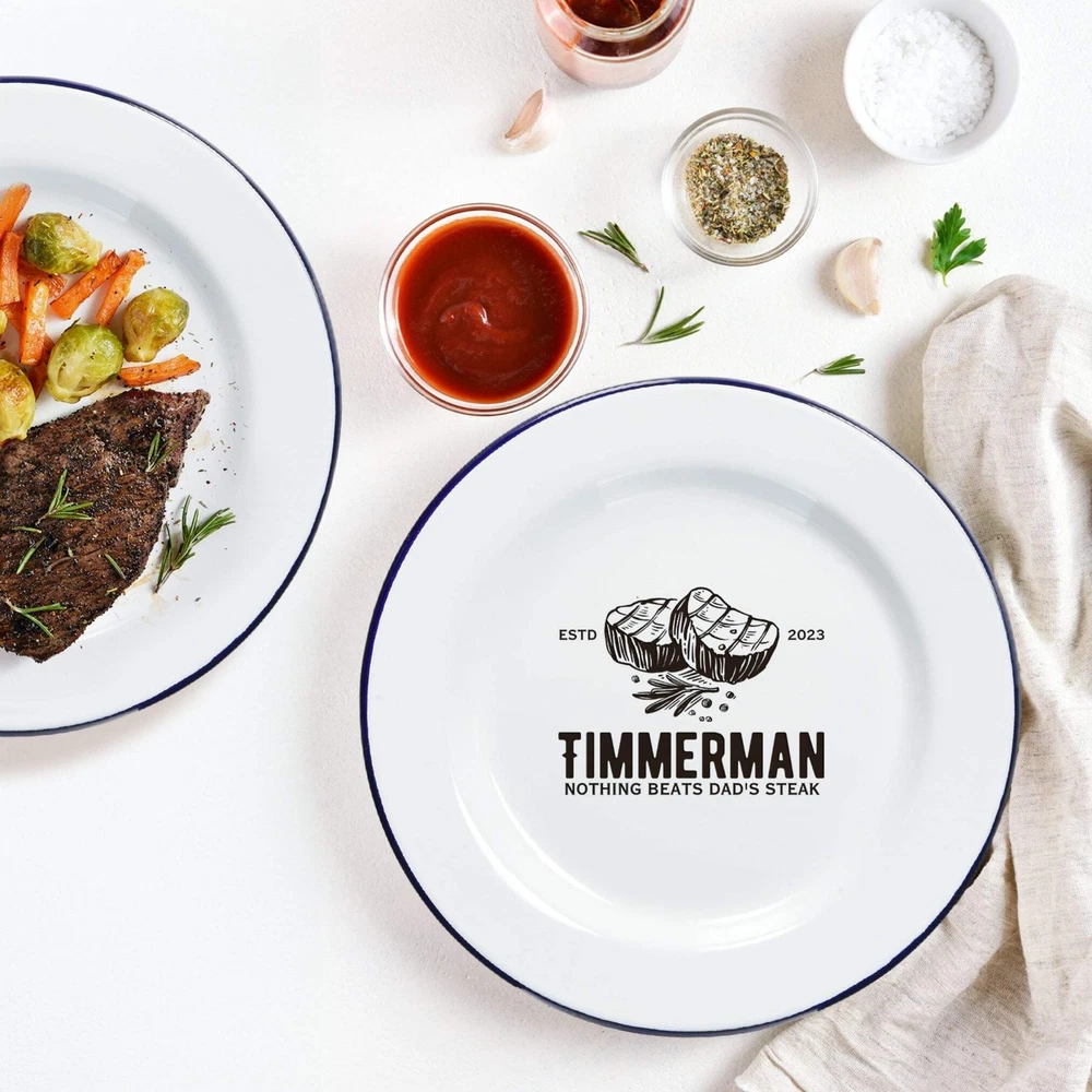 Custom Engraved Enamel Camping Retro Plate Custom Engraved Enamel Camping Retro Plate DETAILS ★ Discover the Perfect Enamel Plates: Ideal for both indoor and outdoor dining: Enjoy your favourite meals with our distinctive Enamel Plates. Whether it's a personalised plate that brings a traditional style to your table or an adventurer's enamel plate perfect for camping and picnics, these plates are a must-have. They make a wonderful gift for the adventurer in the family or any friend who loves the outdoors! Perfect for hiking trips, camping weekends, lazy beach days, and picnics, these plates add a unique touch to your table setting. ★ Retro Charm and Timeless Design - Our Enamel Plates feature a classic blue and white finish reminiscent of American diners, adding a nostalgic touch that guests will love. - The retro blue and white enamel design not only enhances the aesthetic appeal but also makes a statement on any table. The blue rim creates a unique look and makes it easy for people to identify the edge of the plate, ideal for care homes or those with vision difficulties. ★ Perfect for Any Dessert & Food: Ideal for both indoor and outdoor dining, these plates available in two sizes, 24.5 cm and 30 cm, provide a stylish means of serving cold meats, steak, sandwiches, BBQ, cheese, pasta, puddings, desserts, homemade cakes, , pancakes, waffles, sweet treats, breakfast, and more. ★ Timeless Design: The retro blue and white enamel design not only enhances aesthetic appeal but also makes a statement on any table, elevating the presentation of your food. The blue rim creates a unique look and makes it easy for people to identify the edge of the plate, ideal for care homes or those with vision difficulties. ★ Durable and Long-Lasting: Crafted from heavy-duty stainless steel and covered with an ultra-durable, fuséd-glass coating, these plates develop a unique character over time. The enamel coating is heat and chemical resistant, making these plates highly versatile. They are safe for use in the oven and microwave for reheating food and can be easily cleaned in the dishwasher. The stainless-steel interior ensures long-lasting durability, even in customer-facing environments. ★ Exceptional Versatility: The enamel coating on these plates is both heat and chemical resistant, allowing you to serve homemade ice cream directly from the freezer or bake a delicious apple crumble in the oven. These bowls can handle it all. ★ Personalisation Options: Personalise your Enamel Kitchenware with initials, a name, or a custom logo to create a unique, personalised piece that reflects your style and identity. They make exceptional gifts for kids, Father’s Day, Mother’s Day, teachers, wedding favours, birthdays, housewarmings, couples, and any occasion where a thoughtful touch is appreciated. Choose from a wide range of designs to find the perfect match. ★ Ideal for Various Settings: Designed to withstand the rigours of everyday use, cleaning, and storage, our Enamel Tableware are equally at home in commercial settings like restaurants, cafes, and hotels. Their durability ensures they maintain a fresh appearance even with frequent use. It can be safely uséd it in the oven and microwave when reheating drinks. ★ Corporate Gifting and Promotions: Enhance your business relationships by personalising Enamel Plates with client names, monograms, or company logos. They make memorable closing gifts or promotional items that leave a lasting impression. ★ Stylish: Choose from a wide range of design options to personalise your plate, ensuring it reflects your unique style. ★ Safe: BPA-free and crafted with quality materials, our enamel tableware are designed with your safety and satisfaction in mind. ★ Care Instructions: - Our enamel tableware can be washed in the dishwasher, ensuring quick and convenient cleaning. The classic retro blue and white enamel tableware gains a unique character with repeated use, as chips and imperfections contribute to its individual charm. - To maintain a flawless appearance, avoid using the dishwasher. Clean gently with non-abrasive cleaners and avoid scourers to preserve the enamel finish. SPECIFICATIONS Dimensions : Available in 2 Sizes: - Medium: H x D: 25 x 245 mm ( 0.98" x 9.65" ) - Large: H x D: 25 x 300 mm ( 0.98" x 11.81" ) Material: Enamel Steel, Fuséd Glass Coating Technique: Laser Engraved. Personalise any design with names, dates, templates, logos, or images. Our high-quality, long-lasting laser engraving surpasses vinyl stickers, ensuring durability and a professional finish. Note: Chips and imperfections are part of products' individual look. HOW TO ORDER 1. Choose your preferred size: Select whether you want Medium or Large size 2. Choose your Engraving Side: Select whether you want engraving on the top or bottom rim, the centre of the plate, or both. 3. Type in Engraving Style and Order: Specify the engraving style and the exact text you want engraved based on our provided Design Template Options. You can add any additional instructions in brackets (). Please refer to Style #A - Style #R for the Plate Rim's Engraving Example: - Top Rim: Style #O: Timothy Harrington - Bottom Rim: Style #O: Amelia Harrington - Centre: Style #9: mr&mrs Harrington, 05th May 2025 ▸If you want to use your own logo, please attach/ send us your file once you finish . Please note to attach the highest resolution file as possible to avoid quality issues Not all files are scanned prior to manufacturing, if you're not sure, please send us an email after placing the order to confirm if the file is of an acceptable quality. ▸You can combine or pick any font, icon, style, etc between our provided designs, or choose not to include a date, title or icon for example. All artwork based on our available design is free of charge. ▸If you don't like any of our template and want to create your own bespoke artwork design, please feel free to contact us with any questions you may have,