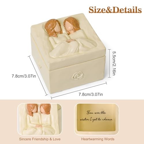 Return Policy Fast Delivery Trusted seller Personalized Jewelry Box, Friendship Keepsake Best Friend Birthday Gifts for Women, Sister Gifts Sculpted Hand Painted Anniversary Christmas Memory Box, Decorative Boxes For Home Decor Product Description Warm Sisters Friendship: This personalized resin jewelry box depicts the warm scene of a pair of sisters looking at each other cross legged and holding hands, which perfectly shows the deep feelings and intimacy between sisters Sisters Gifts from Sister: The inside of the memory box is engraved with "Your are the sister I got to choose", which boldly and firmly expresses your love and friendship for friends or sisters. This is a very meaningful gift, suitable for anyone who values sisters friendship Best Friend Birthday Gifts for Women: True friends can understand your joys and sorrows, always standing by your side, accompanying and supporting each other. Even when you are apart, your hearts still rely on each other. Perfect for close friends or sisters on their special days, as birthday gifts, graduation gifts, wedding gifts, Christmas gifts,etc Combining Practicality and Aesthetics: This keepsake box is made of high-quality resin material, hand carved and painted, with lifelike statue details. Each piece is a unique piece of art suitable for home decoration or collectibles. It can also be used as a jewelry box or small item storage box Friendship Gifts Express Love and Emotions: This hand-painted resin keepsake box, measuring 3.07x3.07x2.76 inches, is carefully packaged in an elegant box and can be gifted at any time. If you and your mother or daughter get along like sisters, this decorative box is also makes a great Mother's Day or Birthday gift to express your love Shipping Returns Payment Shipping Shipping is FREE to all addresses other than APO/PO boxes in the lower 48 states. All our stock ships from US-based warehouses. Shipped via USPS or UPS (depending on location and package weight) Unless stated otherwise, all orders will ship within 24-72 hours of your payment being processed. Check our feedback to see the great reviews of FAST shipping we offer. Returns Seller does not accept returns Payment We currently accept payment via eBay managed payments only. Once payment is cleared, we will dispatch your shipment within 1-3 business days. Please refer to the "Shipping" tab for more information regarding shipping speed to your destination.