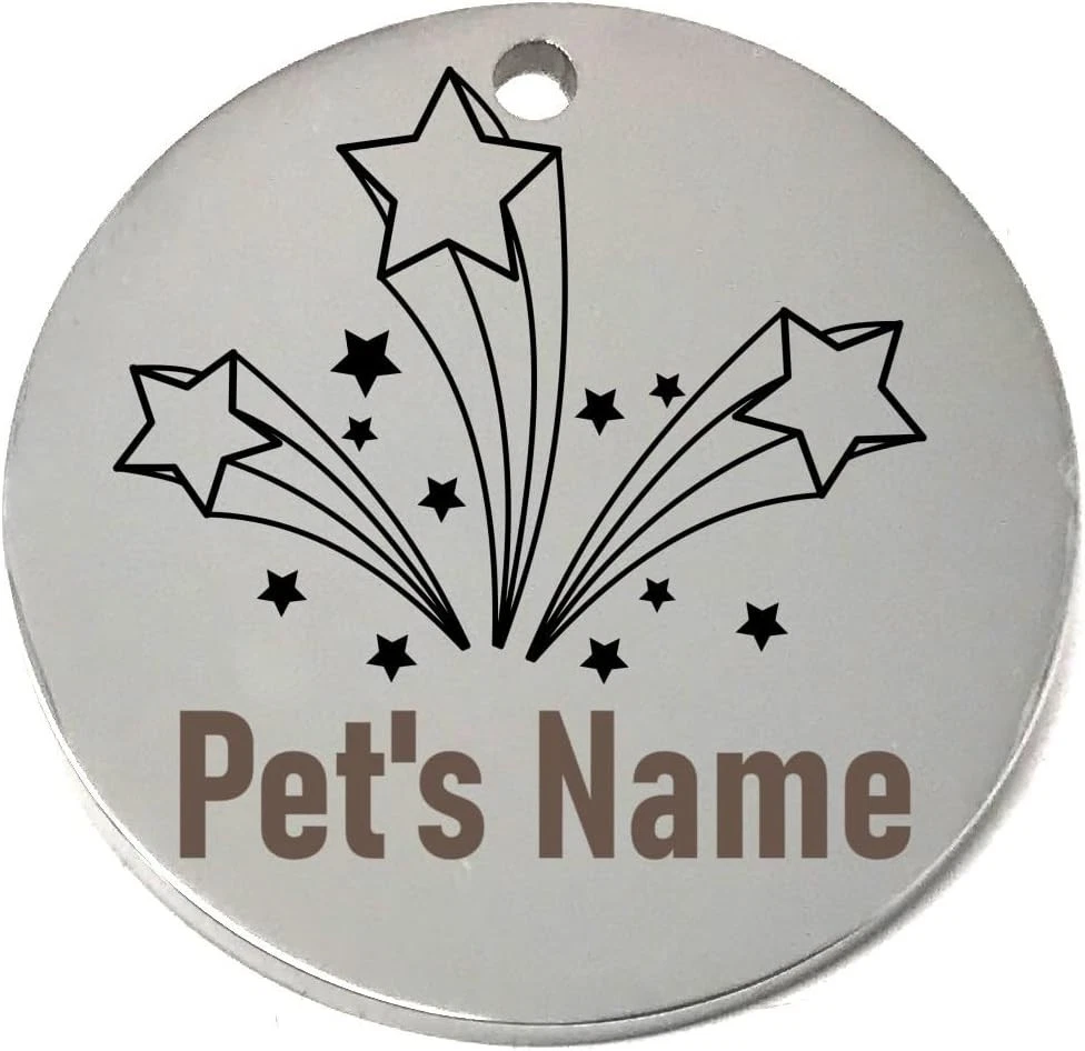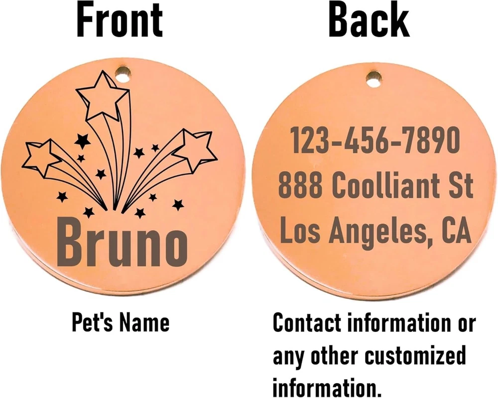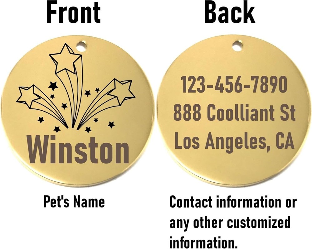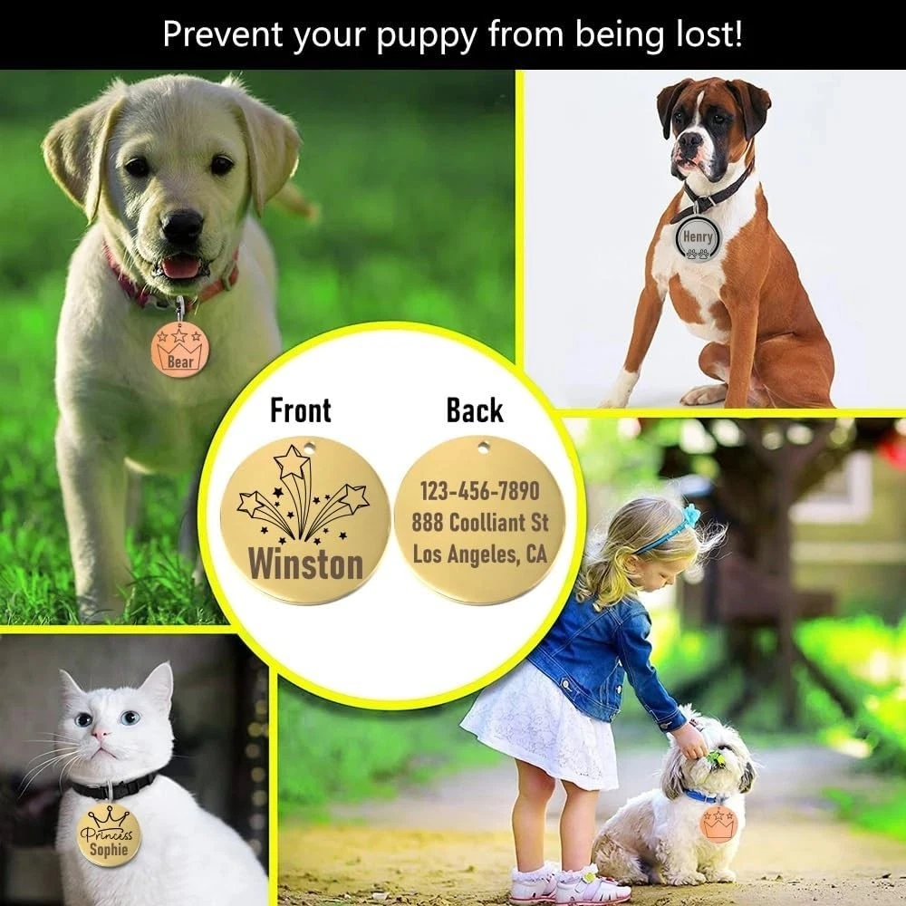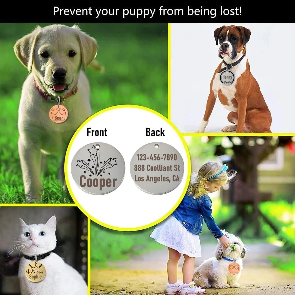 American seller - ships from California. Personalize your own pet ID tag with laser engraving. You can select from front, back, or both sides for the engraving. Front side - maximum 12 characters Back side - maximum 70 characters and 5 lines Emojis are not allowed. Fewer characters will be in a bigger font, while more characters will be in a smaller font. Please double-check your spelling. Please use the following format: Font: #1 Arial(please refer to the image) Front side: Your pet's name Back side: Line 1: 123 Address St Line 2: City, State Zipcode Line 3: (123) 456-7890 Line 4: n/a Line 5: n/a Package Includes : 1 x Personalized Pet ID Tag with a small split ring Material: Stainless Steel(mirror polished) Weight: Small(5 grams); Large(7 grams) Dimension: Small(1 inch/2.5cm); Large( 1.18 inches/3cm) Color: Please choose Rose Gold, Gold, or Silver Unique design, excellent quality - Our Dog ID tags are made of stainless steel, with your pet's name on the front side and contact information engraved on the back side. They are stylish and durable. Keep your pet safe and stylish with our stainless steel personalized pet ID tag! This polished pet name tag can be custom engraved with your pet's information on both sides. Its polished finish adds a touch of elegance, while its light weight won't bother your pet's collar. Choose a unique design that matches your pet's personality! Size Guide: The personalized pet tags are available in both large and small sizes. Large tags measure approximately 1.2 inches in diameter and are recommended for large and medium-sized dogs. Small tags measure approximately 1 inch and are recommended for cats and smaller dog breeds. Custom deep laser engraving - Utilizing deep fiber laser etching to permanently mark the tag. The engraving is deep, clear, and attractive on a polished mirror-finish surface, making it durable and easy to read. Your pet's essential information will not wear off over time. All pet ID tags come with a free small split ring for easy attachment to your pet's collar or keychain. This helps prevent your pets from losing their ID tags. This personalized pet name tag can be used on pet carriers, key chains, backpacks, and more. Custom laser engraved name tags are a cute and thoughtful way to surprise your friends and family. Due to differences in lighting and screen settings, the color of the item may appear slightly different from what is shown in the pictures.